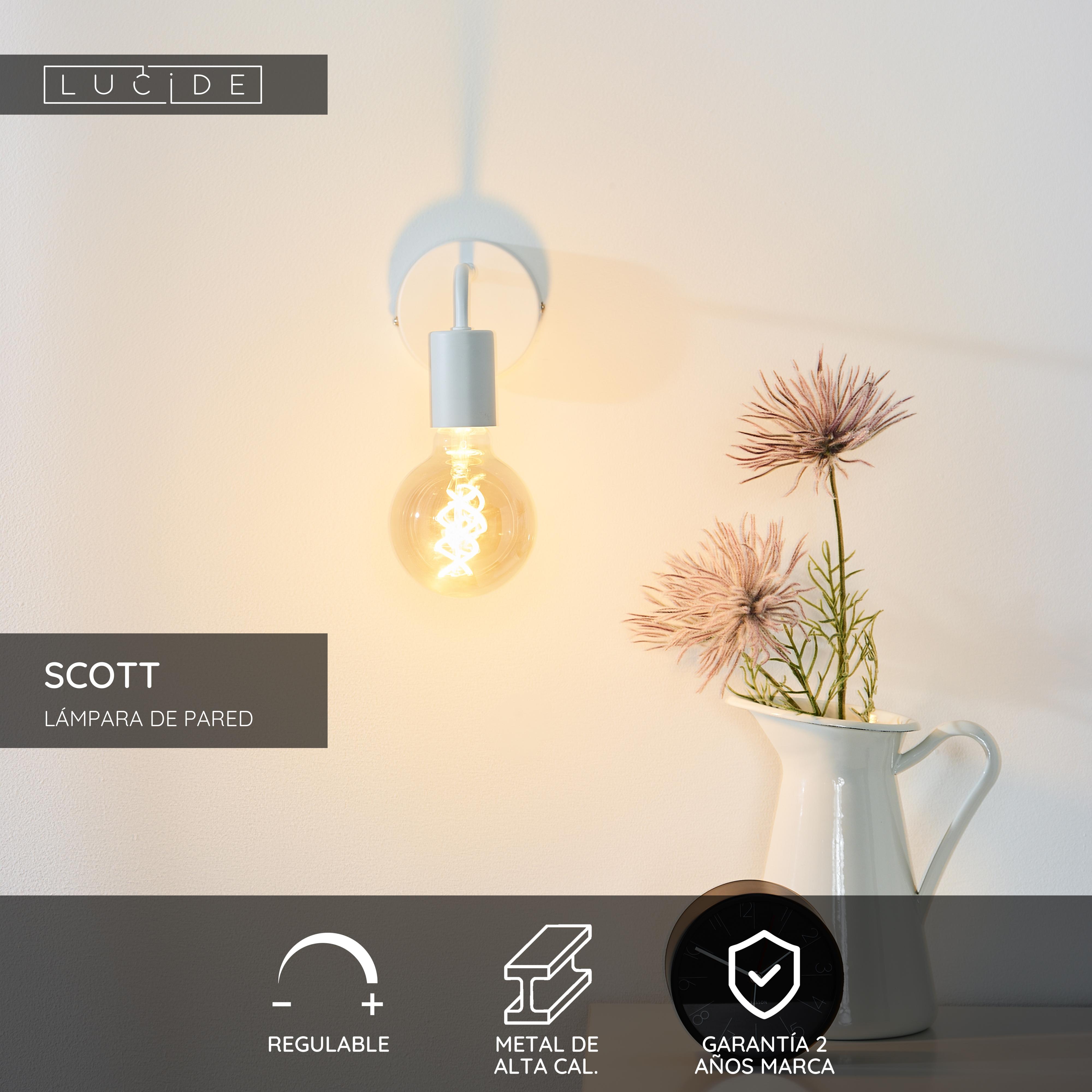 ¿Por qué complicar a veces tanto una lámpara de pared cuando la pureza puede ser tan hermosa? Scott es un aplique que destaca por su sencillez. Su hermoso acabado en metal lacado mate le proporciona un aspecto sencillo, pero llamativo. Especialmente si lo combinas con otras unidades colocadas en línea. Por ejemplo, para aportar luz ambiental extra a un recibidor. O como iluminación sutil en una habitación pequeña. Instales donde instales este aplique de pared, ponle siempre una bombilla de filamento led. Así conseguirás crear con Scott una mayor atmósfera luminosa.