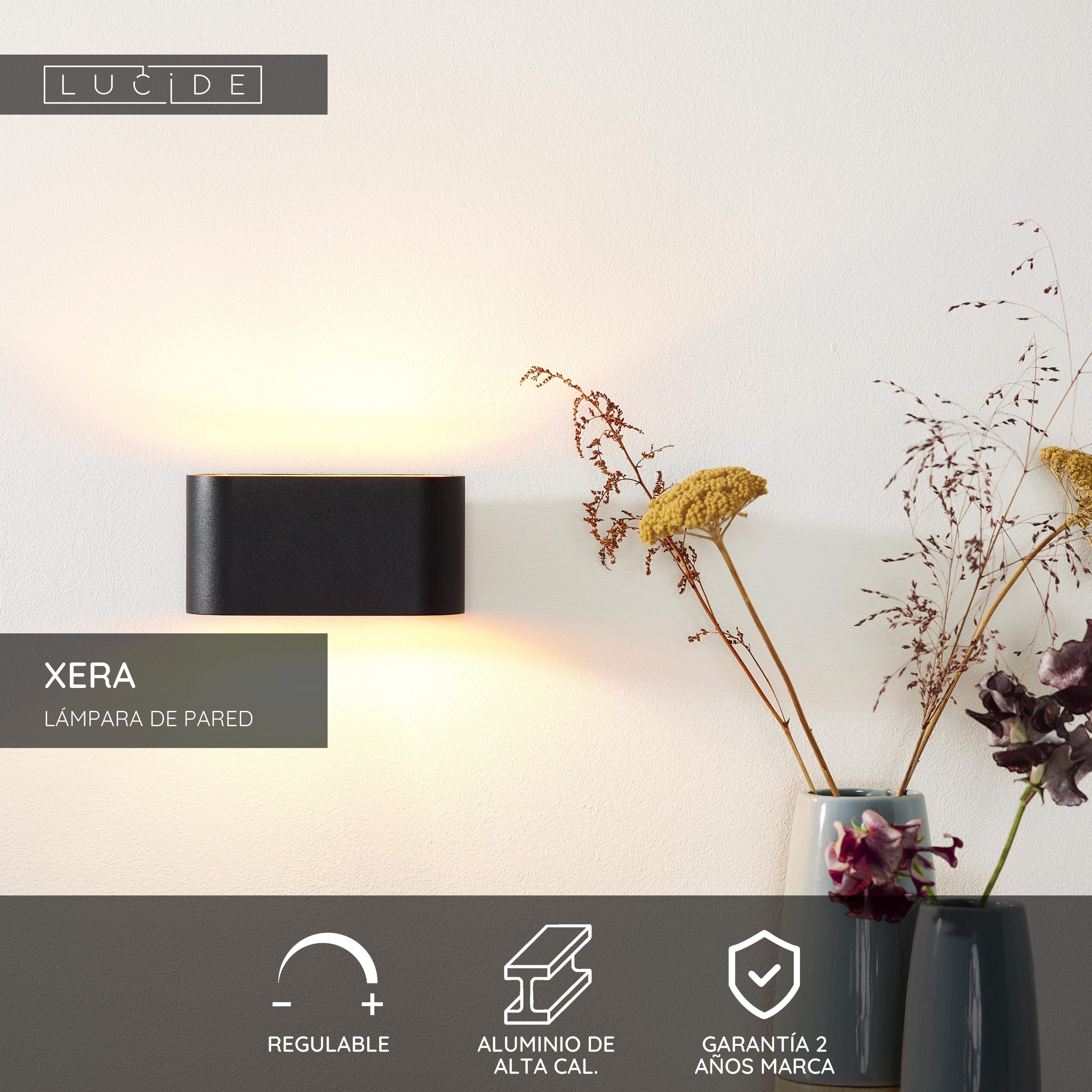 ¿Buscas un accesorio de diseño único para crear luz ambiental en una sala de estar, recibidor o dormitorio? El aplique de pared Xera hará realidad tus deseos. Desde su lujoso interior dorado, la luz refulge con un brillo extremadamente agradable y cálido. Al mismo tiempo, el diseño exterior en color negro le da a la luminaria un aspecto moderno e incluso industrial. Las anchas aberturas de Xera por arriba y por abajo facilitan una distribución de la luz amplia y generosa. Es ideal para iluminar una gran pared.