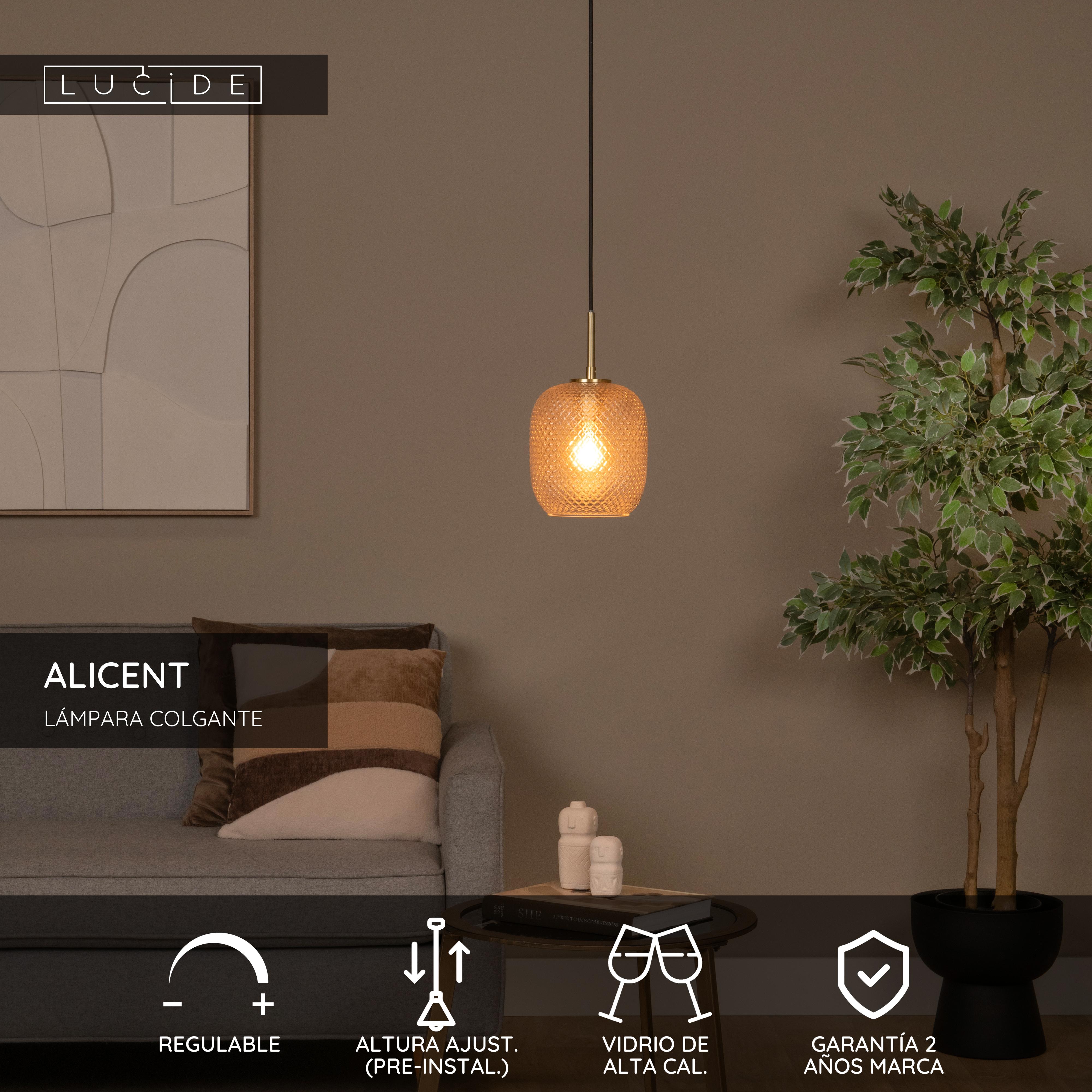 Alicent: es un nombre antiguo y apreciado que le aporta carácter a esta lámpara colgante de estilo vintage. El cristal redondeado de alta calidad de la pantalla crea un espectáculo de luz y color que resulta sensacional y sencillo a la vez. Vista desde lejos, la lámpara de techo parece evocar atmósferas orientales. Además, esta luminaria de bajo consumo es muy fácil de conectar a un regulador, así podrás elegir la intensidad de su luz para crear la atmósfera adecuada para ti y tus invitados. El diseño de Alicent combina perfectamente con muchos tipos de interiores. Desde el estilo moderno al clásico, pasando por el escandinavo y el rústico. Es regulable en altura, por lo que se puede adaptar fácilmente a cada espacio.