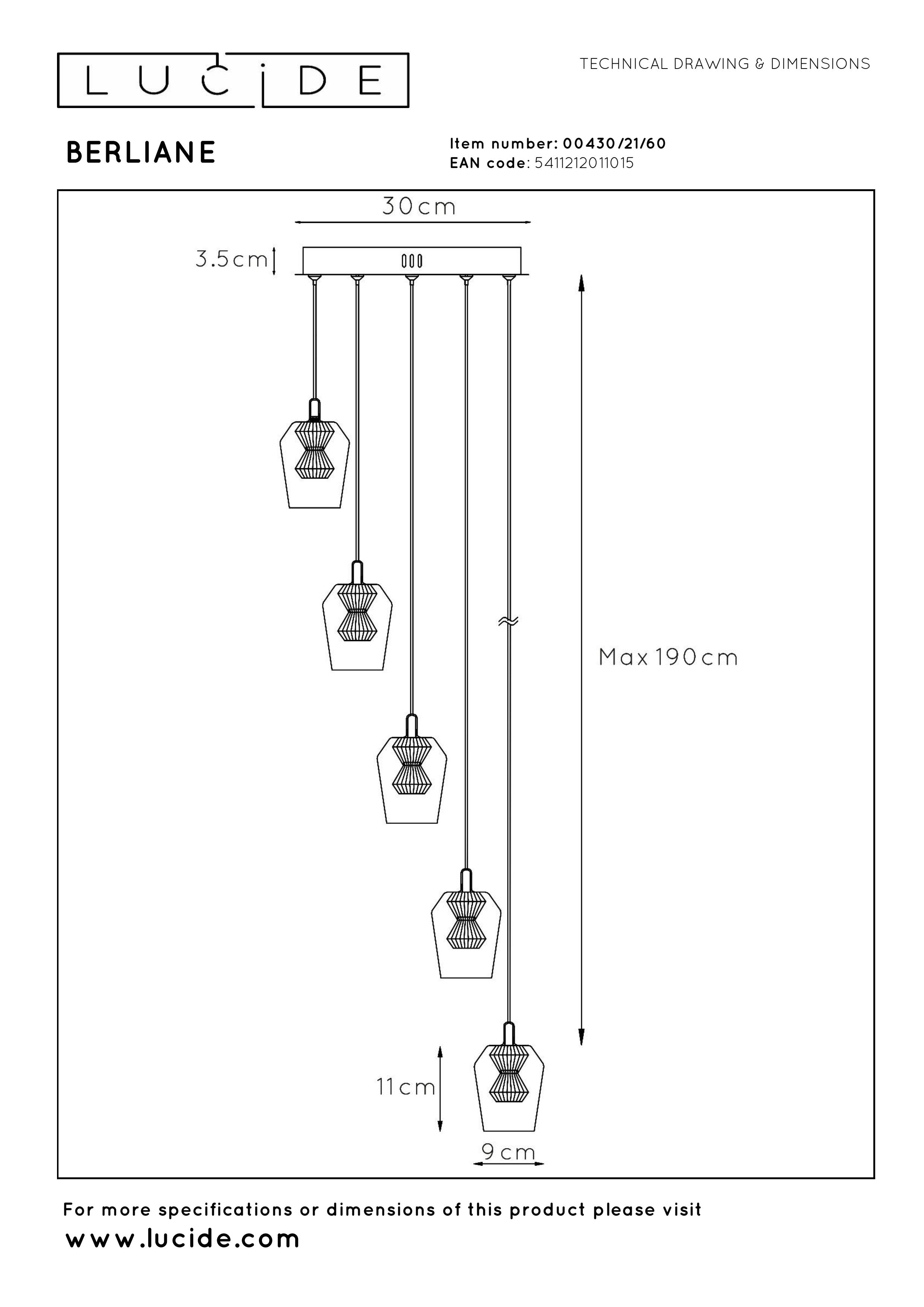 Lucide BERLIANE - Lámpara colgante - Ø 34 cm - LED Regul. - 5x4W 2700K - Con módulo LED reemplazable - Transparente | Essential
