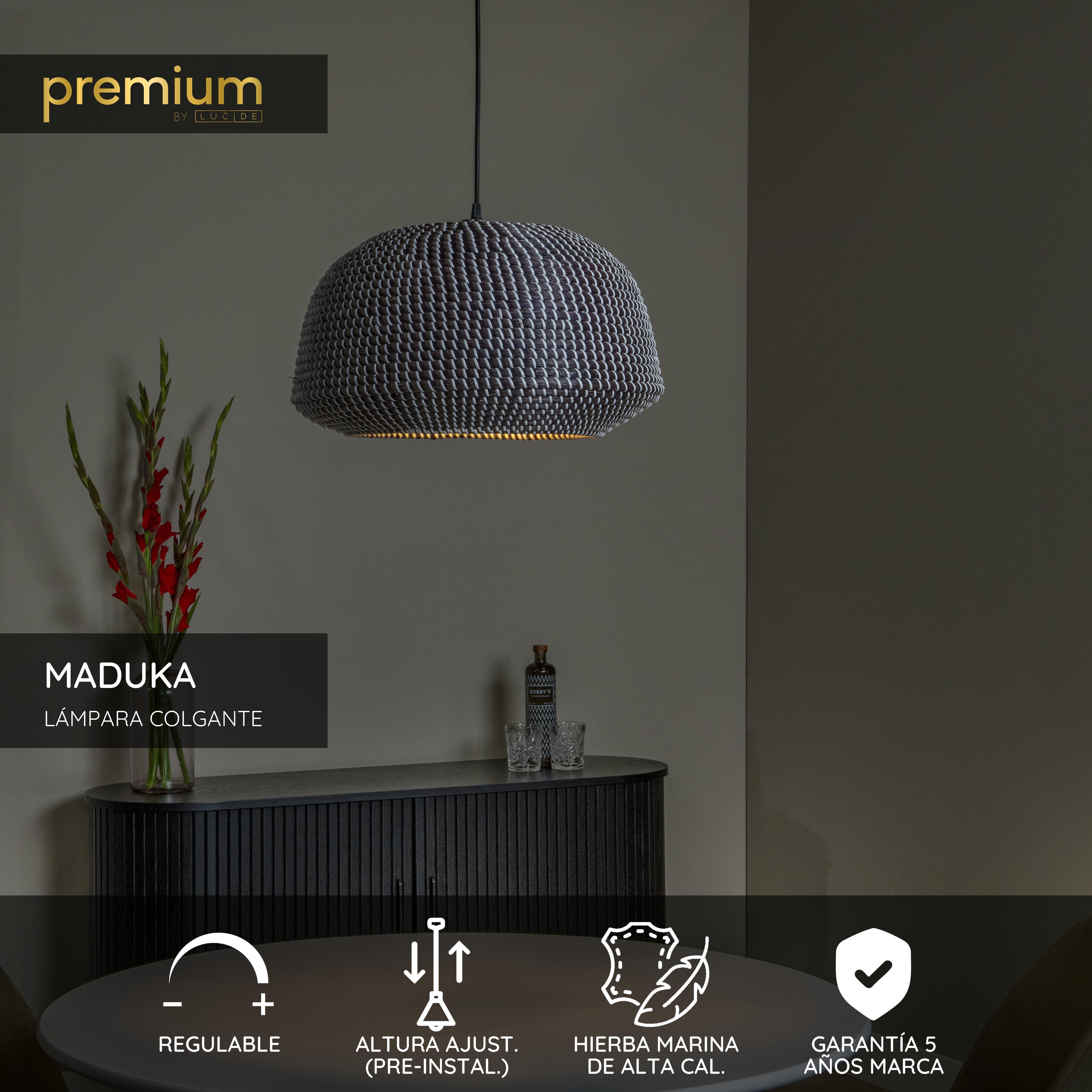 Si quiere renovar su comedor con una lámpara colgante que le aporte un toque de personalidad, Maduka es la solución. Esta lámpara redonda está hecha de hierba marina y aporta un toque de sostenibilidad a su hogar. Es el complemento perfecto para un interior cálido lleno de tonos terrosos y naturales. Maduka es ideal para crear ambiente en la mesa del comedor, pero también queda genial en un acogedor salón decorado con materiales suaves. La altura de la lámpara puede ajustarse hasta un máximo de aproximadamente 127 centímetros. Para sacarle todo el partido a Maduka, puede utilizar un regulador de intensidad externo y una fuente de luz LED.