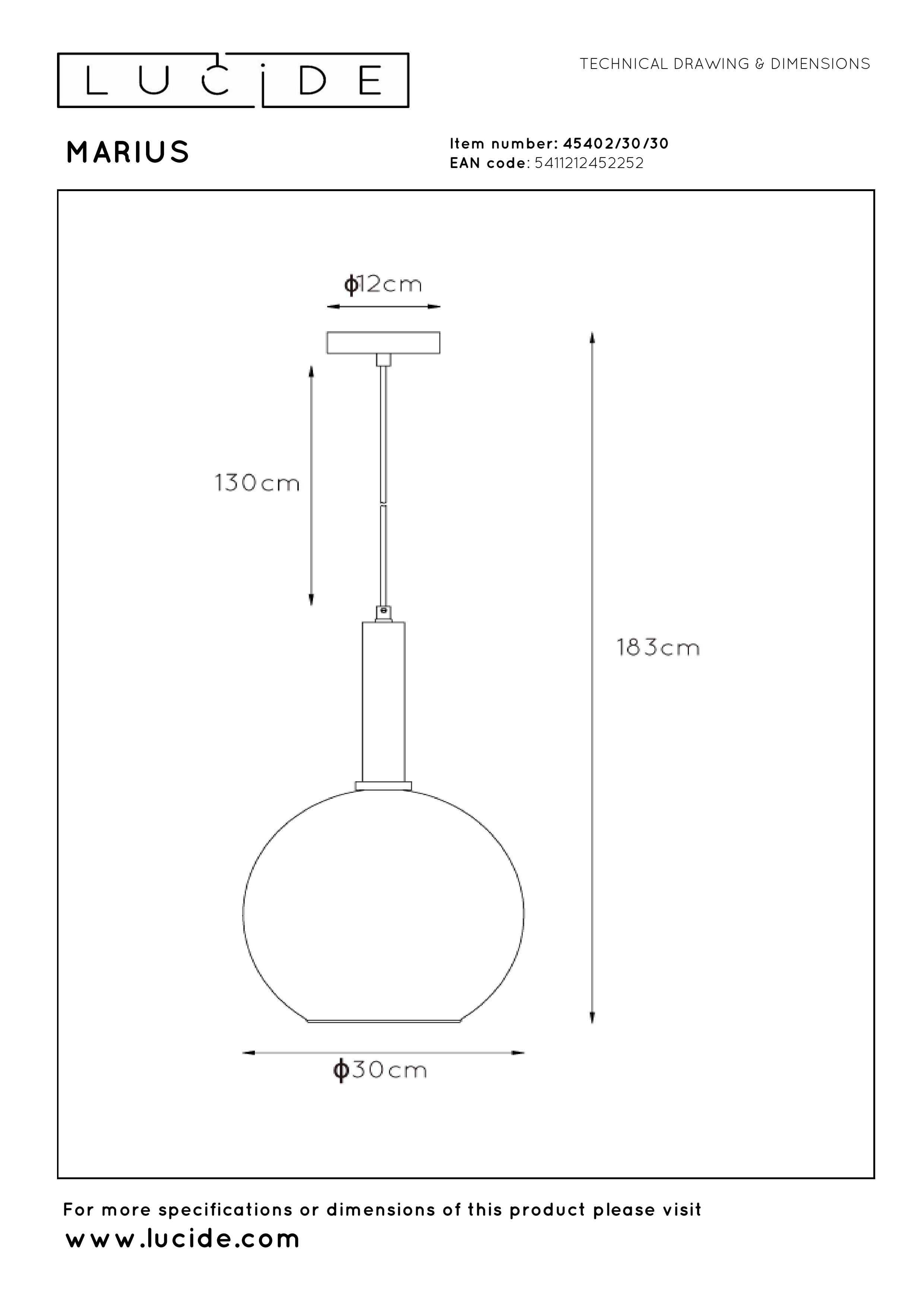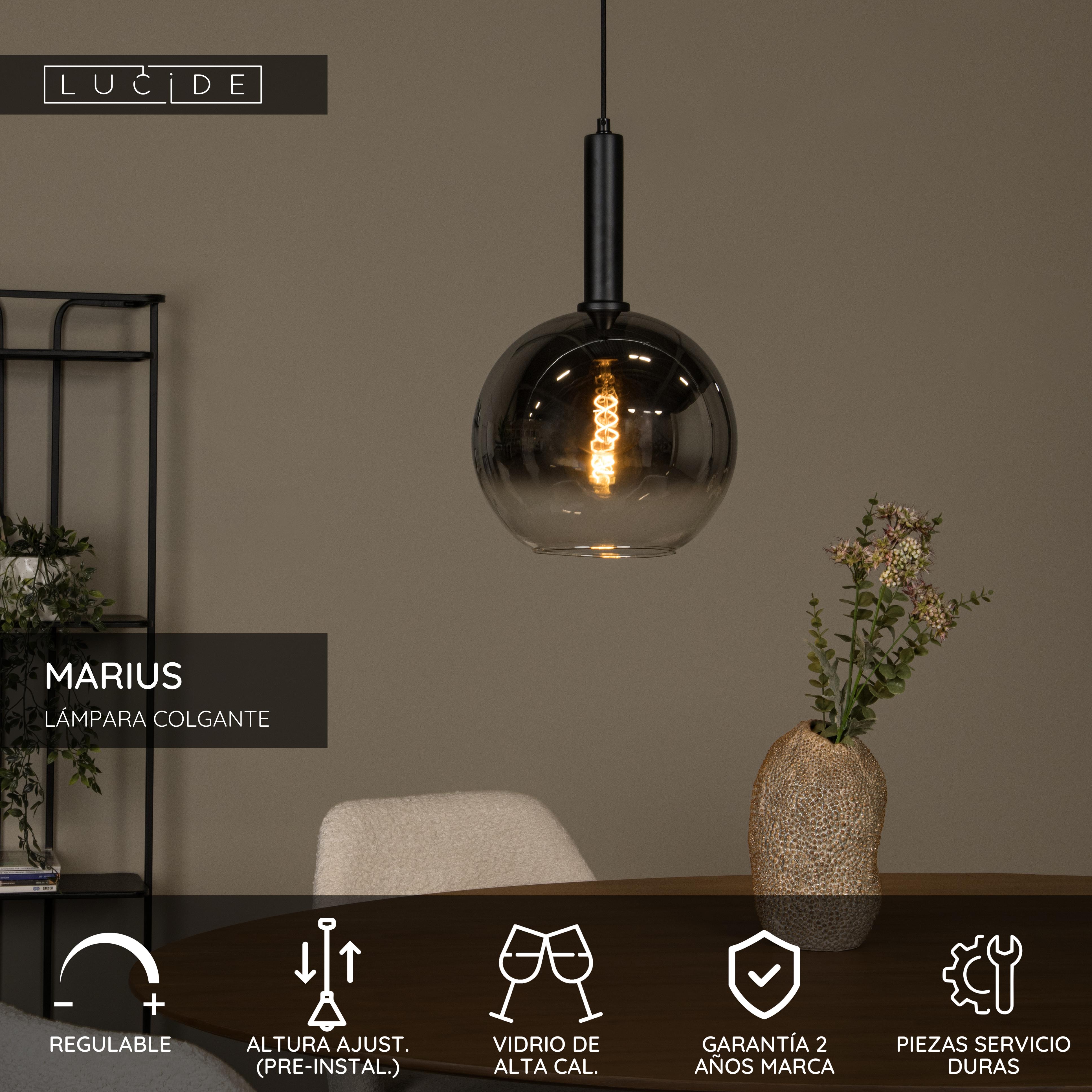 Una iluminación grande se merece una atención. Y esta es la que Marius atrae hacia sí cómodamente. Esta lámpara de vidrio de gran calidad en un modelo ahumado es el hogar ideal para una bombilla de filamento LED original. Marius encuentra su camino hacia tu salón, comedor o salón. Hasta encima de una isla de cocina se encuentra a gusto. La luz se concentra en una bola de 30 cm de diámetro, que cuelga de un delgado cable. El modelo Marius se puede extender hasta una altura máxima de 183 cm.