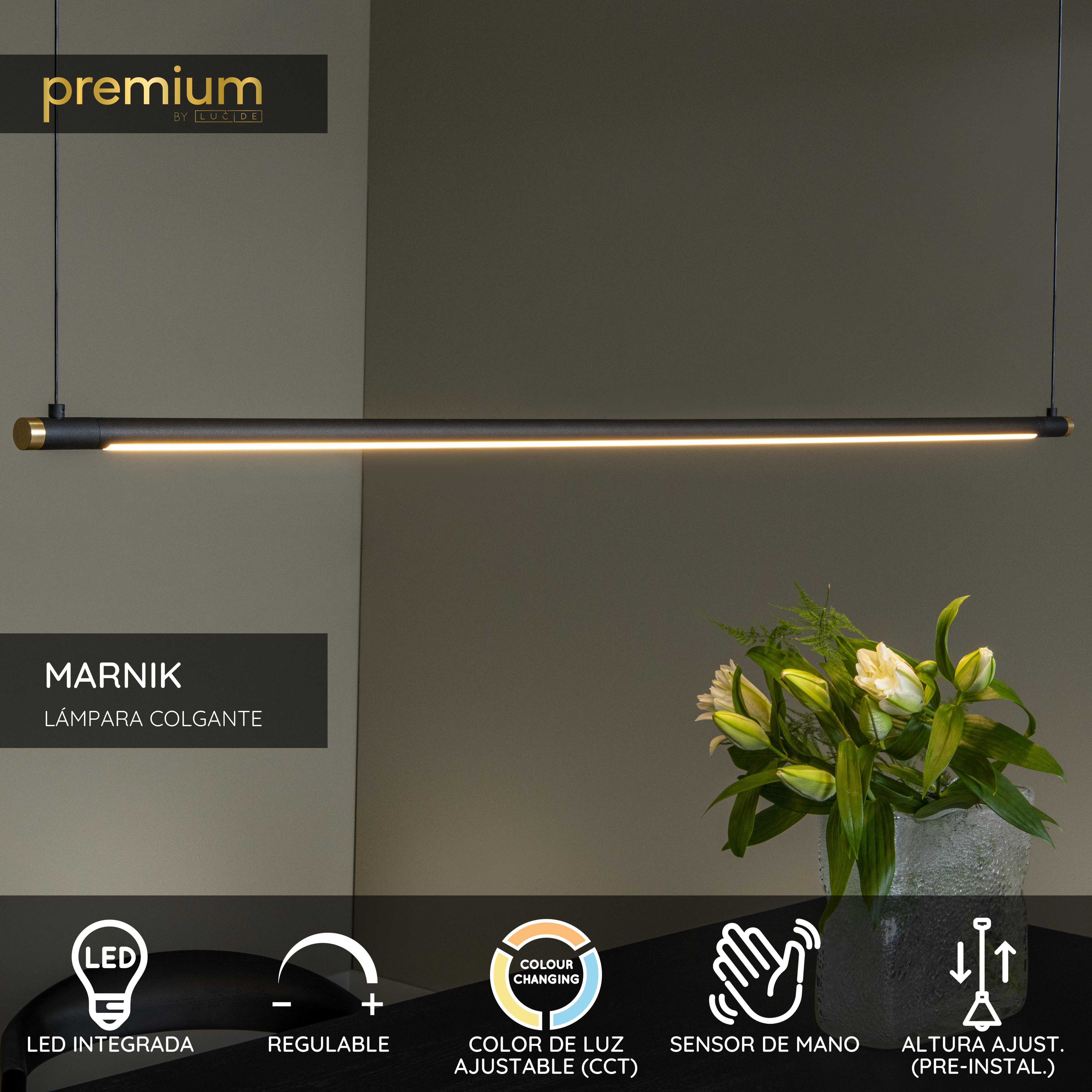 Aporta un diseño elegante y refinado a tu interior con la lámpara colgante Lucide Premium MARNIK. Con un perfil delgado de Ø2,5 cm y una altura de 160 cm, esta lámpara colgante cilíndrica moderna añade un toque sutil pero lujoso a cualquier espacio. Gracias a su LED integrado regulable (22W, 2700K-4000K), puedes ajustar fácilmente la temperatura de la luz mediante su sensor de movimiento manual por niveles en el producto. Su sensor de movimiento manual permite encender y apagar la luz con un simple gesto. La altura es ajustable antes de la instalación, asegurando un ajuste perfecto para tu interior. Fabricada en aluminio de alta calidad con un elegante acabado en negro con detalles dorados, la MARNIK se integra perfectamente en interiores modernos. ¡Pídela ahora y descubre el equilibrio perfecto entre diseño y funcionalidad! Este producto no debe conectarse a un interruptor de pared y solo puede controlarse mediante los mandos integrados en el propio producto.