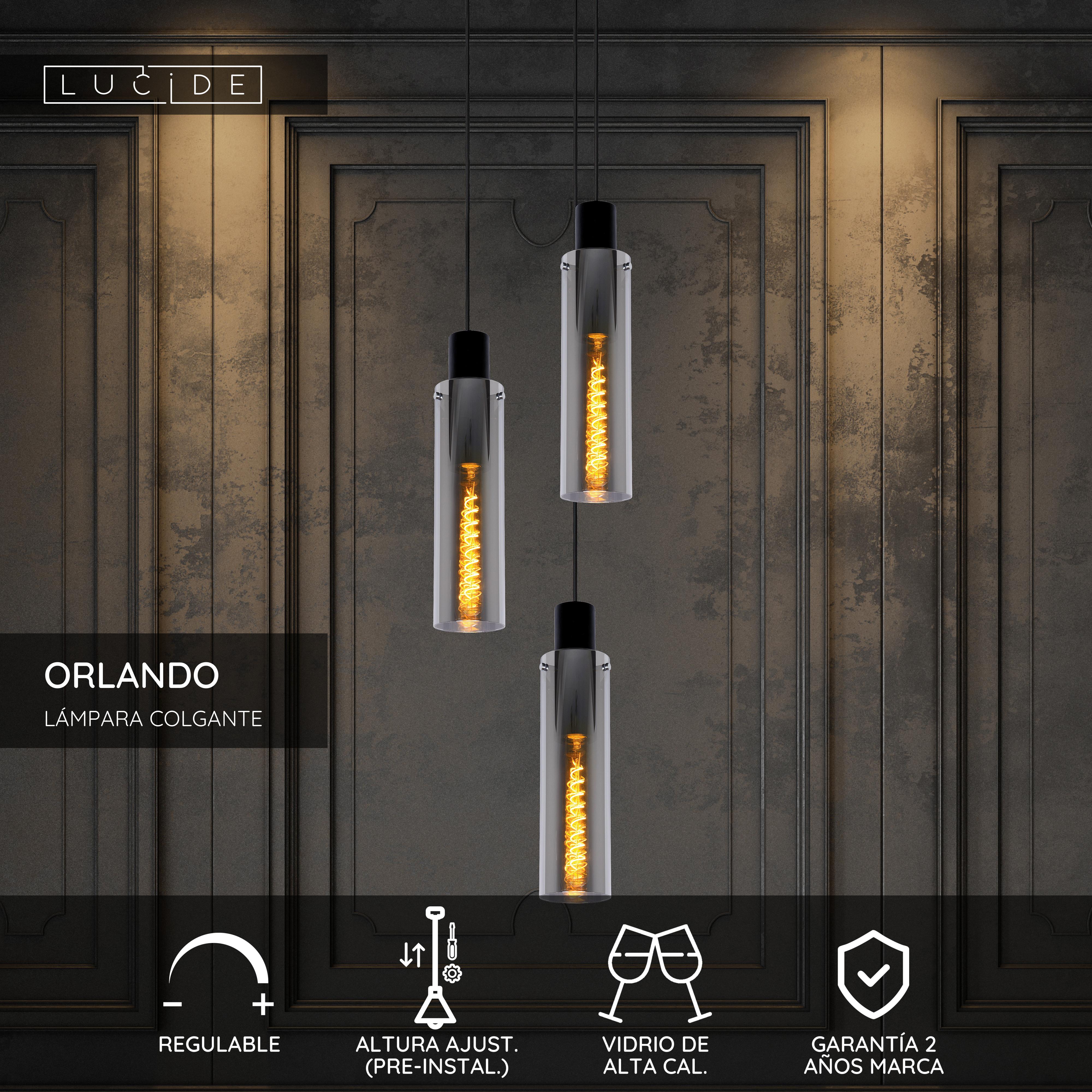 Cuando cuelgas tres elegantes cilindros de cristal a diferentes alturas obtienes esta impresionante lámpara de la serie Orlando. El cristal ahumado en combinación con los cables negros de tela convierte tu zona de relax en un espacio lleno de estilo. La altura de las fuentes de luz puede variar entre 120 y 172 centímetros. Por lo que tú puedes ajustar un poco su altitud. Para un resultado óptimo, ponles bombillas de filamento led con forma tubular alargada. ¿Quieres crear además el ambiente de luz ideal? Conecta Orlando a un regulador.