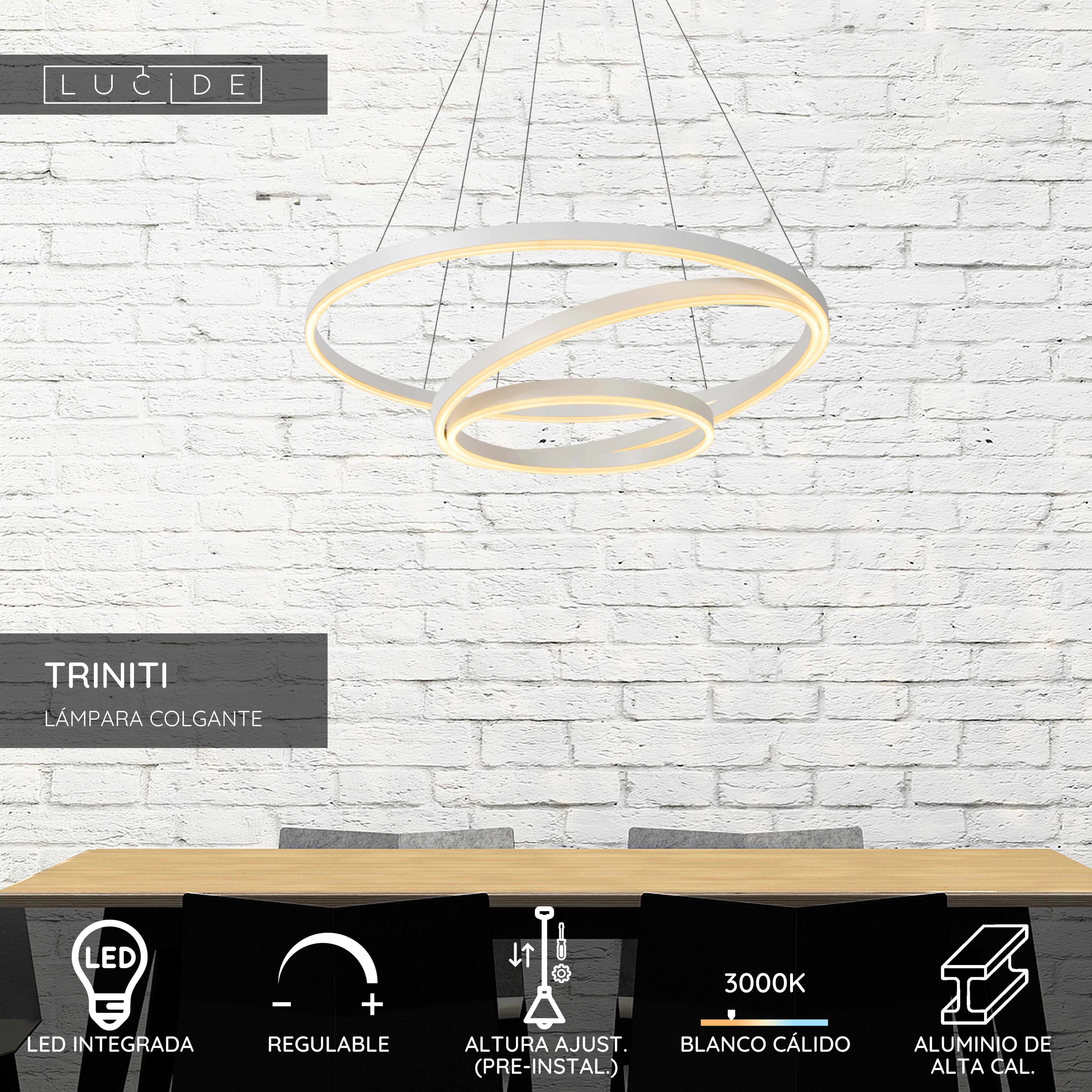 Los tres anillos de luz parecen entrelazados, pero están separados entre sí. Esta lámpara colgante hace honor a su nombre, Triniti, inspirado en la Santísima Trinidad. Antes de la instalación, hay que elegir la altura a la que colgarán los anillos (con una distancia mínima de 60 cm y máxima de 135 cm con relación al techo). Los cables que conectan la placa de montaje y las luminarias son tan finos y sutiles que los anillos de luz parecerán flotar sobre tu mesa. Si conectas la lámpara a un regulador, podrás variar el brillo de los led integrados en el equipo.