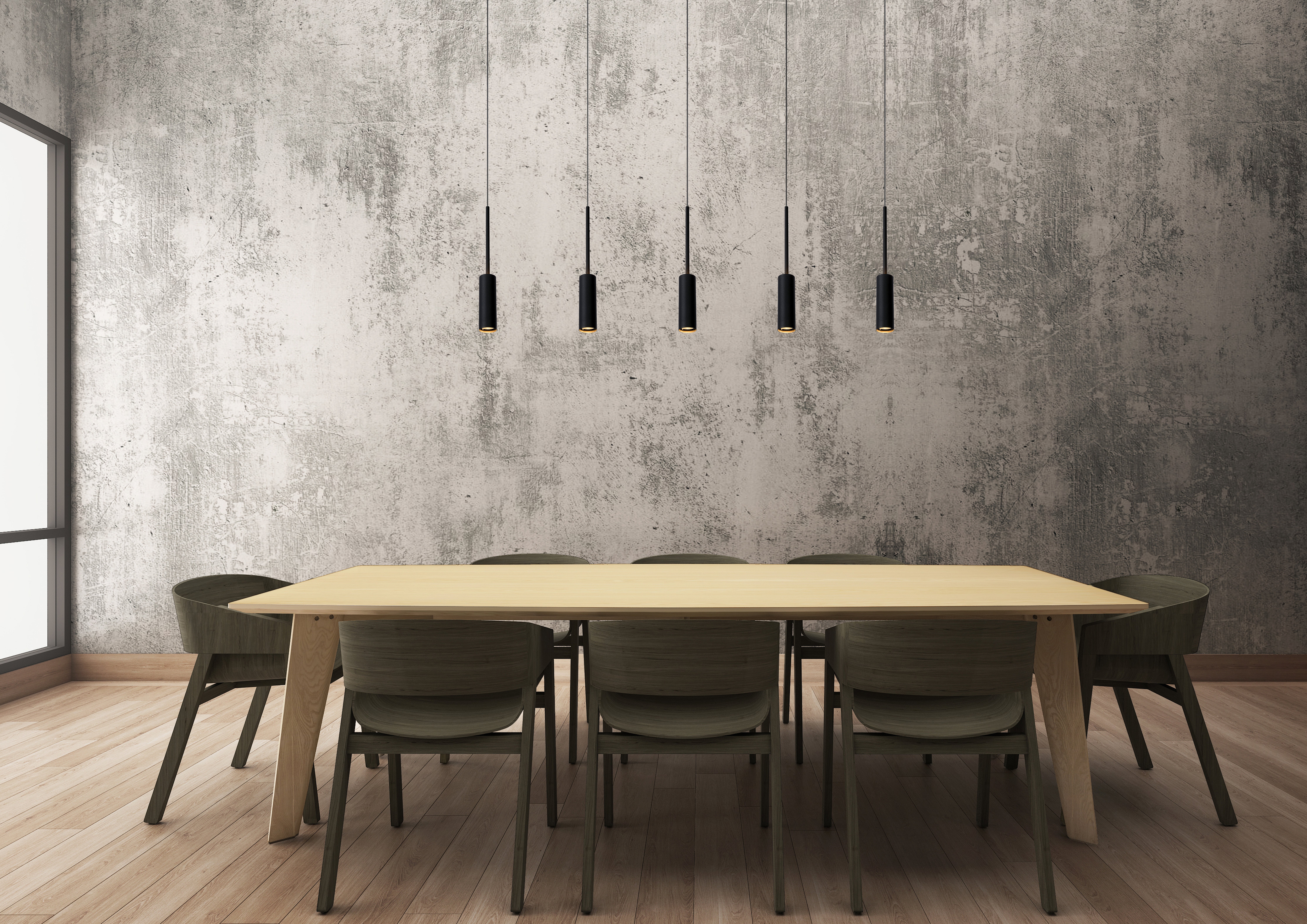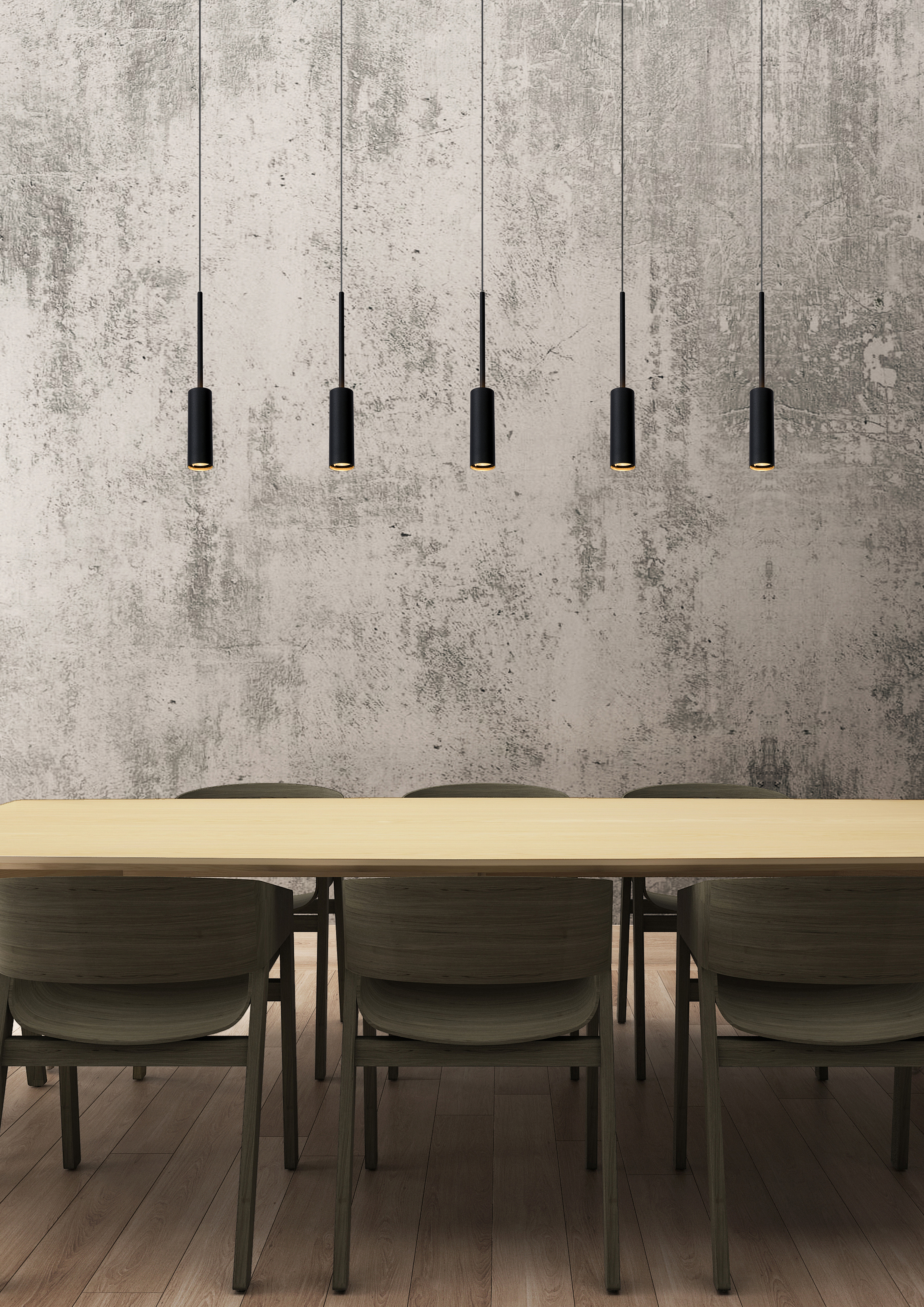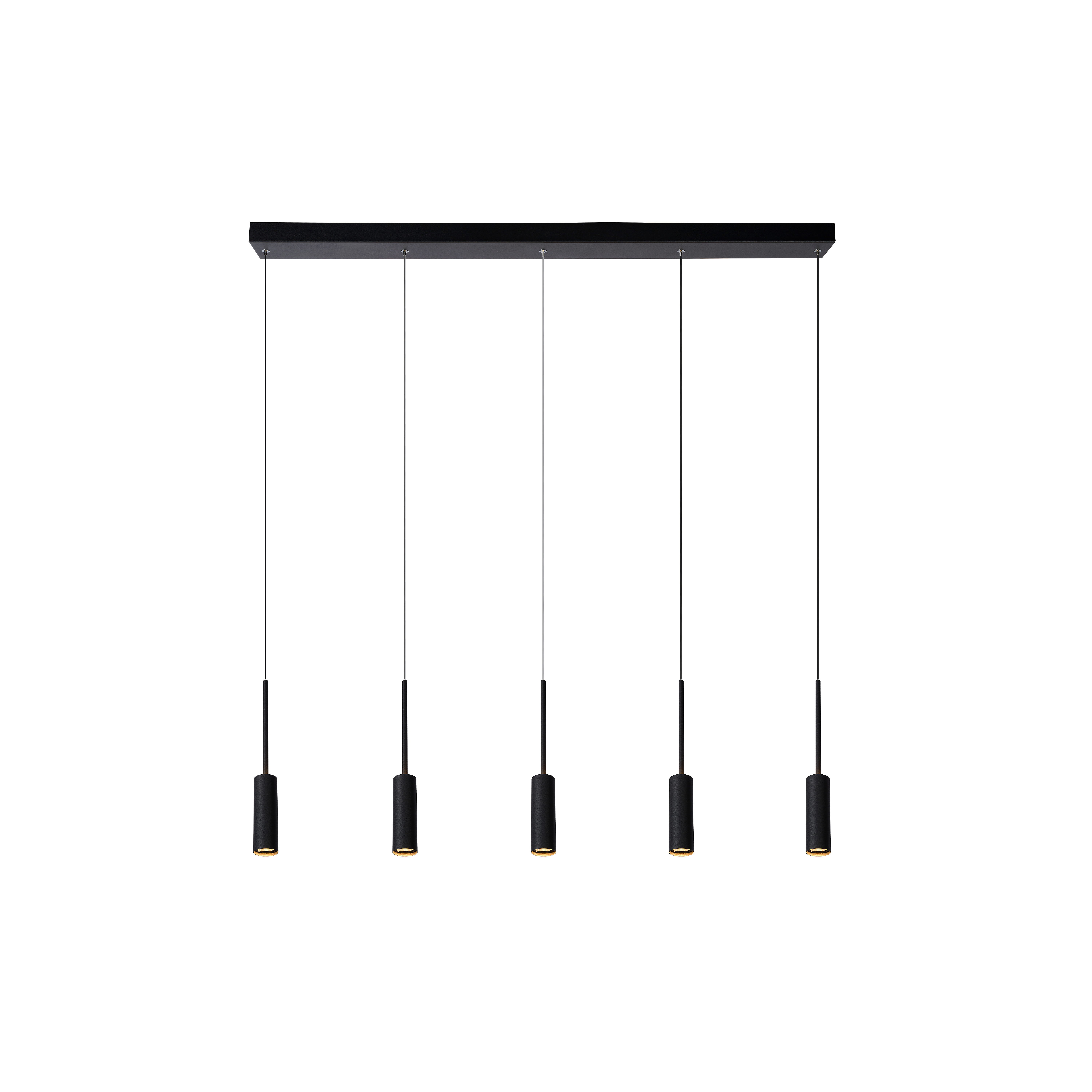 Un candelabro contemporáneo para un comedor moderno. Bienvenidos a Tubule. Los cinco puntos de luz están unidos en línea recta a una elegante placa de techo. Su diseño resulta único y elegante. ¿Pero quieres hacerlo más divertido? Puedes variar las alturas de las cinco lámparas colgantes. Los focos están integrados en las pantallas cilíndricas de aluminio. Su luz blanca cálida de tipo atmosférico se proyecta hacia abajo, pero también se escapa por arriba. Tubule está lista para iluminar tu próxima cena. ¿Y tú?