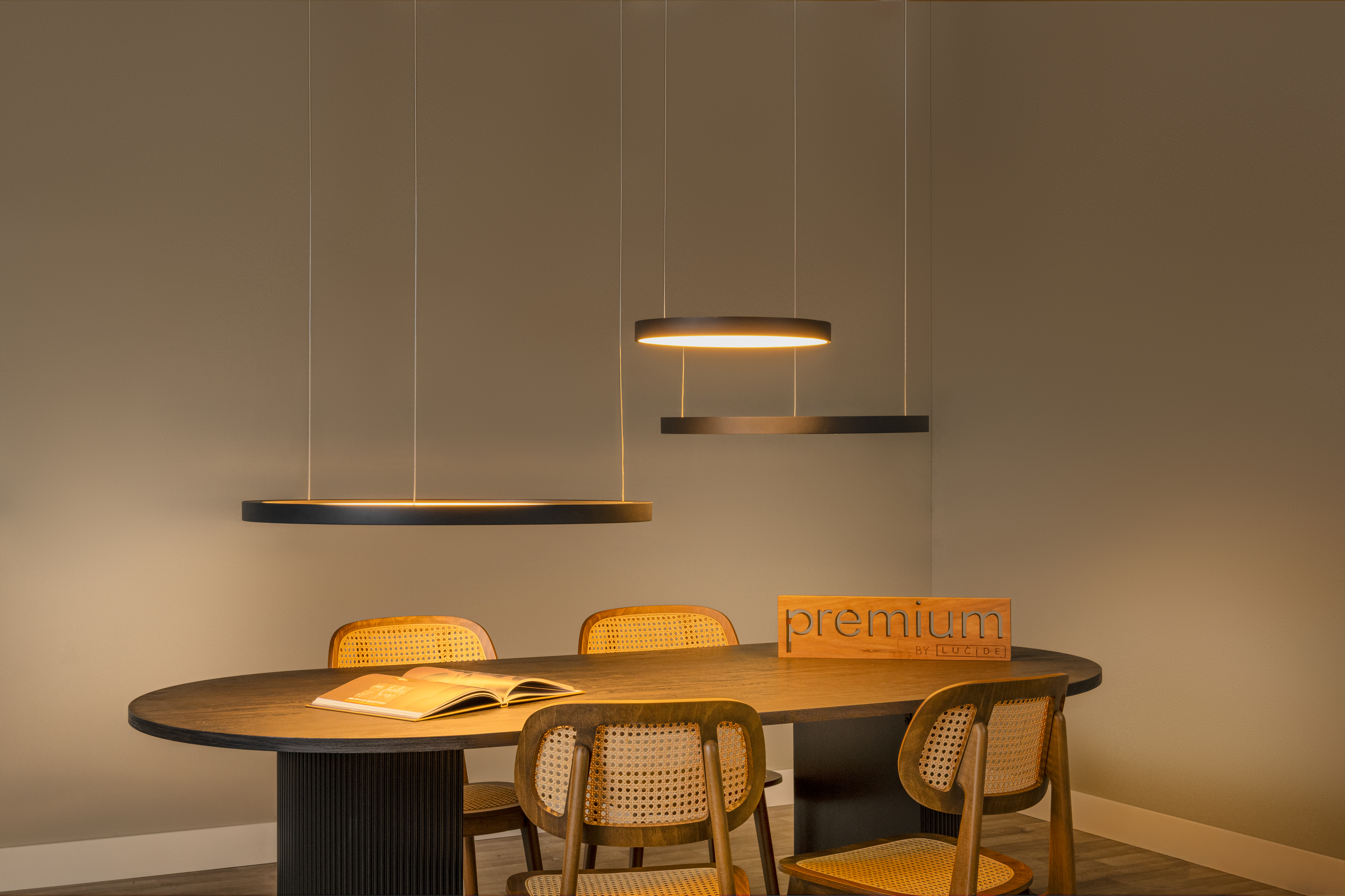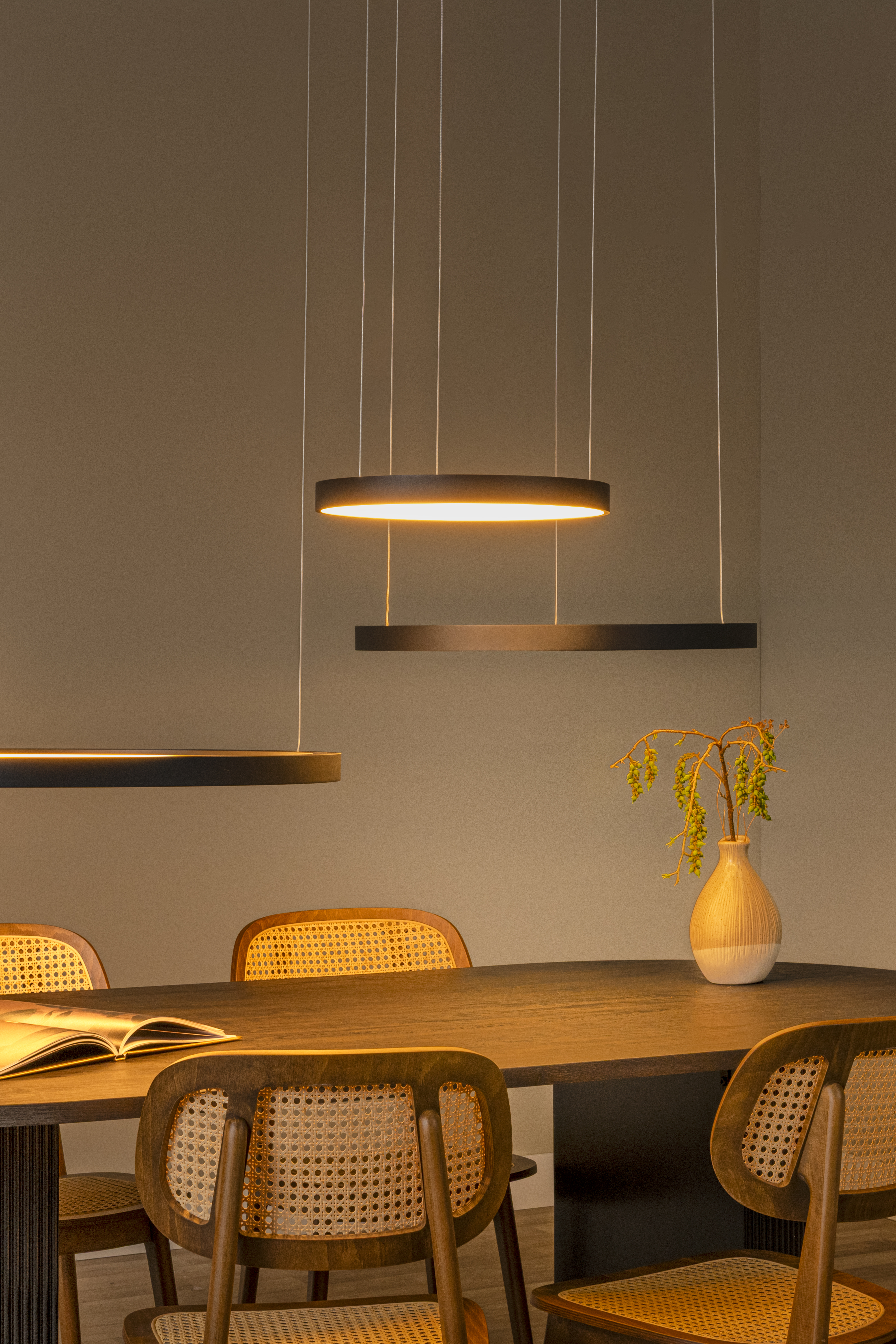 ¿La combinación perfecta una cena exitosa? Buena compañía, buena comida y bebida y la lámpara colgante Vidal, por supuesto. La lámpara abierta en forma de anillo cuelga de una cabeza redonda en el techo con tres delicados cables. La luz extremadamente cálida es la mejor compañera en la mesa, y sobre todo, puedes conectar fácilmente al modelo Vidal un regulador de la intensidad de la luz externo. Ajusta la altura de esta lámpara colgante hasta un máximo de 150 centímetros y tu mesa de comedor dispondrá siempre de la luz ambiental deseada. Y ya puedes recibir visitas.