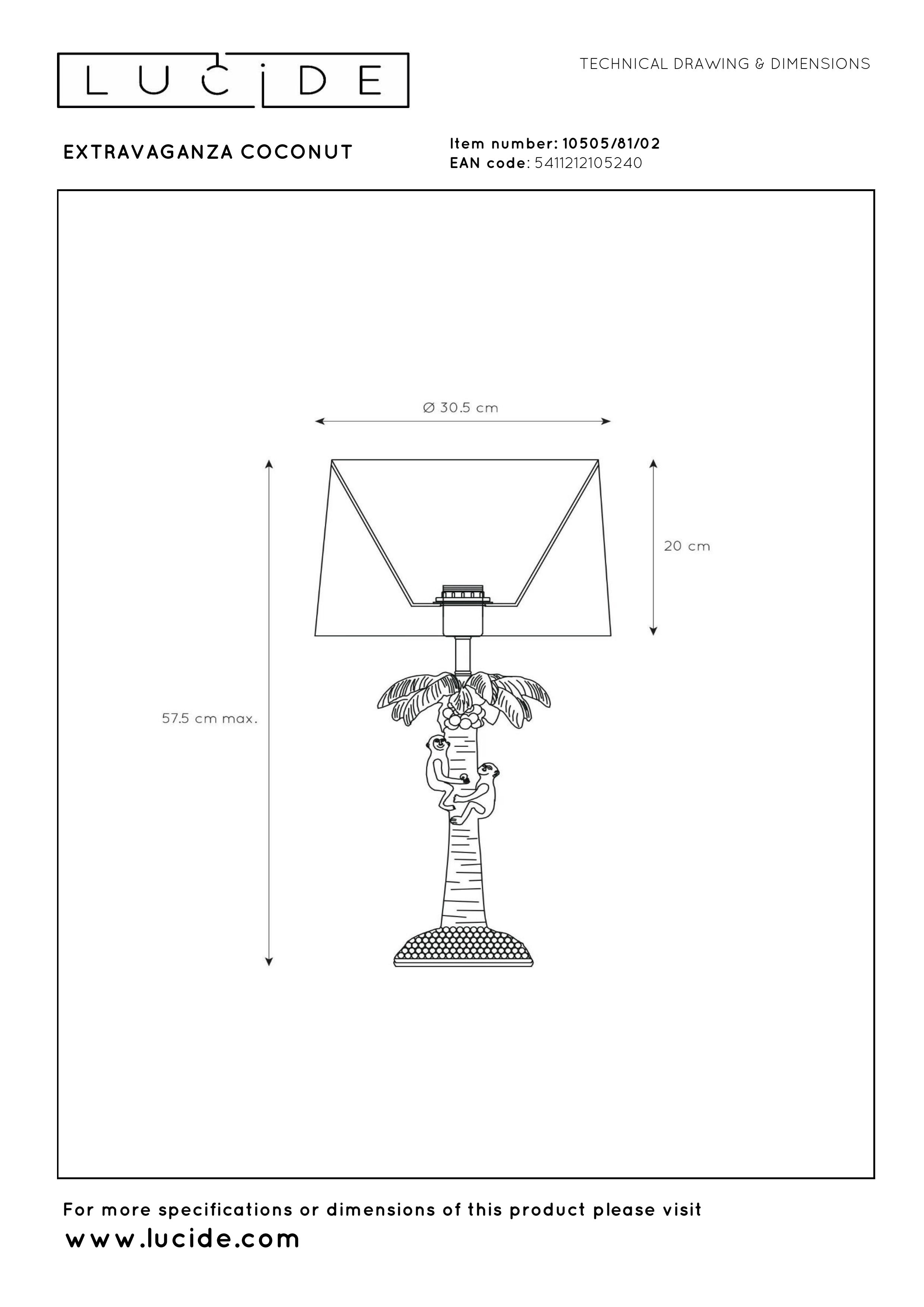 ¿Buscas una lámpara de mesa que sea funcional, pero que tenga un punto decorativo divertido y extravagante a la vez? Extravaganza Coconut te va a encantar. Bajo su pantalla de algodón de estilo clásico tiene lugar una escena de lo más exótica. Dos chimpancés aparecen subidos a una palmera. Uno recoge ansiosamente cocos mientras que el otro, más pequeño, observa con aprobación. La copa del árbol refulge con la luz que desciende de la lámpara. La base de la lámpara está fabricada en material sintético, mide medio metro de altura y es compatible con una bombilla led. Puedes encender y apagar la luminaria fácilmente mediante el interruptor del cable. Disfruta de su espectáculo y deja que sea el nuevo centro de atención de tu interior.