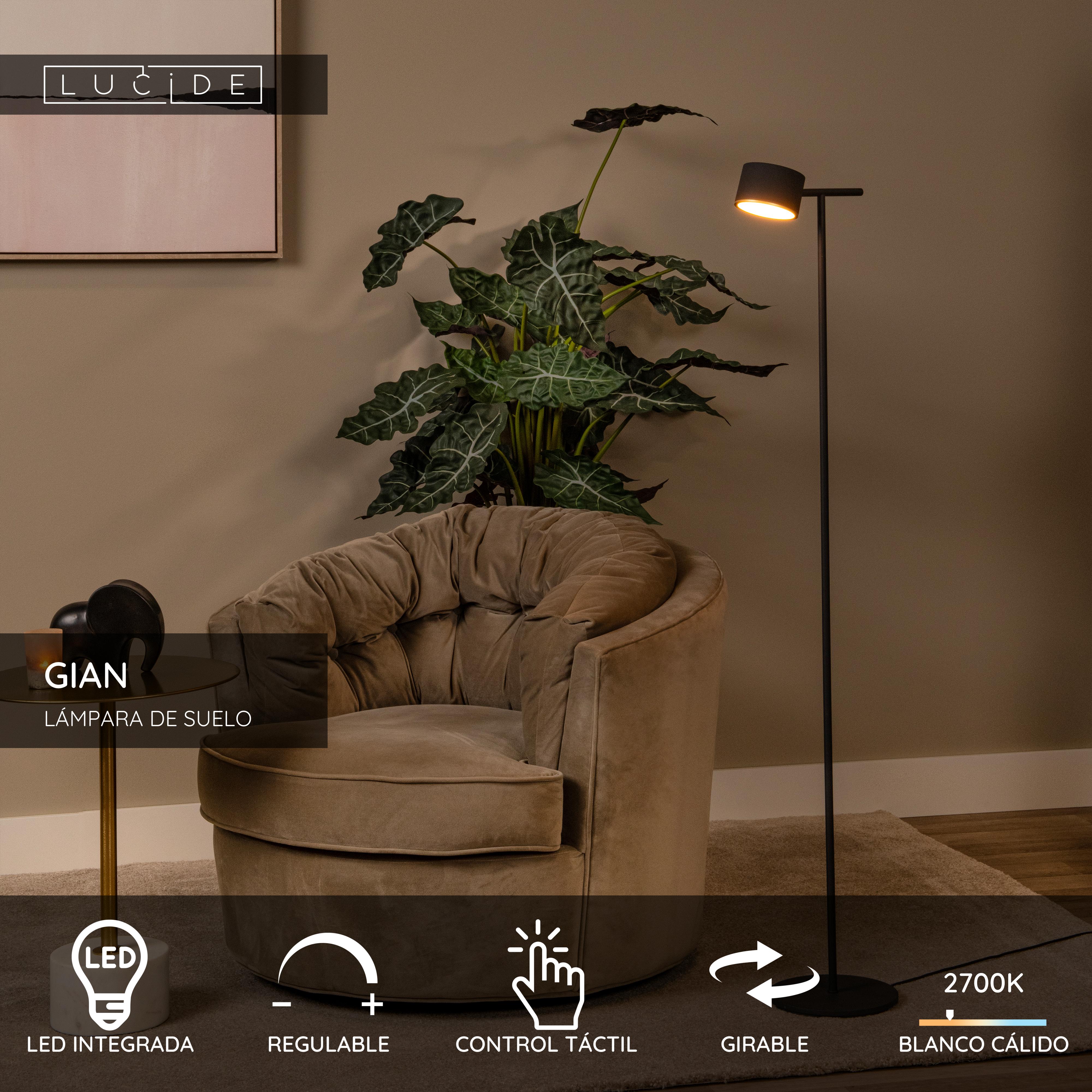 La lámpara de pie Lucide GIAN combina diseño moderno y funcionalidad. Fabricada en metal negro duradero, cuenta con una fuente de luz LED regulable integrada con un tono de luz cálida de 2700K. Gracias al práctico regulador táctil en la lámpara, puedes ajustar fácilmente el brillo. Esta lámpara de pie tiene una altura de 130 cm, un ancho de 26 cm y una profundidad de 20 cm. Con su función giratoria, la luz se puede dirigir según tus necesidades, ideal tanto para iluminación ambiental como de acento en tu interior. ¡Ilumina tu espacio con estilo con la lámpara de pie GIAN!