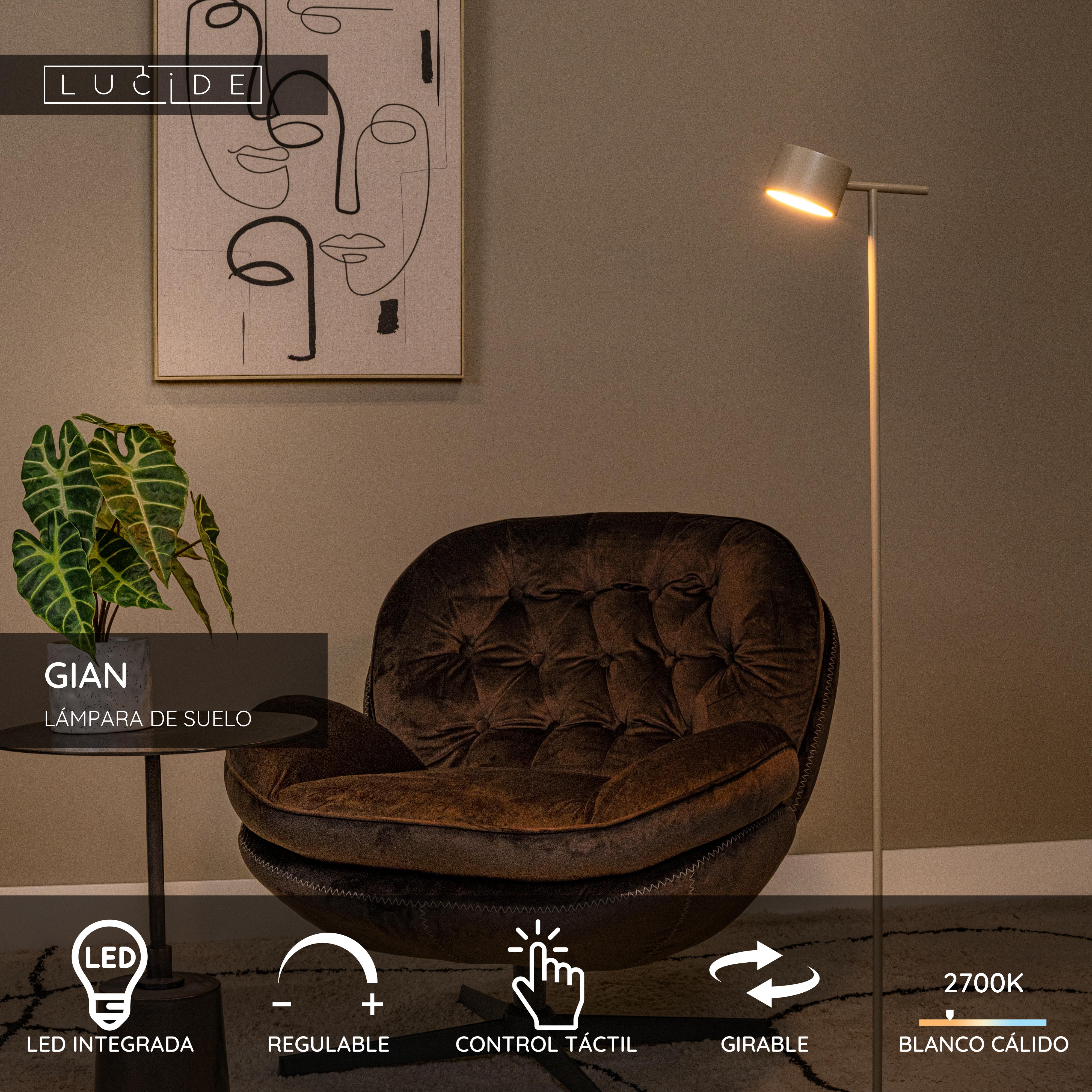 La lámpara de pie Lucide GIAN irradia elegancia contemporánea con su acabado metálico en color topo y su diseño moderno. Con una altura de 130 cm y un diámetro de base de 26 cm, esta lámpara es ideal para iluminación ambiental en espacios de vida y trabajo. Gracias a su fuente de luz LED regulable integrada (2700K), proporciona una luz blanca cálida que se controla fácilmente mediante el regulador táctil incorporado. Su función giratoria permite dirigir la luz según sea necesario. Añade un elemento elegante y funcional a tu interior con la versátil lámpara de pie GIAN.