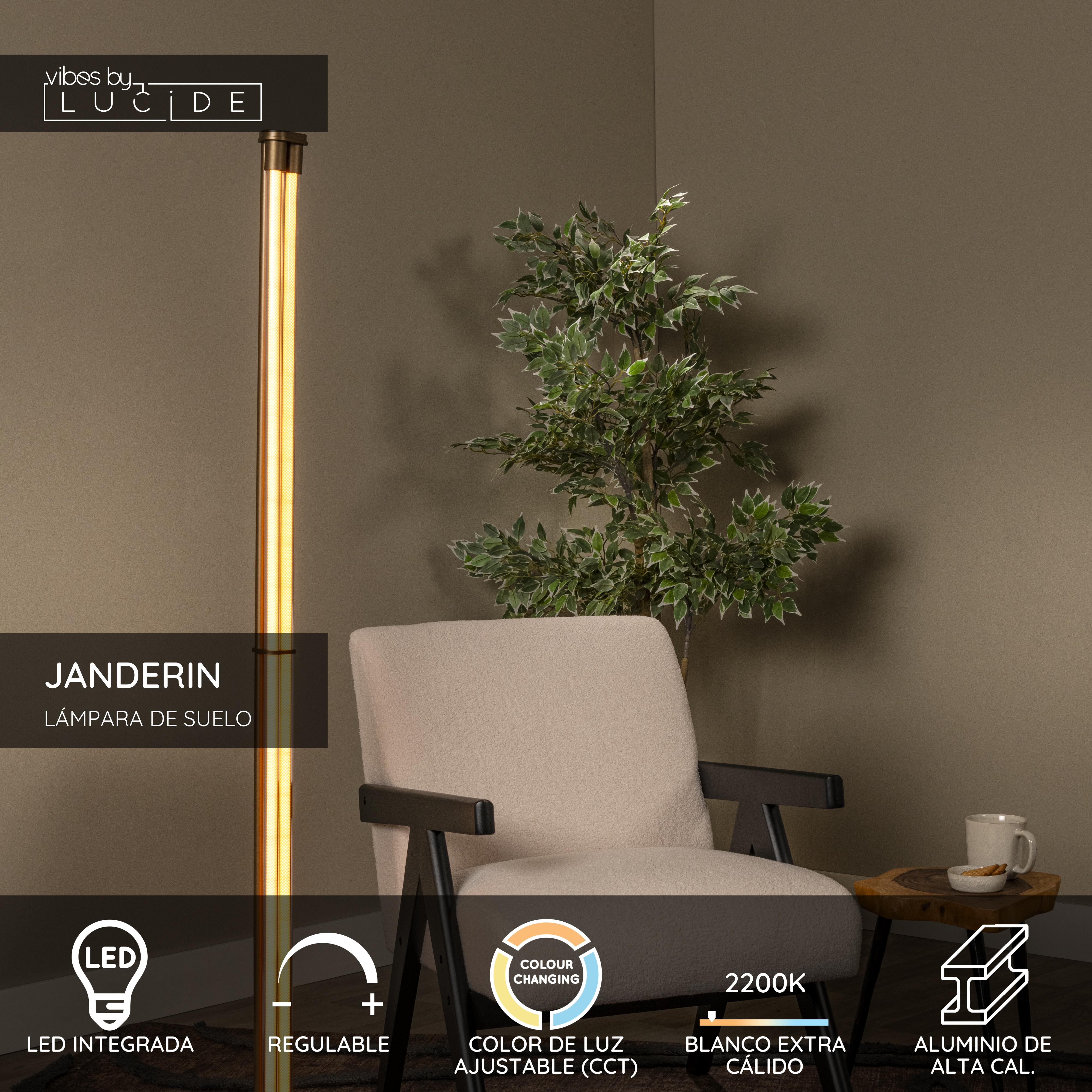 La lámpara de pie JANDERIN de Lucide combina sofisticación e innovación en un diseño elegante. Esta lámpara color champán cuenta con dos fuentes de luz LED integradas (2x17W), regulables en intensidad y temperatura de color entre 2700K y 4000K. Gracias al sensor de movimiento manual, puedes encender o apagar la luz con un simple gesto. Con una altura de 155,9 cm, un ancho de 24 cm y una profundidad de 20,2 cm, esta lámpara moderna es un punto focal elegante en cualquier espacio de vida o trabajo. Elige comodidad y diseño atemporal con JANDERIN.