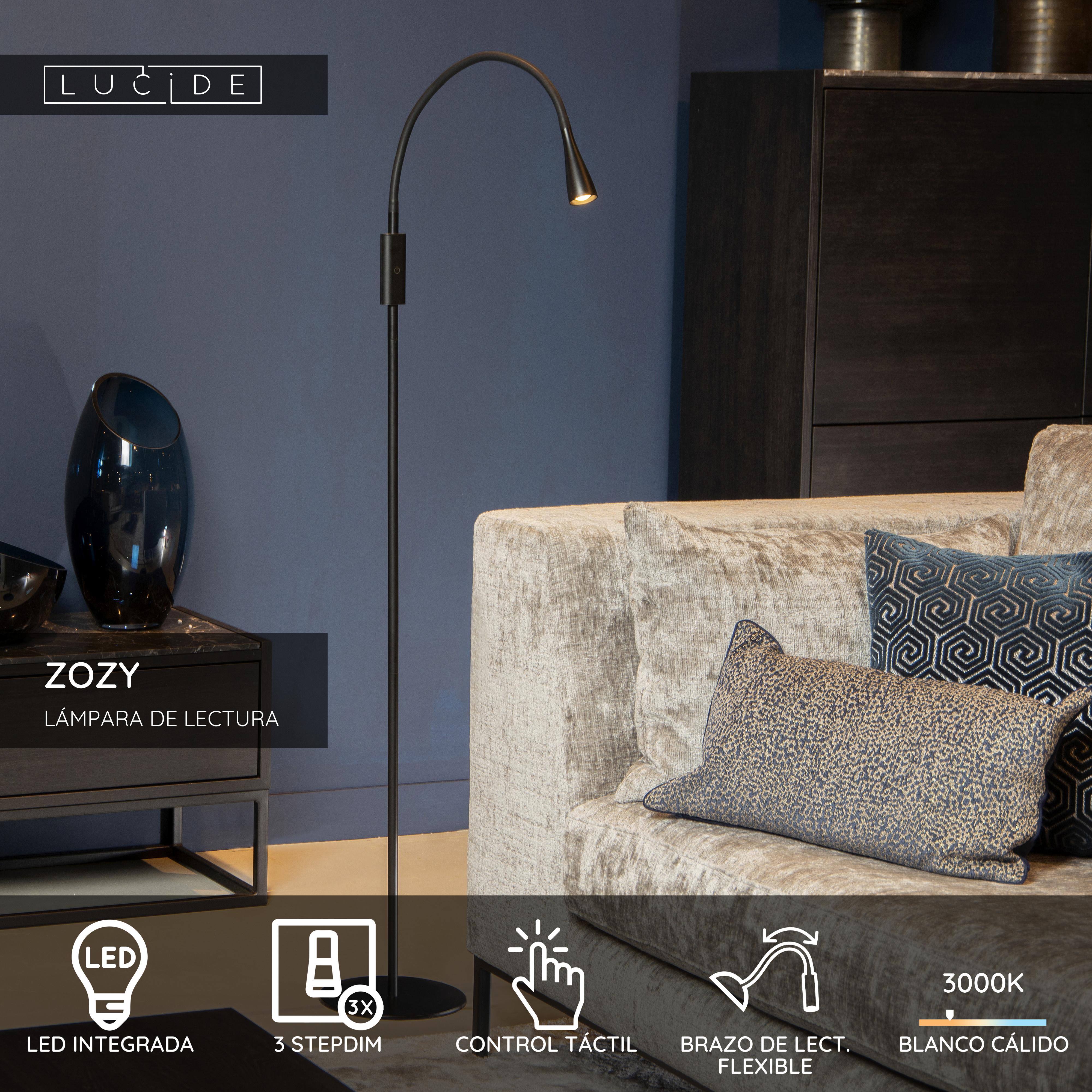 Mientras que las lámparas de pie suelen ser voluminosas y pesadas, Zozy resulta todo lo contrario. Su diseño delgado y liviano se levanta sobre una placa base ultradelgada. La luminaria, por tanto, resulta ideal para los amantes de los libros y también de los interiores modernos. Zozy mide 145 centímetros de alto y el brazo de lectura flexible se puede girar e inclinar fácilmente. Ese brazo de lectura dispone de una bombilla led integrada con luz blanca cálida regulable. Puedes encenderla y apagarla mediante el interruptor que hay en la placa base, justo por debajo del brazo. También allí va integrado un regulador táctil que permite ajustar la intensidad de la luz en tres niveles. Lo único que tienes que hacer es sentarte, relajarte y disfrutar de tu libro.
