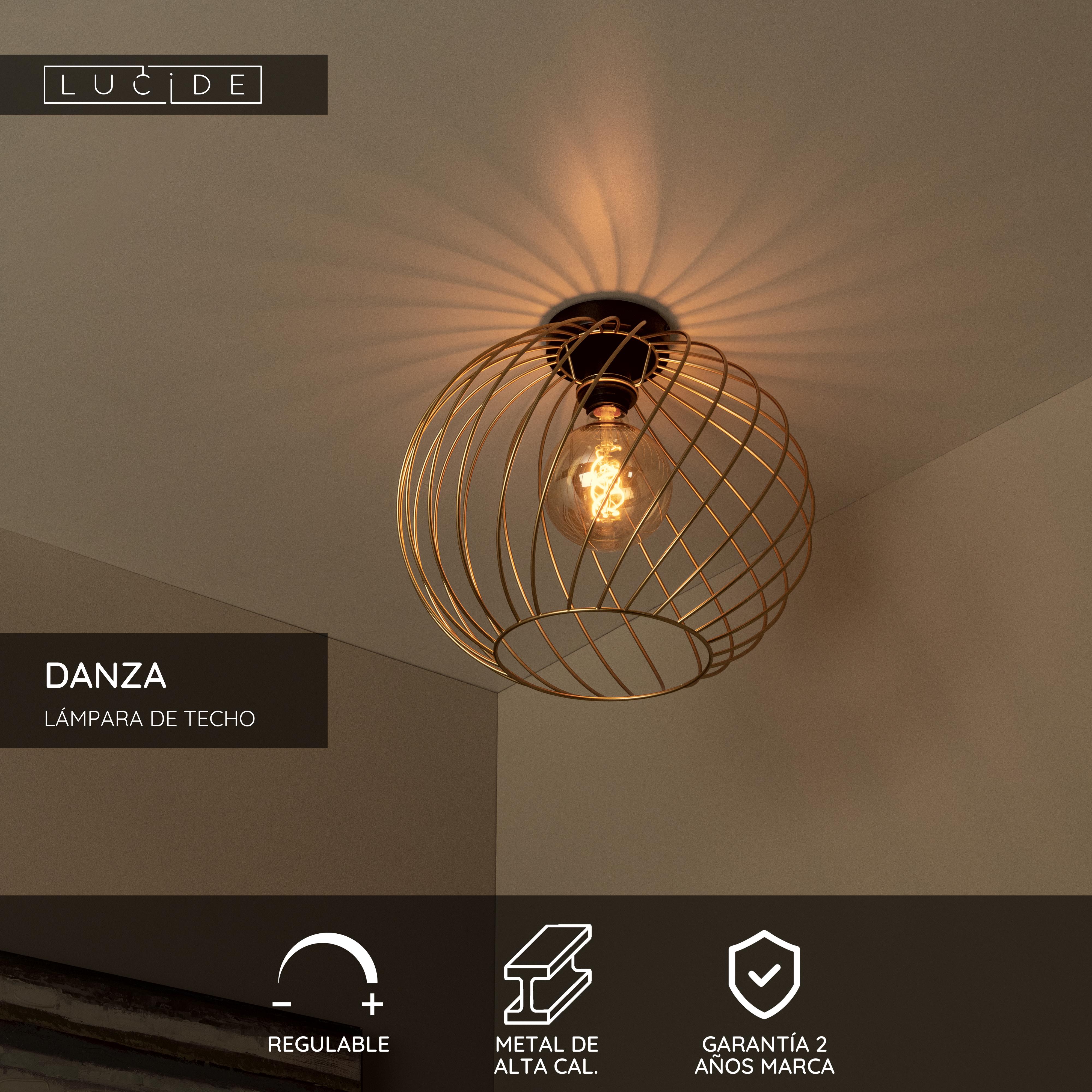 Llévate esta interesante lámpara de techo y mejora el aspecto de tu decoración. Este modelo de forma de bola envuelve el foco de luz con unos finos cables metálicos y retorcidos. Gracias a su estructura abierta, Danza es muy adecuado para una bonita bombilla de filamento. Además, con un regulador de la intensidad de la luz externo también podrás ajustarla a tu gusto. Danza se adapta a cualquier espacio: un acogedor rincón de descanso o la cocina o el discreto dormitorio. Esta lámpara de techo tiene un diámetro de 40 cm y una altura de 35,5 cm.