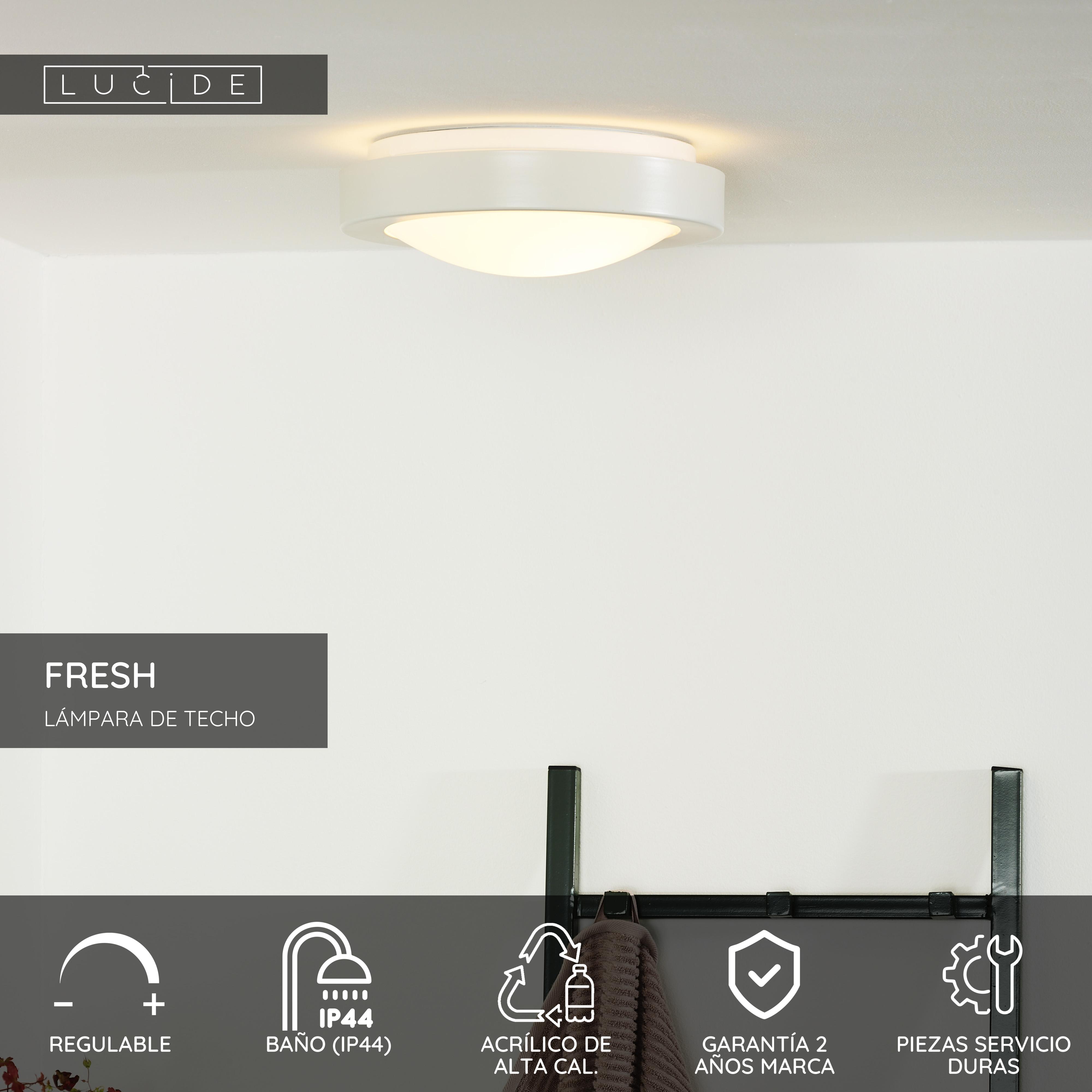¡El aplique de techo Fresh, de Lucide, tiene un nombre que le va como anillo al dedo! Gracias a su diseño fresco y a su diámetro de apenas 9,5 cm, lo puedes colocar en cualquier techo. Además, tiene un grado de protección IP 44, por lo que también es apto para el cuarto de baño. Su acabado en cromo mate o blanco mate le proporciona un aspecto muy hermoso. Esta lámpara de techo tiene un casquillo E27 apto para bombillas de bajo consumo.