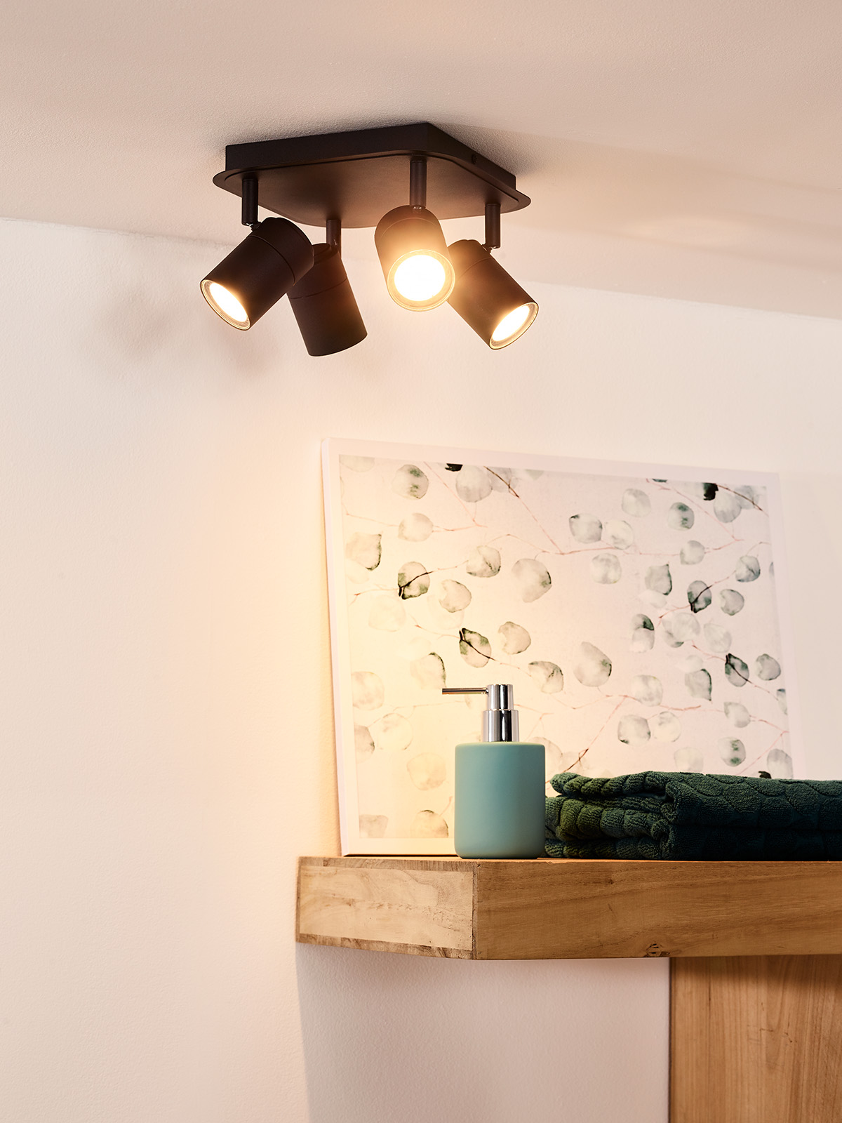 ¿Te gusta la serie de lámparas Lennert? Tenemos buenas noticias para ti, porque tras las versiones con uno, dos y tres bombillas, ahora también hay disponible un modelo de foco de techo con hasta cuatro puntos de luz. Y esta luminaria compacta ocupa tan solo un cuadrado de 22 x 22 centímetros. Lennert está fabricado en metal de alta calidad y ha sido especialmente diseñado para su instalación en el cuarto de baño con total seguridad. Además, los cuatro focos son giratorios e inclinables para dirigirlos a los lugares que necesitan más luz. Lennert se entrega junto con bombillas dotadas de la tecnología Dim-to-Warm. Si conectas la lámpara a un regulador compatible, podrás cambiar la temperatura de color de su luz.