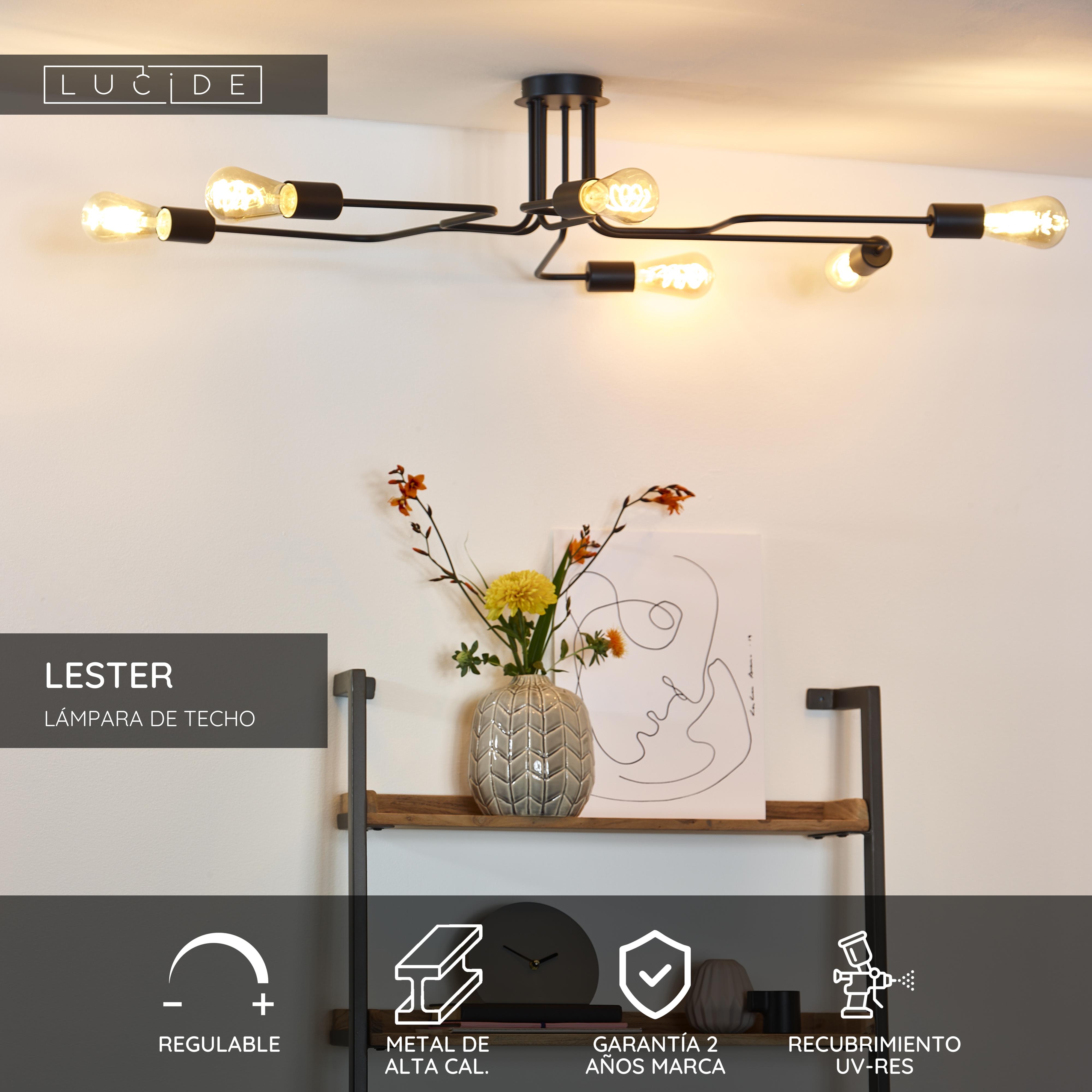 Un elegante juego de líneas en el techo que combina tanto con espacios modernos como rústicos. Cada uno de los brazos de la lámpara de techo Lester sostiene una bombilla (que no está incluida en el equipo). Su ingenioso diseño de brazos fijos asegura una amplia distribución de la luz. El acabado en metal de alta calidad le da un aspecto clásico, pero su diseño llama inmediatamente la atención. Tanto si colocas Lester en tu salón, cocina o en un dormitorio, sus seis puntos de luz te proporcionarán un brillo muy agradable. La luminaria se enciende fácilmente mediante un interruptor de pared.