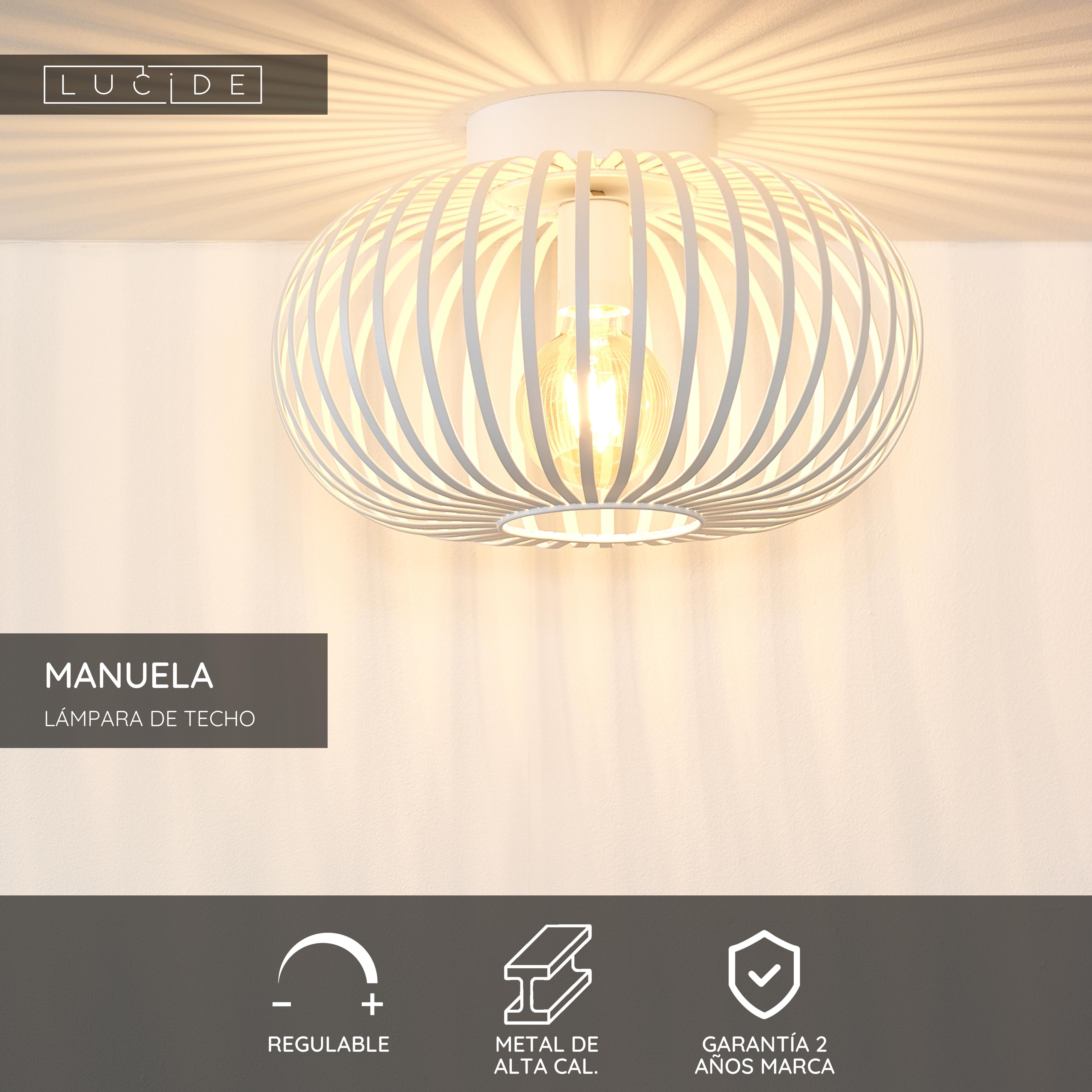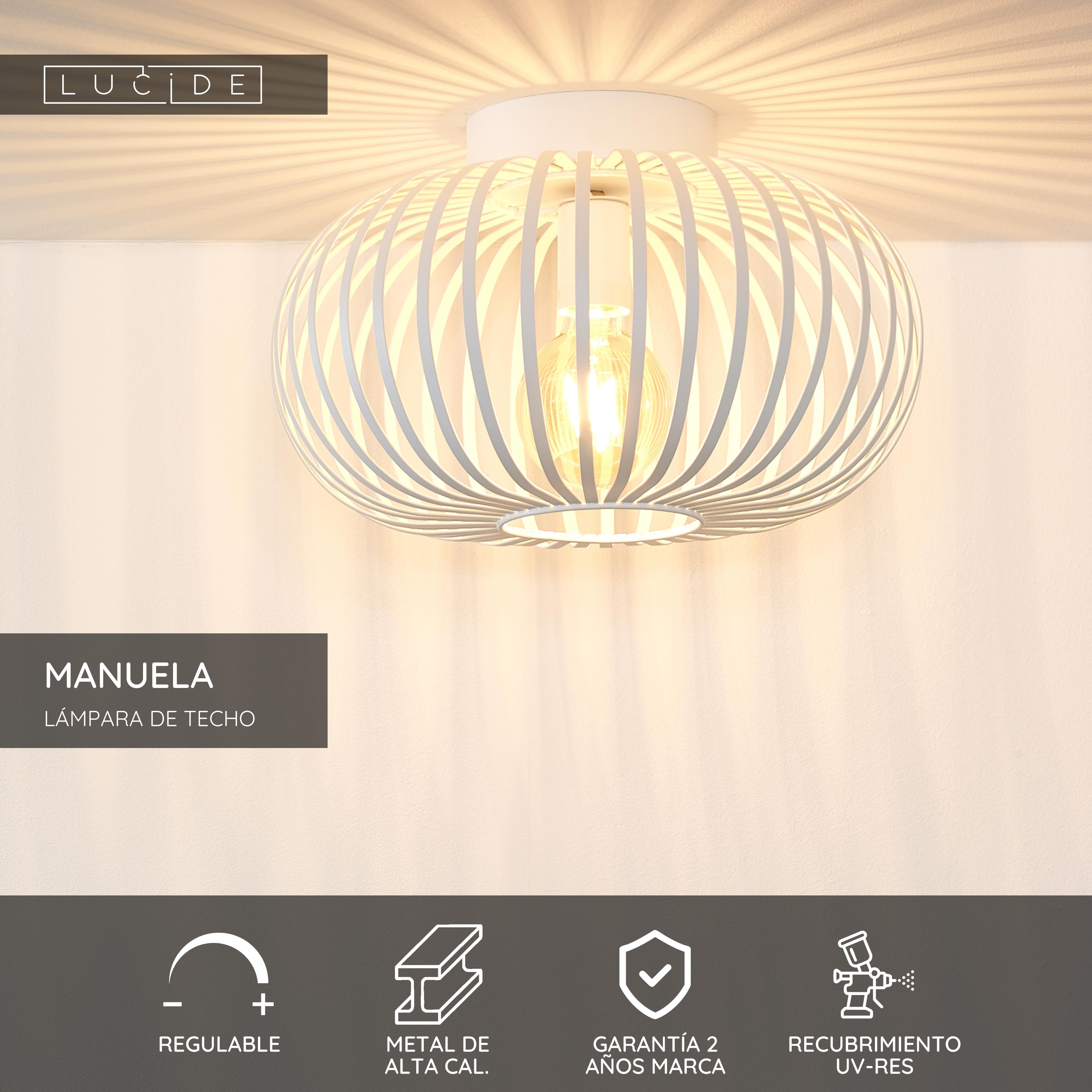 Parece una fuente de luz atrapada en una jaula de metal. Pero el plafón Manuela sabe cómo afrontar esta situación. Es uno de los modelos nuevos de la colección de Lucide, pero se ha convertido rápidamente en un gran éxito. Que la bombilla quede a la vista es una idea que se apunta inteligentemente a las tendencias actuales en diseño de interiores. Este plafón lo tiene todo para aportar calidez a tu hogar. Colócalo sobre la mesa del comedor, de la cocina o del salón y disfruta inmediatamente de la maravillosa luz ambiental que crea. Manuela es una luminaria que puedes conectar fácilmente a un regulador de luz y, si lo haces, esta función la realzará aún más.