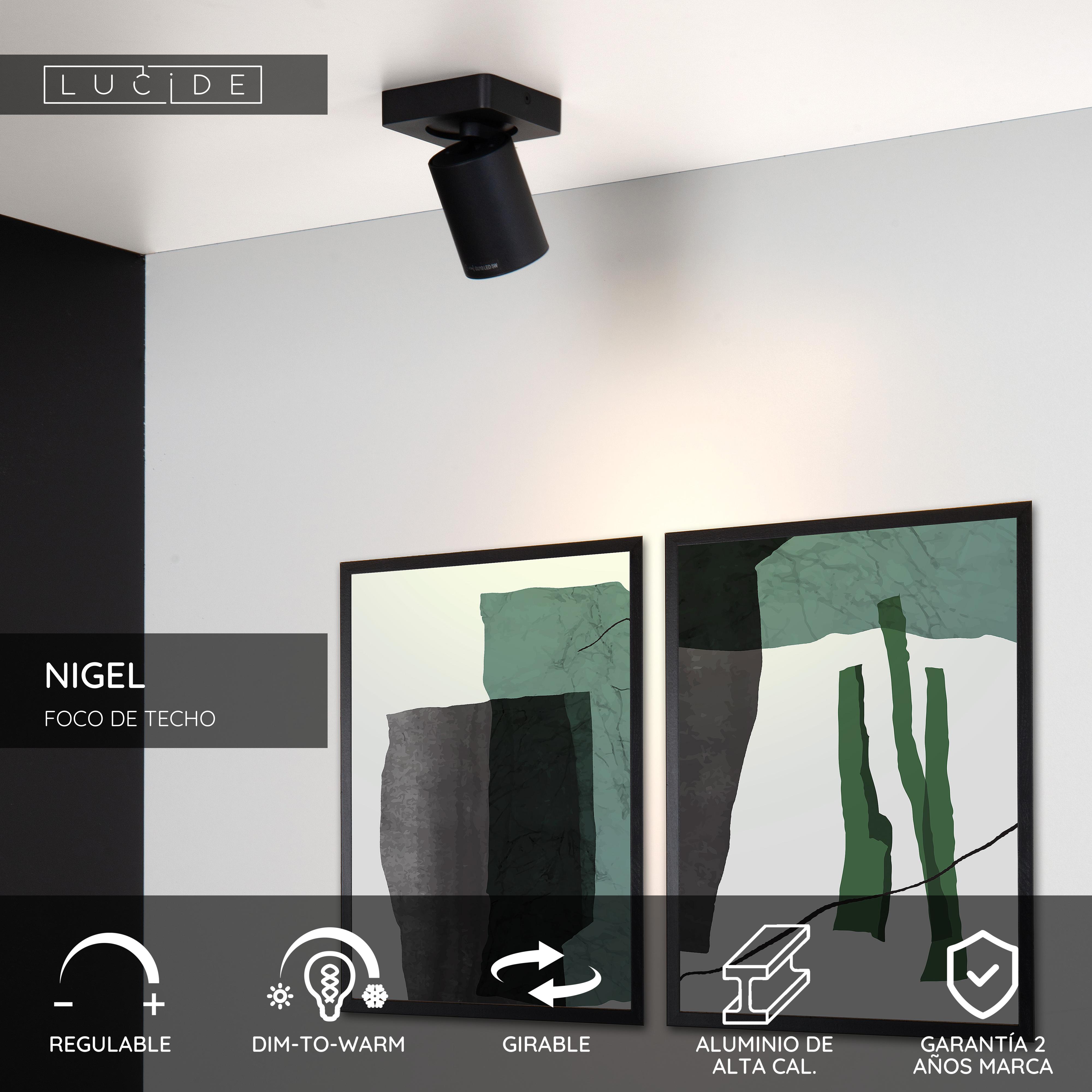 Nigel es un foco de techo compatible con una bombilla led GU10 con tecnología Dim-to-Warm. Esta permite variar su temperatura de color entre 2200 y 3000 K. El diseño de Nigel con su pantalla cilíndrica resulta sencillo y atemporal, para que el foco combine bien con todo tipo de estilos de interior. Nigel está disponible en los colores blanco y negro. Y se presenta con diferentes puntos de luz. La variante blanca cuenta con un bonito acento de color negro en el interior de la pantalla. Este foco de techo está fabricado en aluminio y tiene una altura de 12 centímetros. Solo tienes que instalar Nigel en el techo, conectarlo a un regulador de luz, girar e inclinar el foco a tu gusto para disfrutar de su luz.