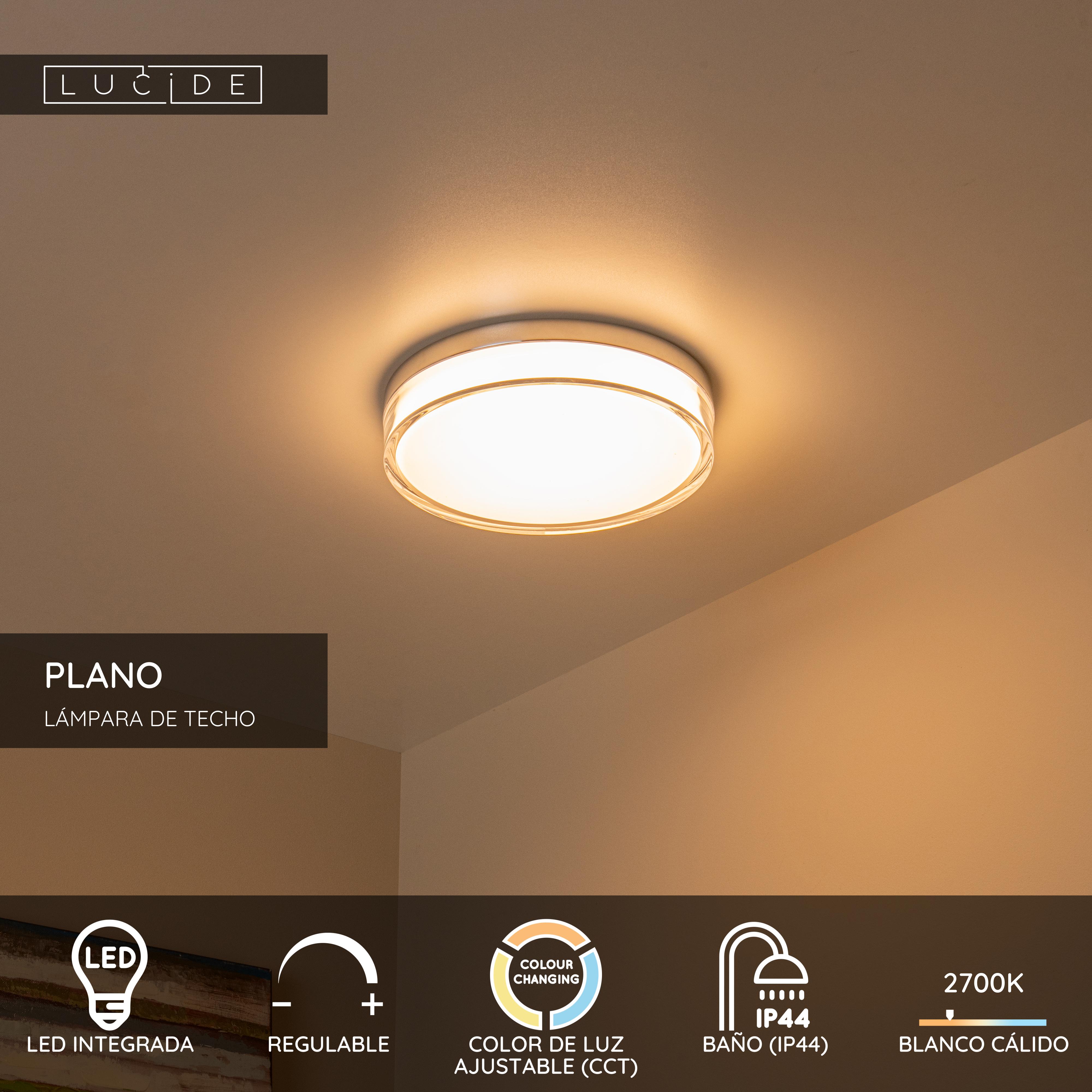 Crea una iluminación acogedora con el plafón Lucide PLANO. Esta moderna lámpara de techo combina un diseño elegante con tecnología inteligente. Su fuente de luz LED integrada de 16W no solo proporciona una iluminación eficiente en energía, sino también flexibilidad gracias a su temperatura de color ajustable (2700K-4000K) mediante el práctico interruptor DIP en la base de montaje. Con un diámetro de 28 cm y una altura de 5,9 cm, este plafón es perfecto para baños, pasillos o espacios exteriores cubiertos. Gracias a su protección IP44, es resistente a la humedad. Conéctalo fácilmente a un regulador externo (no incluido) y ajusta la atmósfera a tu gusto. Elige una iluminación versátil y elegante con este moderno plafón de Lucide.