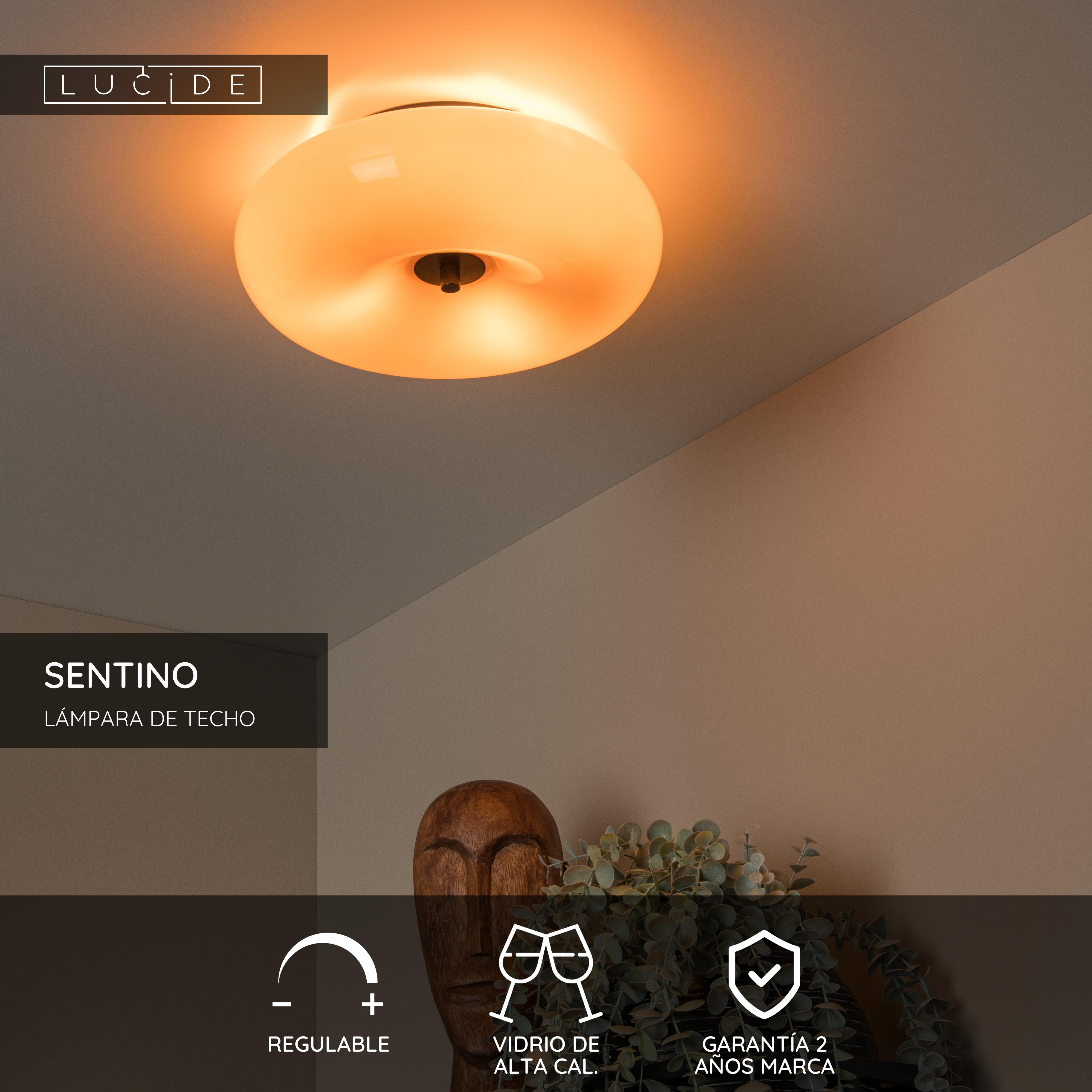 Marque la diferencia con la lámpara de techo Sentino. Su forma redonda, fabricada en cristal revestido brillante, proyecta una luz muy suave que baña toda la habitación en un cálido resplandor. Tanto cuando la lámpara de techo está encendida como cuando está apagada, su singular forma de rosquilla, rematada con un embellecedor en el centro, atraerá todas las miradas. Perfecta para el salón, la cocina, el dormitorio o el pasillo, Sentino es una pieza llamativa que añadirá un toque de estilo sesentero o contemporáneo a cualquier habitación.