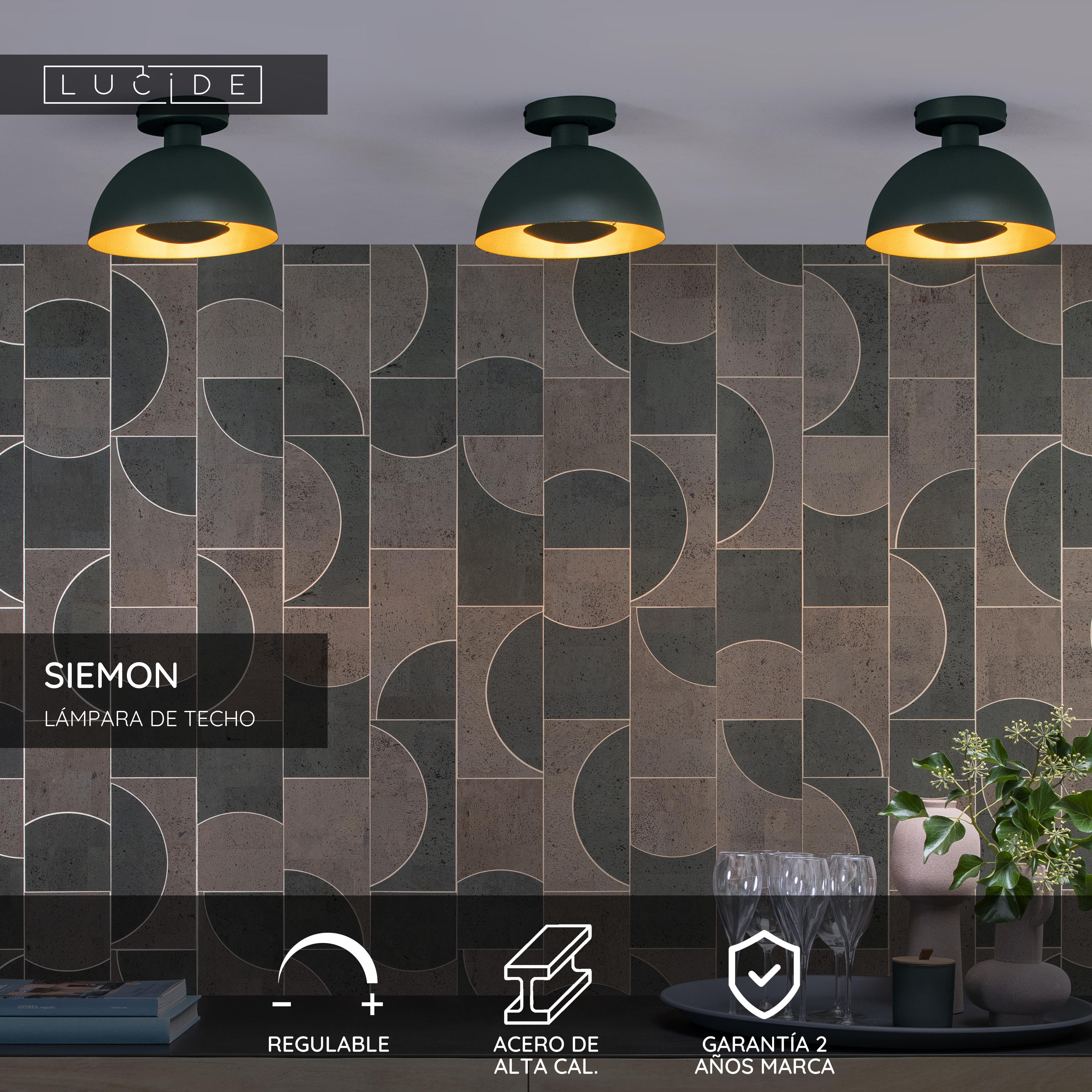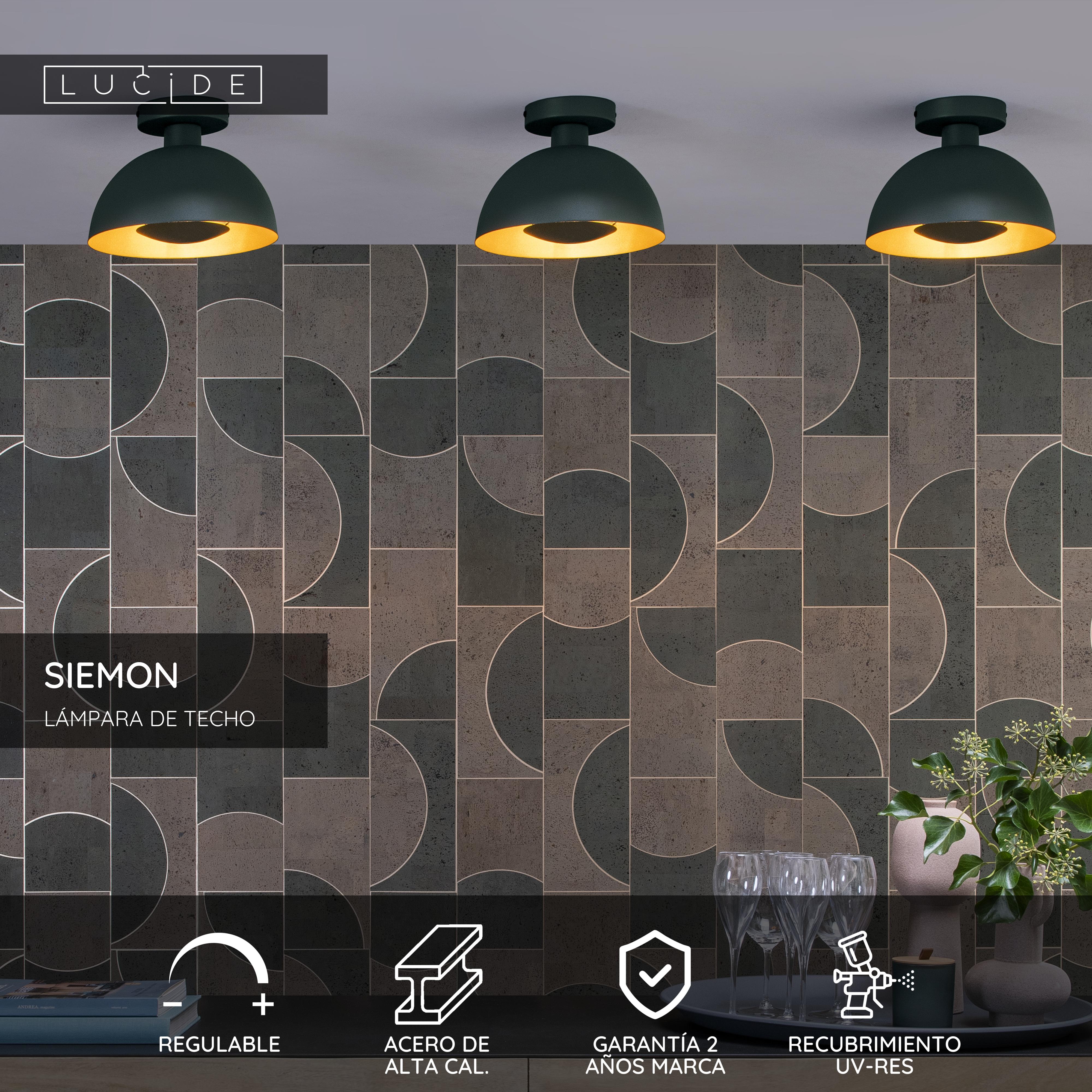 Siemon combina un toque retro y moderno a la vez. Dos ingredientes de primera que lograrán que quede perfecta en tu recibidor, salón o cocina. Esta lámpara de techo está fabricada en acero de alta calidad, tiene un diámetro de 25 centímetros y pesa tan solo 800 gramos. Debido a su diseño, Siemon se ve preciosa y al mismo tiempo moderna. En el centro de la pantalla semiesférica y conectada a ella mediante finas abrazaderas, hay un disco que tapa la bombilla. De esta forma su luz se refleja perfectamente en la pared interior de la pantalla. Puedes conectar esta lámpara a un regulador para crear la atmósfera luminosa ideal.
