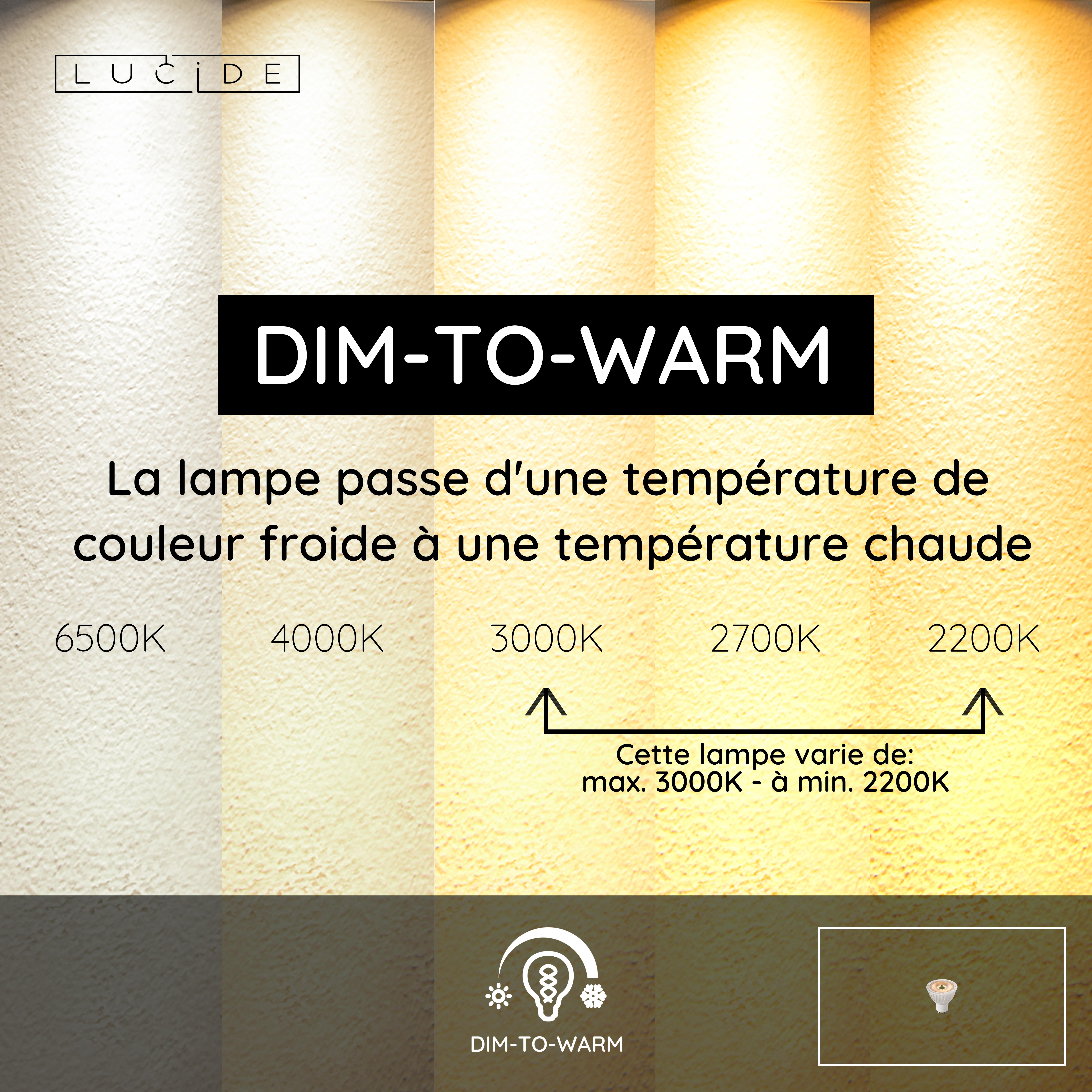 - Dim to warm, dimmable vers une couleur plus chaude (2200K)