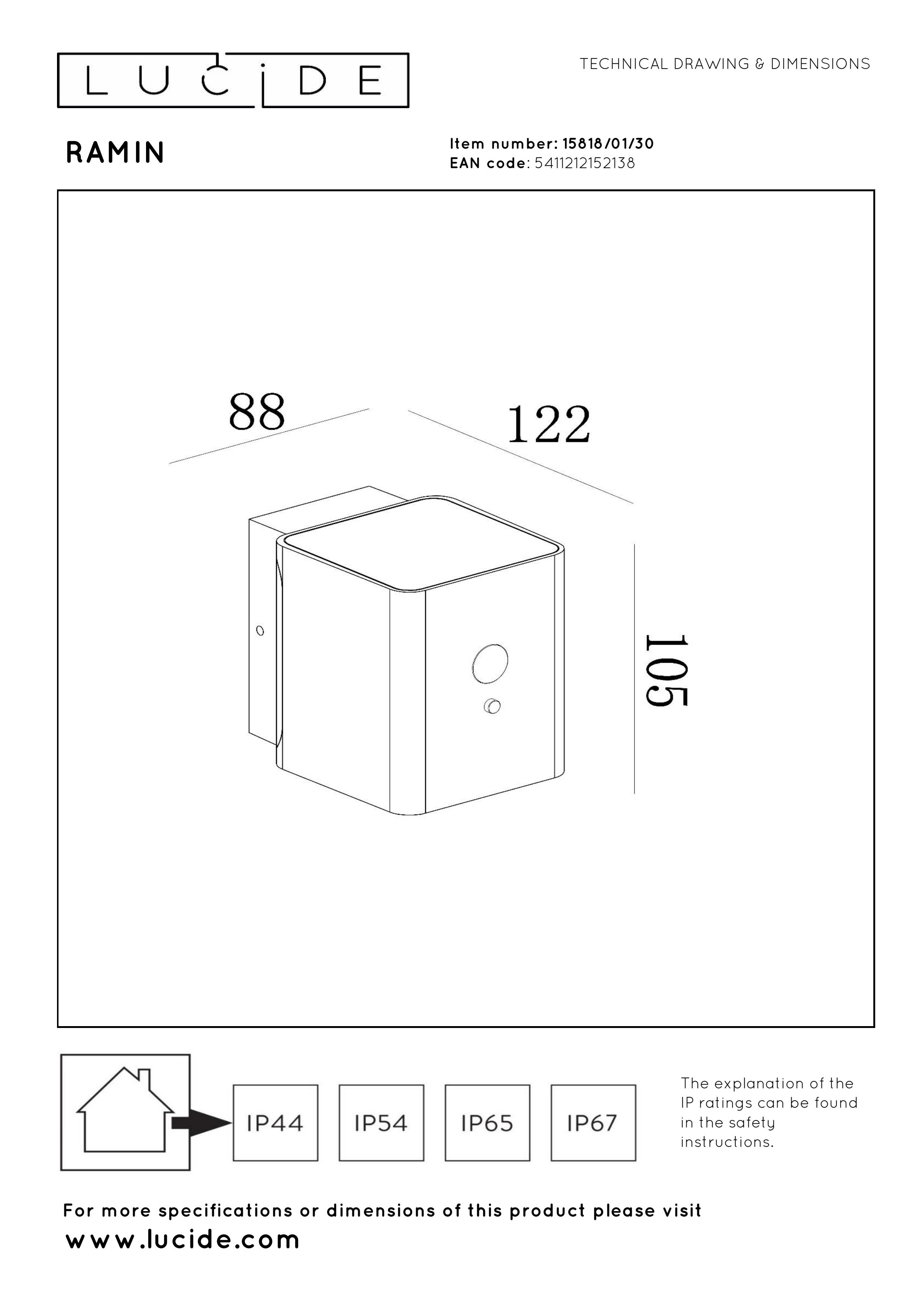 Lucide RAMIN - Applique murale- Énergie Solaire - LED Dim. - 1x1W 2850K/3150K - IP54- Détecteur De Mouvement & Jour/Nuit - Noir