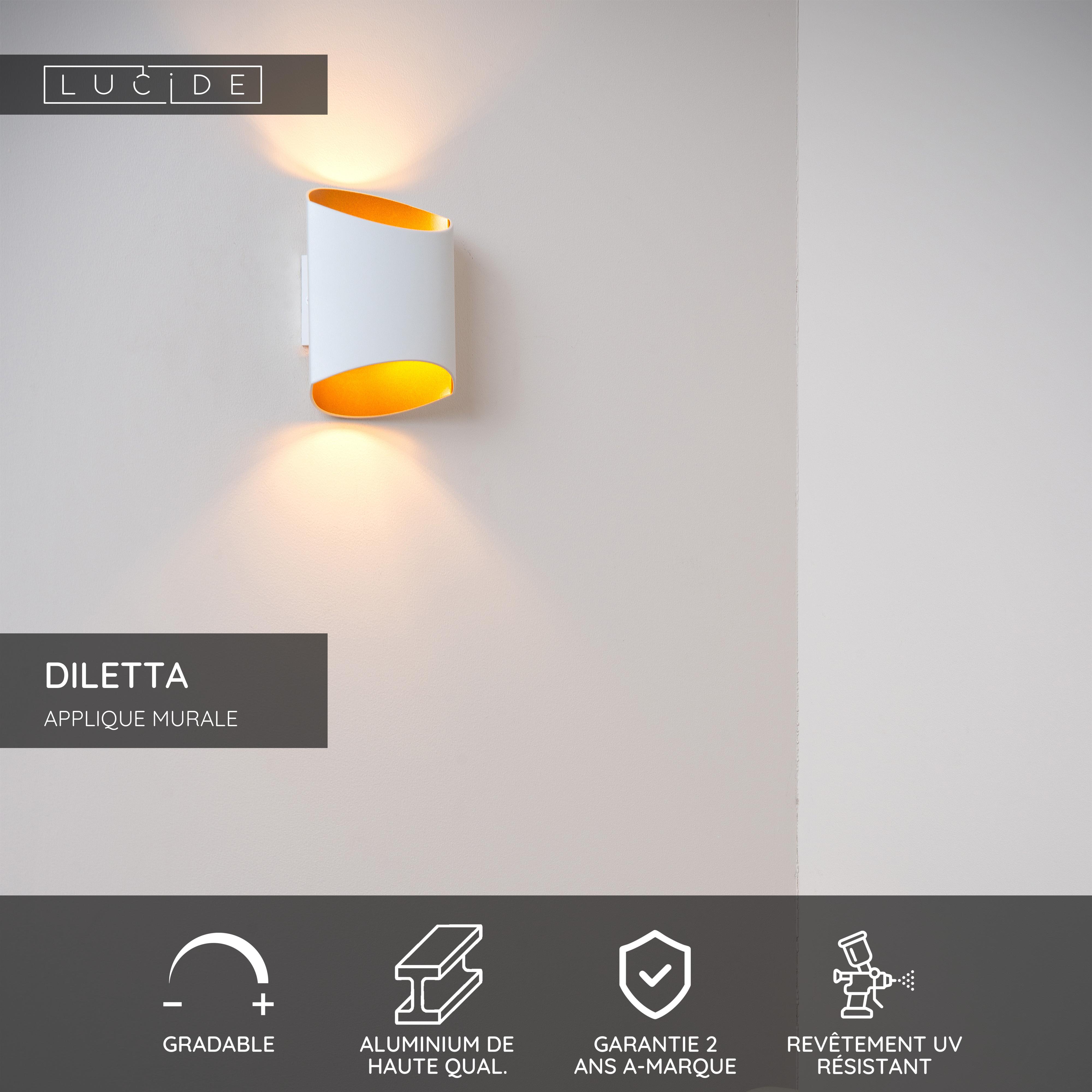 Votre intérieur manque encore de classe et de style ? Diletta règlera ce problème en un rien de temps. Cette élégante applique murale fascine par son design fluide et semi-circulaire. Avec sa source lumineuse enfermée dans un écrin d'aluminium de haute qualité, Diletta fournit simultanément un éclairage orienté vers le haut et vers le bas. Ses dimensions compactes de 16 x 8 x 18 centimètres et son poids ultra-léger renforcent le caractère intemporel de cette applique. Connectez le luminaire à un variateur d'intensité pour créer encore plus d'ambiance dans n'importe quelle pièce de la maison.