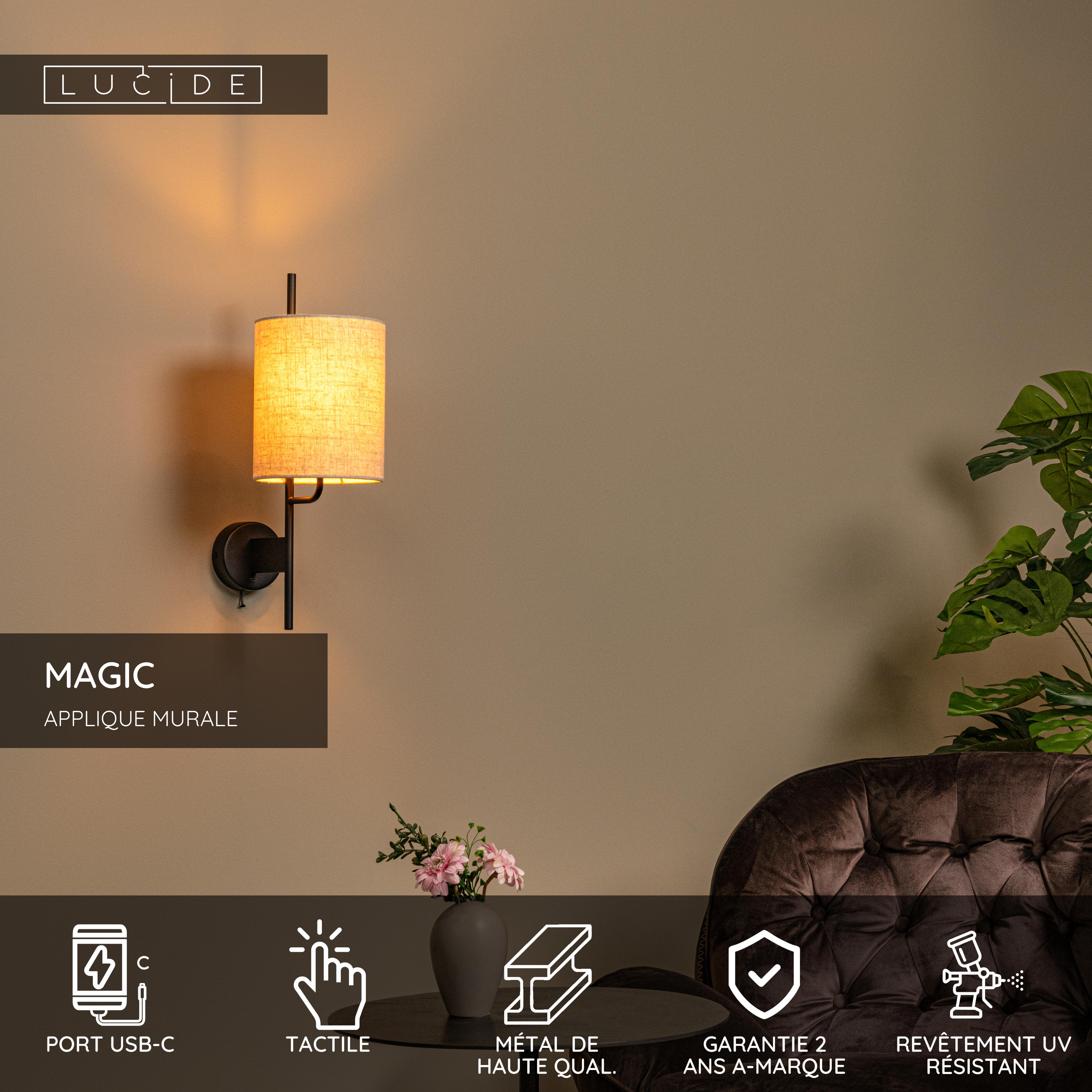 Lucide MAGIC - Applique murale - 1xE27 - Point de rechargement USB - Noir