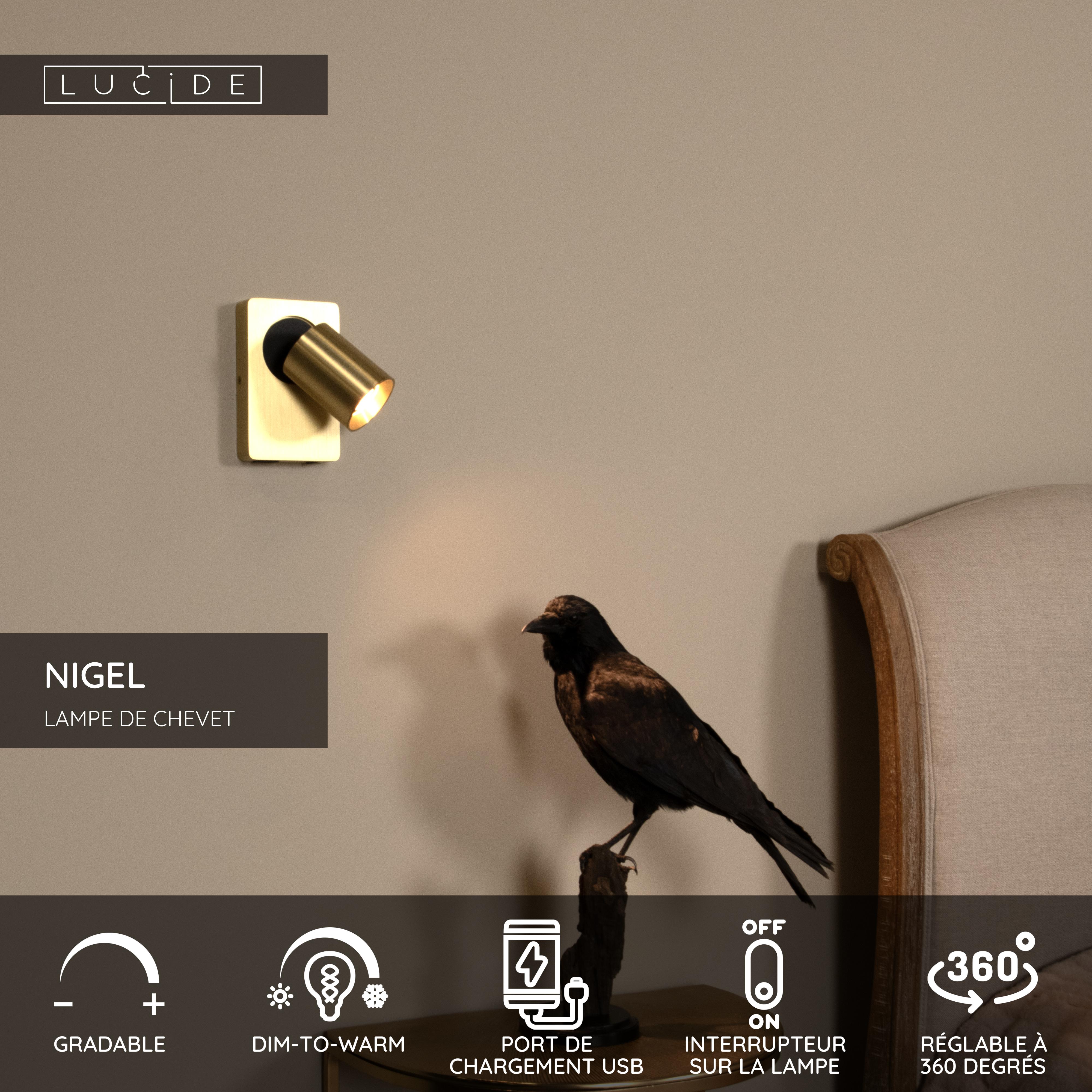 Lucide NIGEL - Lampe de chevet / Applique mural - LED Dim to warm - GU10 - 1x5W 2200K/3000K - Point de rechargement USB - Or Mat / Laiton