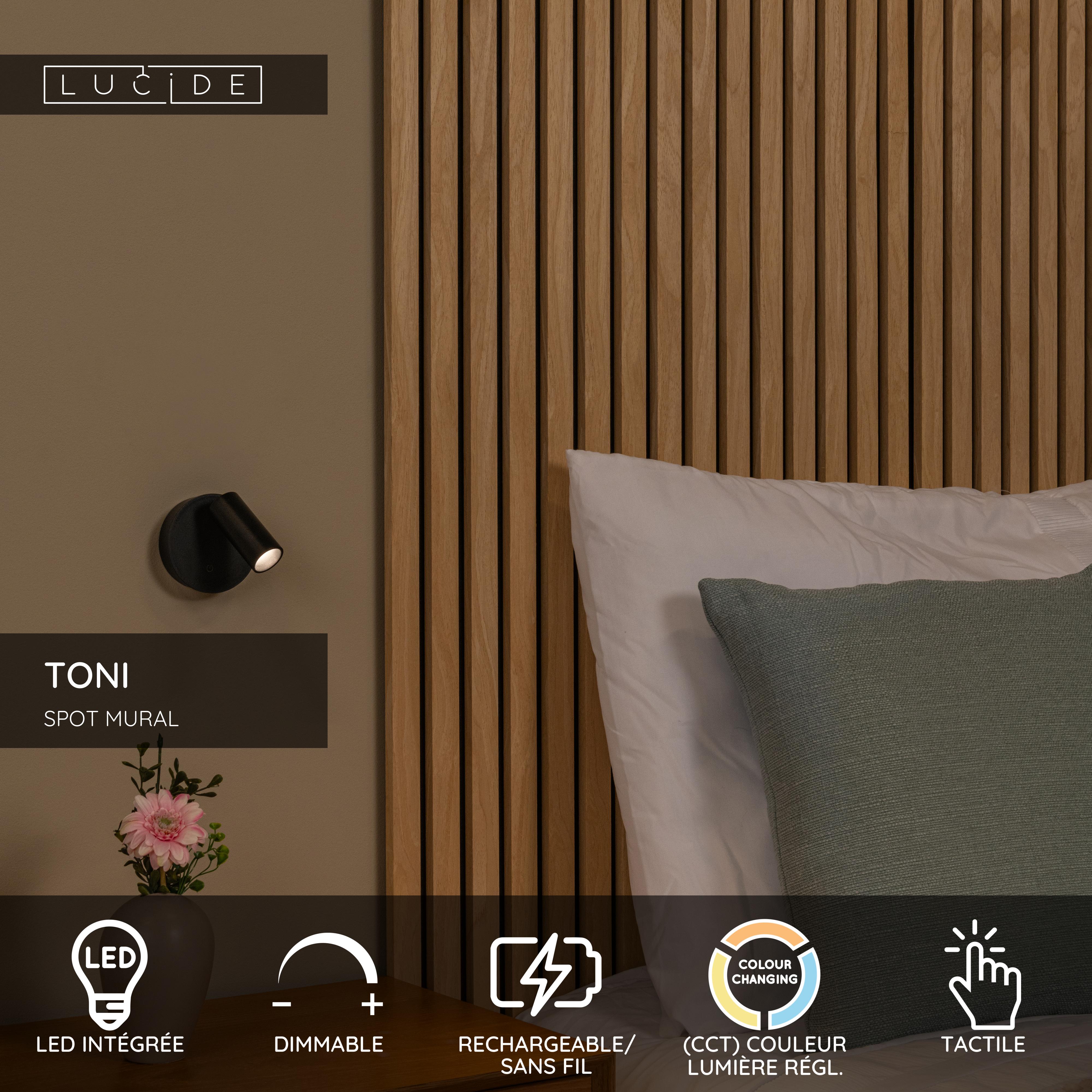 Lucide TONI - Spot mural / Applique mural Rechargeable - Batterie/Piles - Ø 8,1 cm - LED Dim. - CCT - 1x2W 2700K/4000K - Magnétique - Noir