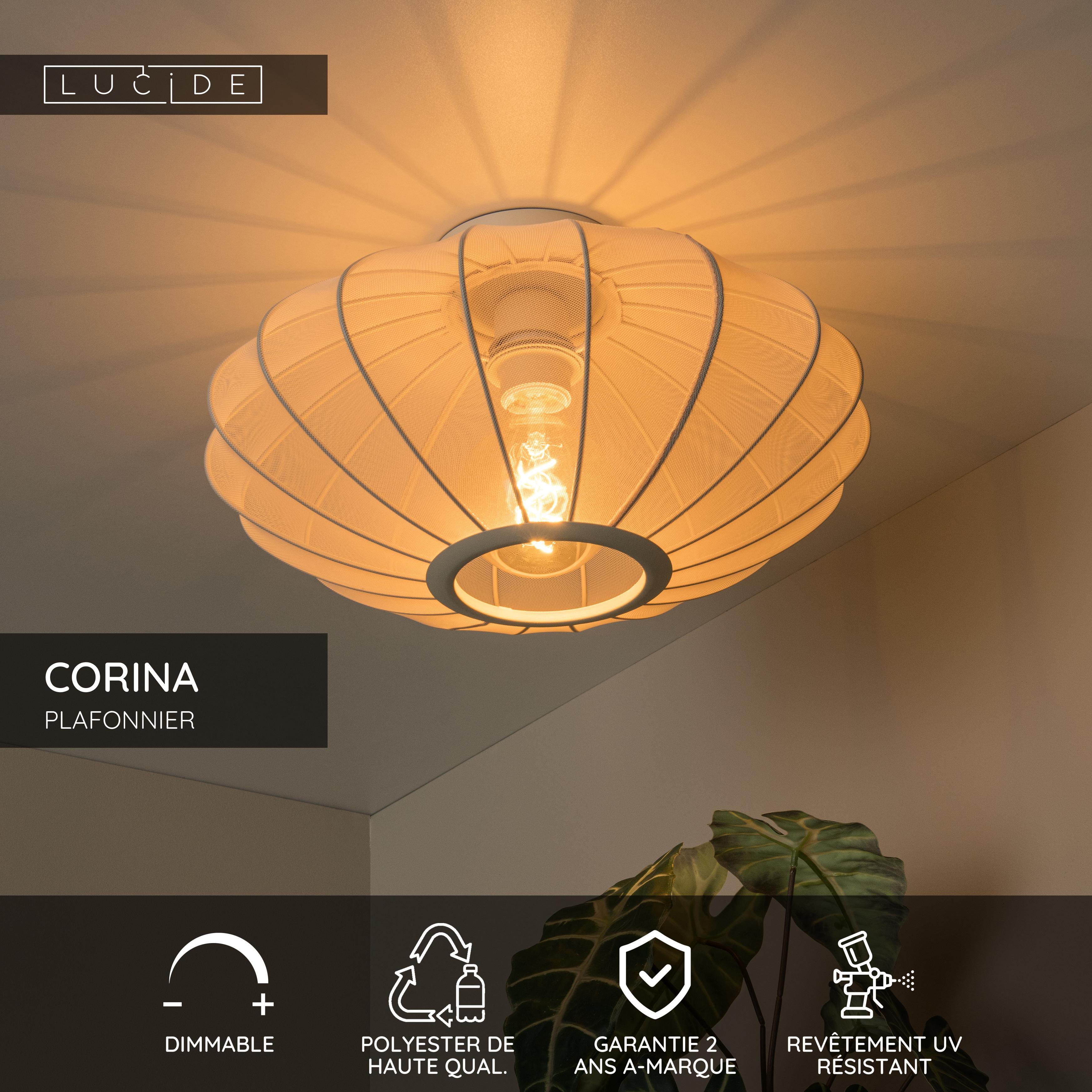 Corina est un plafonnier élégant qui diffuse une lueur douce et chaude. La finition dans un tissu de haute qualité de l'abat-jour, donne à Corina un aspect mystérieux. Ce plafonnier d'un diamètre de 40 centimètres est un succès garanti, surtout dans un salon confortable ou dans la chambre à coucher. La plaque de montage métallique d'une largeur de 12 centimètres est facile à fixer au plafond et la lampe peut se connecter à un variateur externe en toute simplicité. Moderne, enjouée et passionnée, Corina deviendra assurément la star de la pièce.