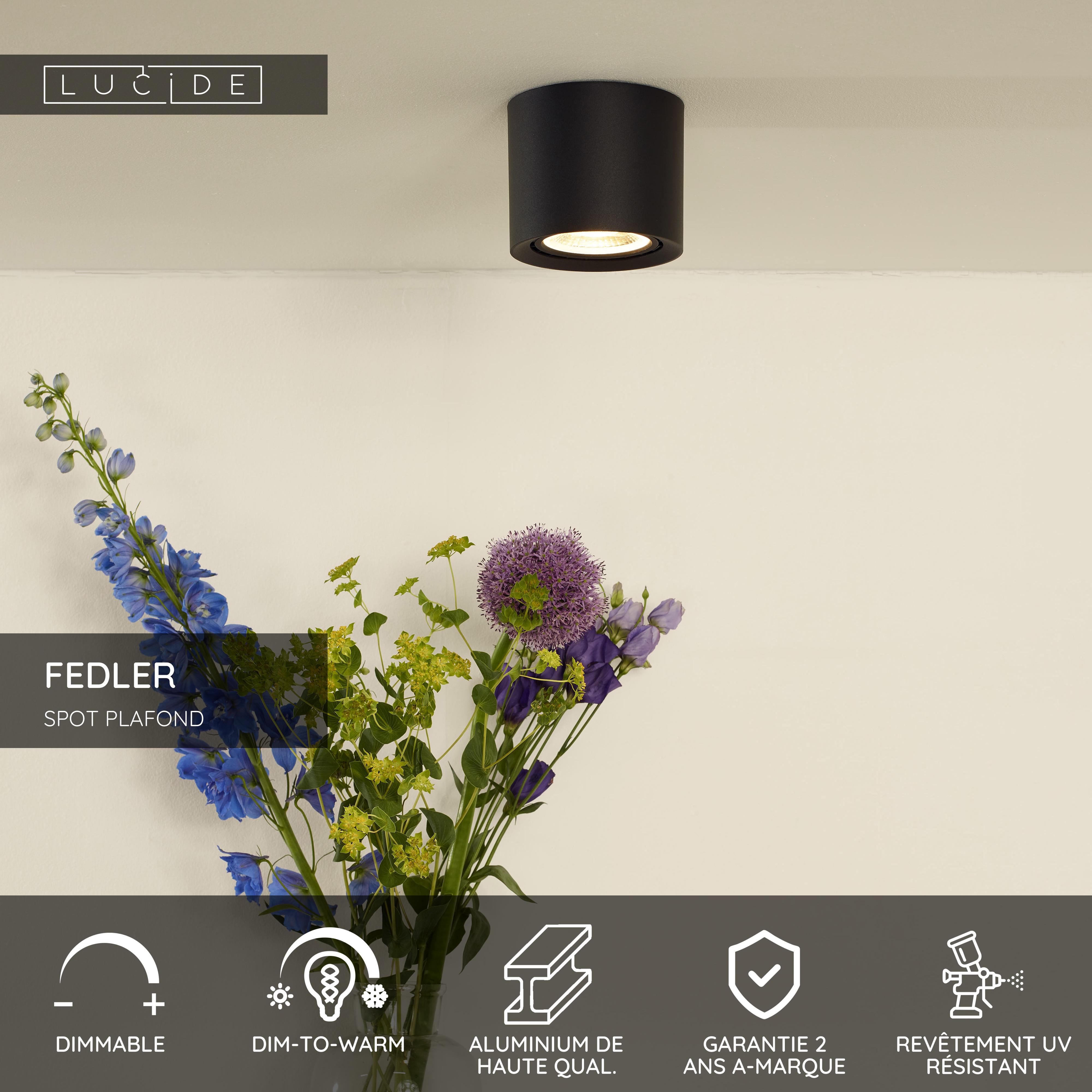 D'une élégance compacte, le spot plafond Fedler éclaire l'endroit que vous voulez à l'aide de son ampoule LED. Son diamètre réduit (12 cm) lui permet de s'insérer partout. Design géométrique, poids léger, le spot plafond Fedler est fabriqué en aluminium et se fixe facilement au plafond. Gagnez de l'espace avec des spot plafond pratiques ! Si vous installez aussi un régulateur d'intensité (non fourni), il vous est possible d'ajuster la luminosité ainsi que la température de couleur (3000K-2200K). Parfait pour en placer plusieurs à la suite sur les côtés d'une grande pièce... ou pour y tracer un chemin plus original.
