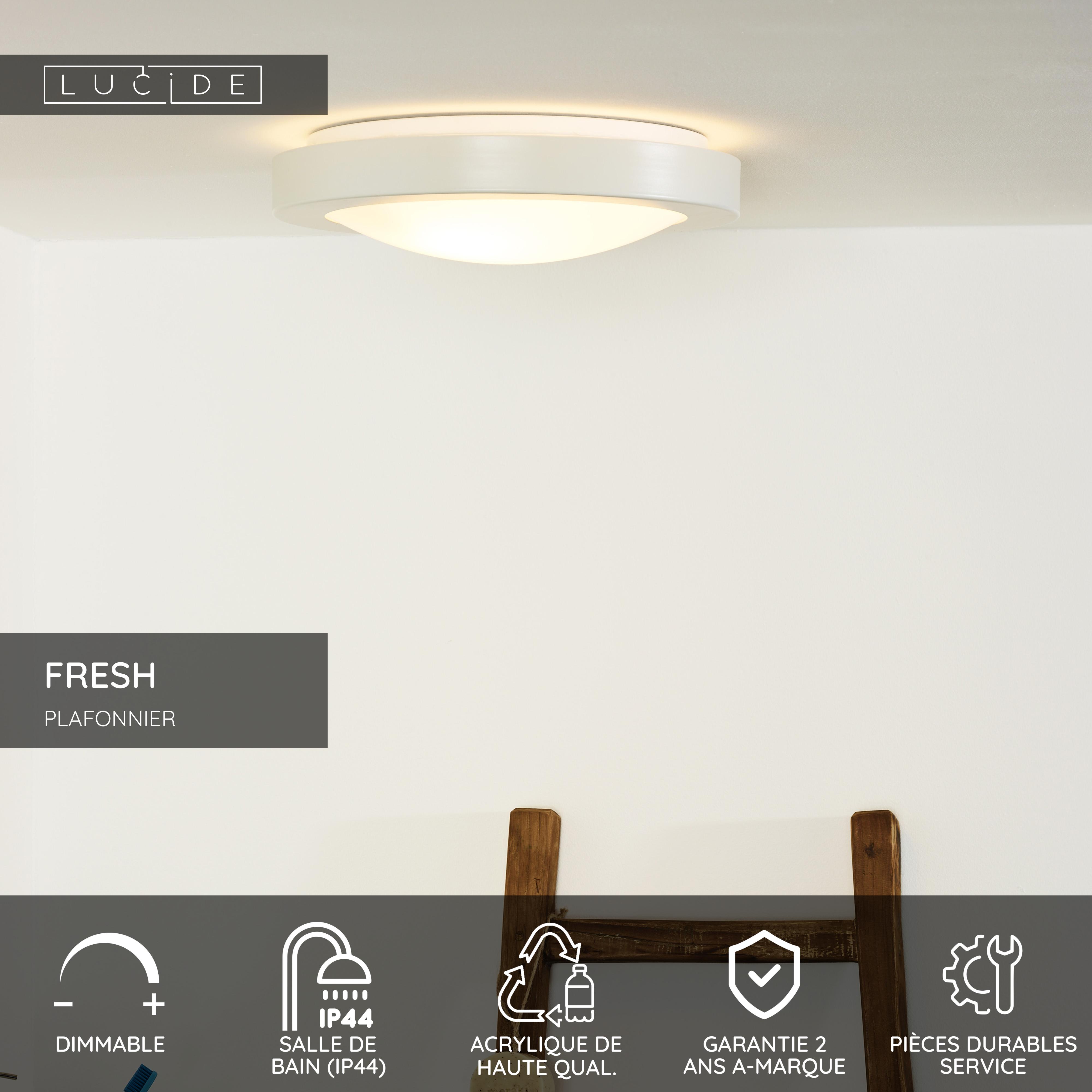 Le plafonnier Fresh de Lucide porte très bien son nom! Un design novateur avec une épaisseur de 9 cm, il s'adaptera facilement à n'importe quel plafond. En outre, avec son indice de protection de 44, il pourra être placé dans votre salle de bains. La finition blanche mate ou chrome mate lui confère une allure très élégante. Ce plafonnier est pourvu de 2 douilles E27 ce qui vous permettra d'installer une ampoule à économie d'énergie.