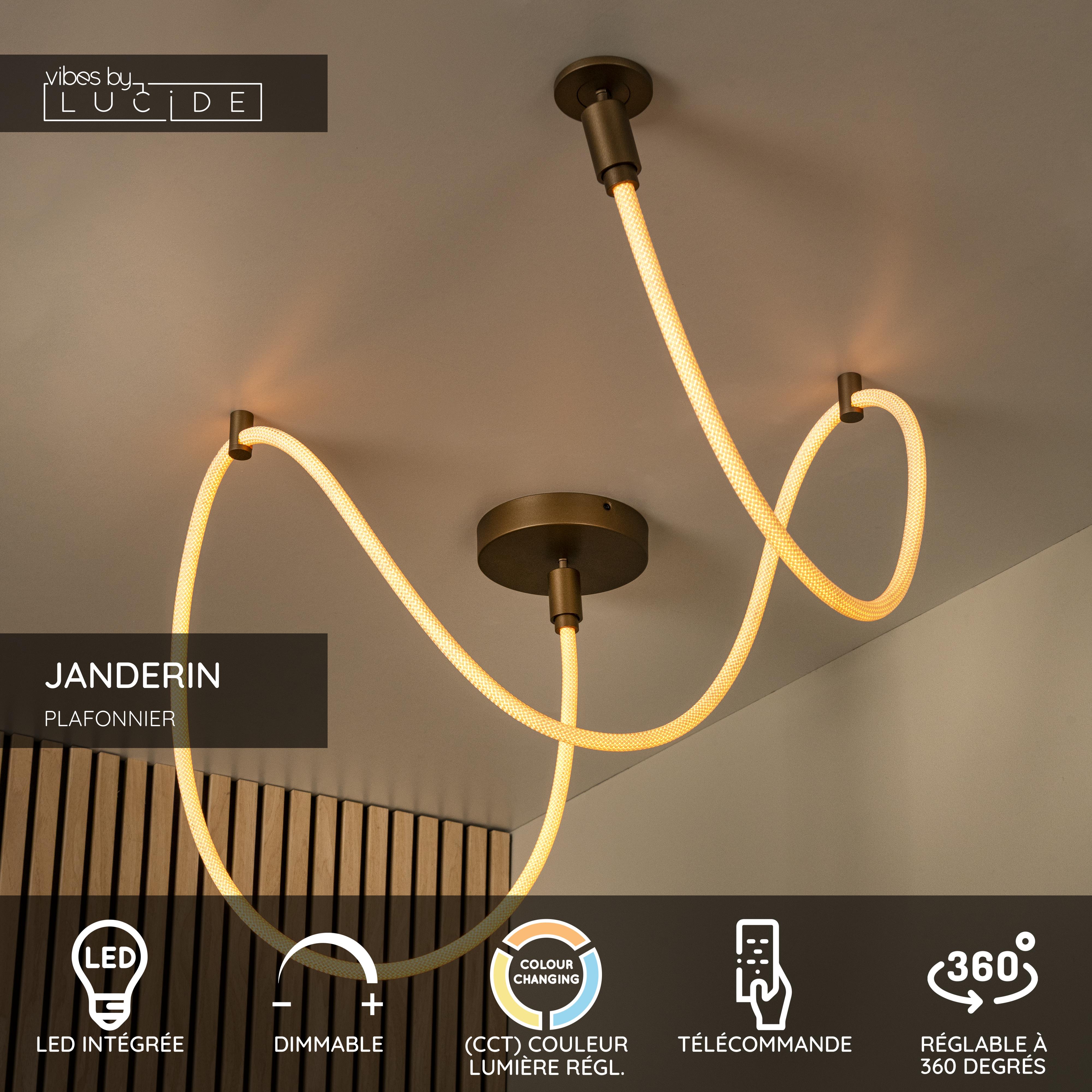 Offrez une mise à niveau impressionnante à votre intérieur avec le plafonnier JANDERIN de Lucide. Ce plafonnier exclusif en aluminium couleur champagne allie design raffiné et confort d’utilisation optimal. Grâce à la source LED intégrée (36W), vous sélectionnez facilement la température de couleur souhaitée entre 2700K et 4000K à l’aide de la télécommande fournie. La lampe est orientable, inclinable et réglable en hauteur avant installation, pour une flexibilité maximale. Avec une longueur de 300 cm, une largeur de 18 cm et une hauteur de 18 cm, JANDERIN illumine chaque pièce d’une douce lumière diffuse. Découvrez l’alliance parfaite entre technologie et élégance avec ce plafonnier intelligent.