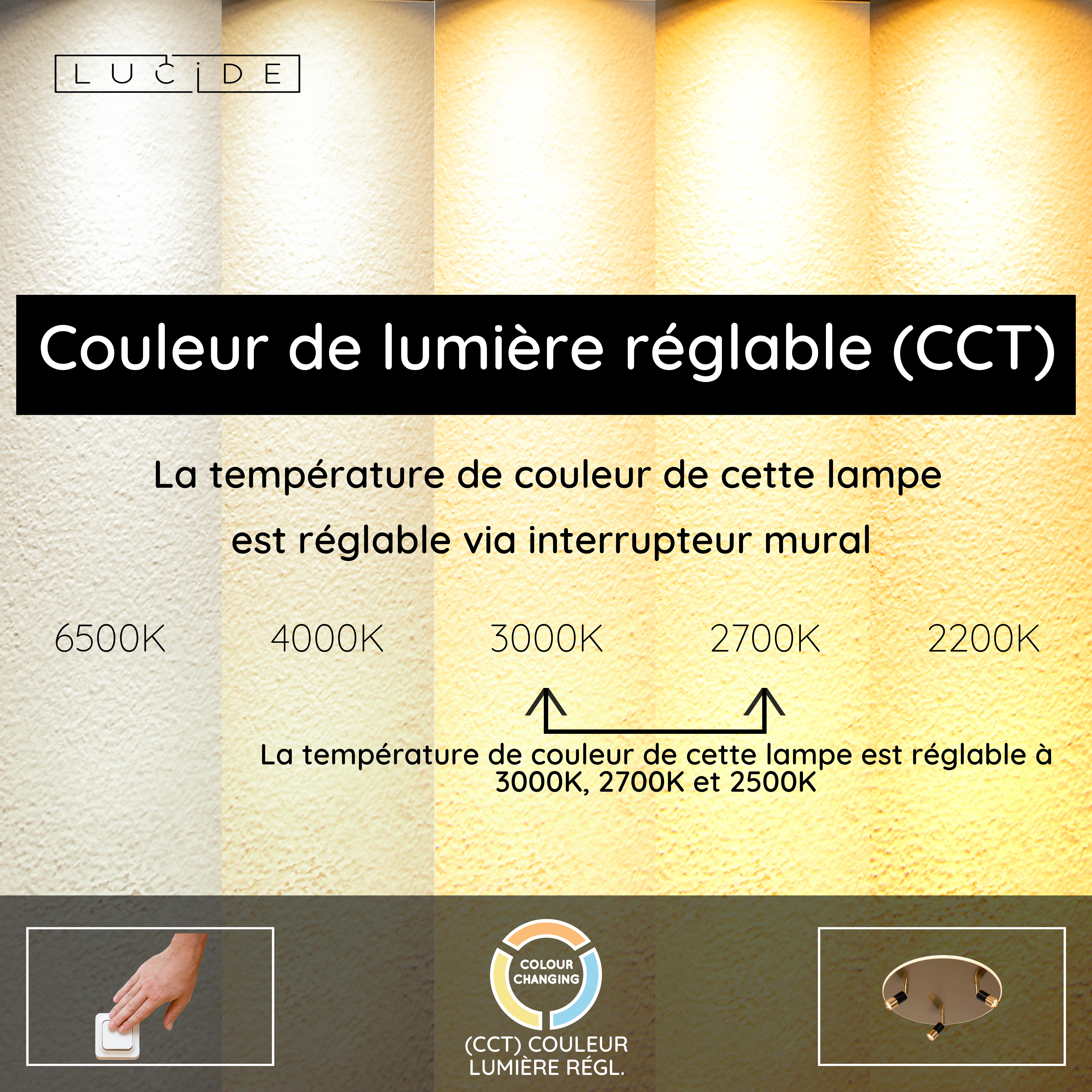 - Température de couleur réglable via interrupteur mural (2500K-3000K)