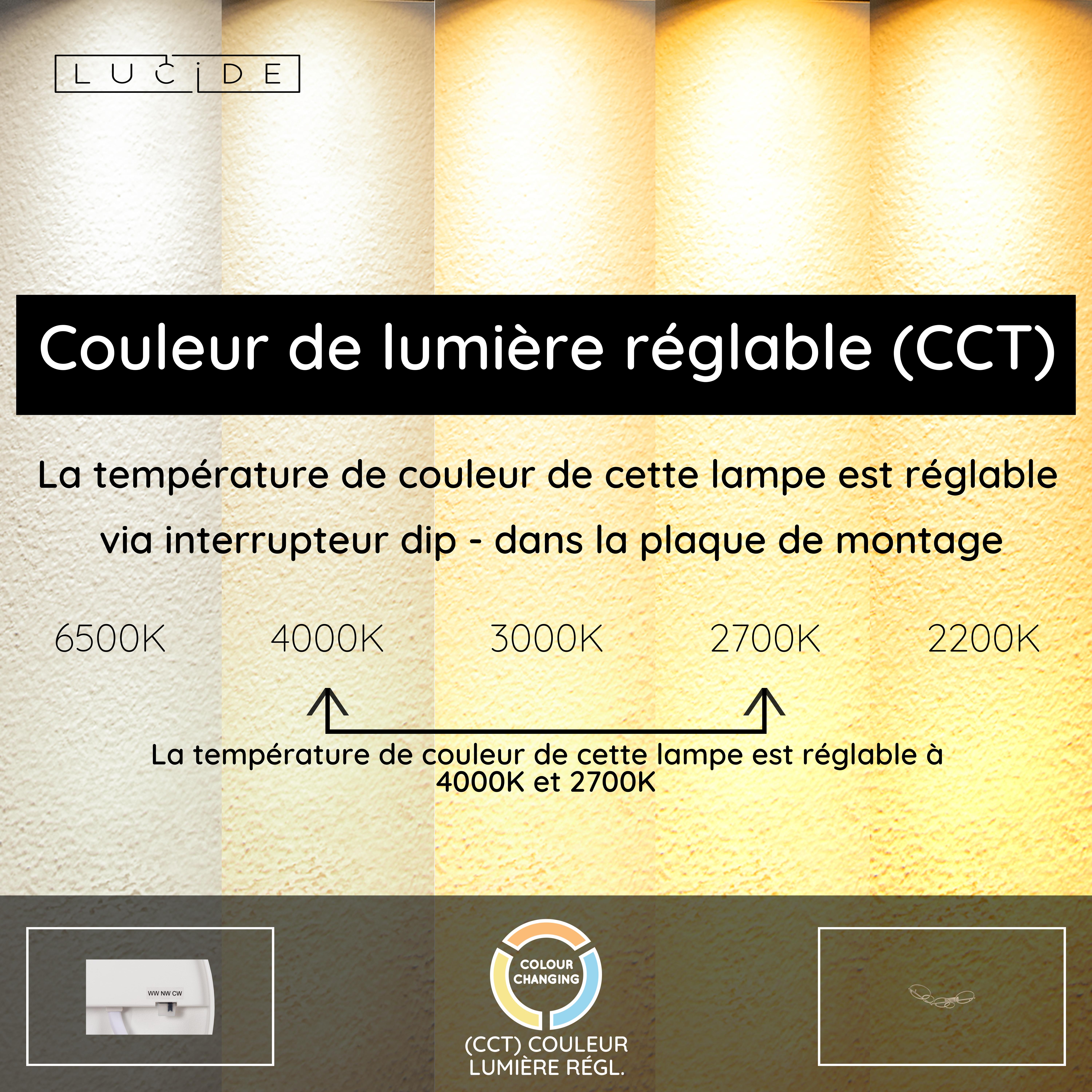 - Température de couleur réglable via interrupteur dip dans la plaque de montage (2700K-4000K)