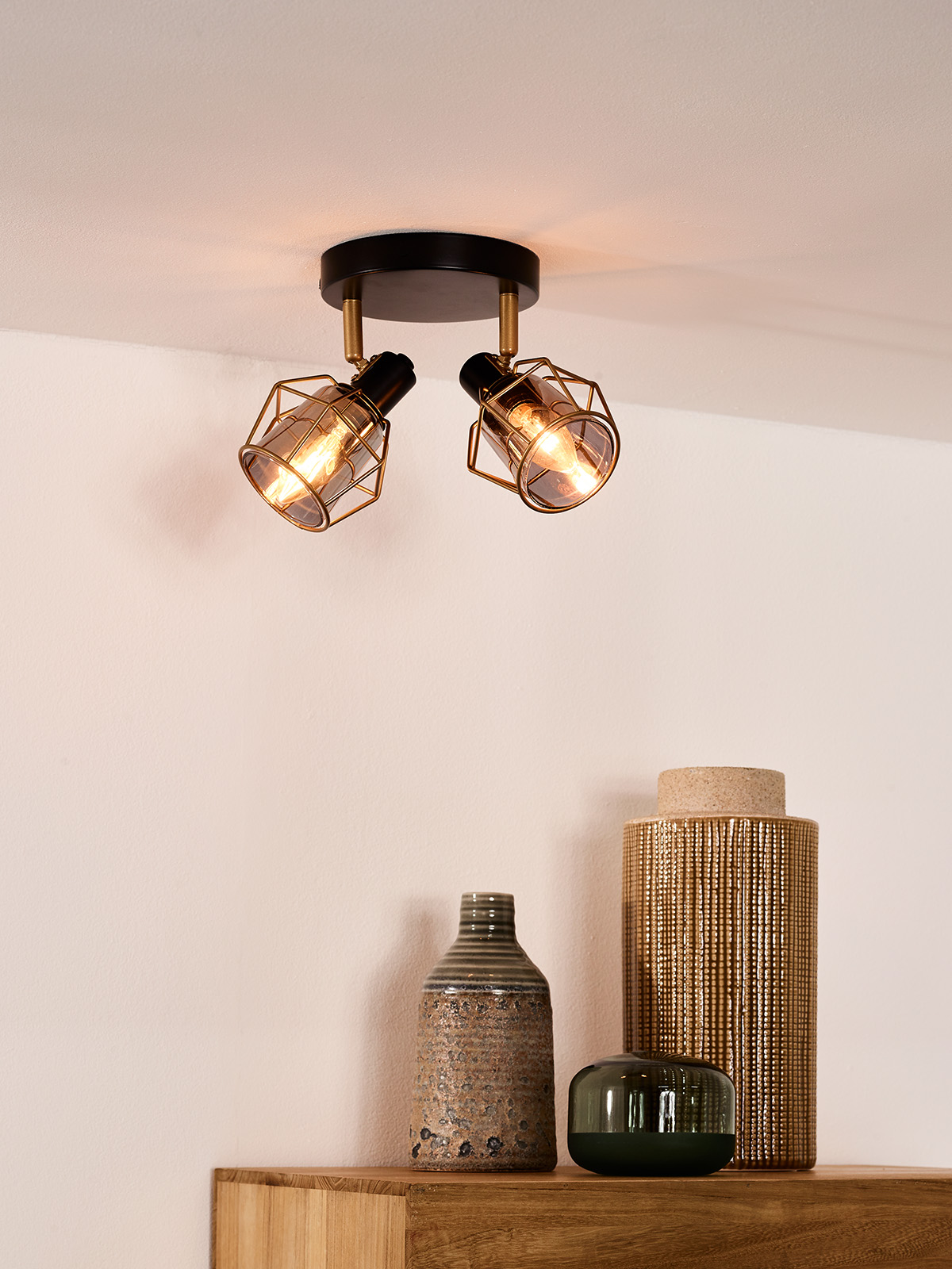 Dans votre entrée, votre salon, votre cuisine, votre salle à manger ou la pièce la plus petite de la maison : Nila, ce spot de plafond avec deux ampoules, a le droit d'être admiré. Sa conception spéciale attirera immédiatement les regards. Le noir du luminaire l'adoucit et la cage en laiton autour de l'abat-jour en verre la renforce. Magnifiquement équilibré et idéal pour tous les styles. Les points lumineux sont inclinables et rotatifs afin que vous puissiez bien diriger la lumière. Optez pour une ampoule LED pour profiter d'une lumière blanche et chaude supplémentaire et, si vous le souhaitez, connectez le luminaire à un gradateur de lumière pour créer l'atmosphère adéquate. Grâce à ses dimensions compactes (21 x 16 cm) et à la plaque de fixation, il sera également facile à fixer au plafond.