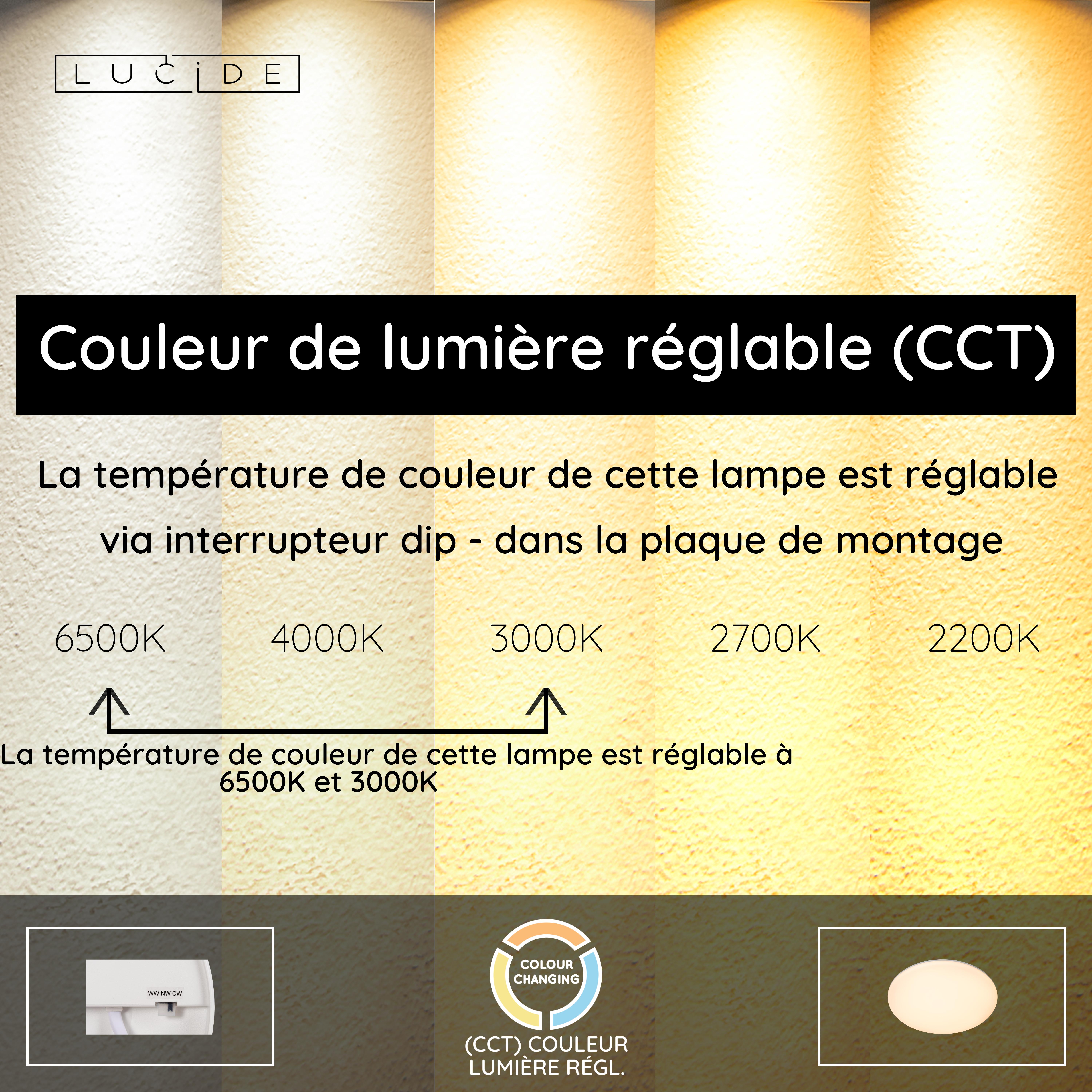 - Température de couleur réglable via interrupteur dip dans la plaque de montage (3000K-6500K)