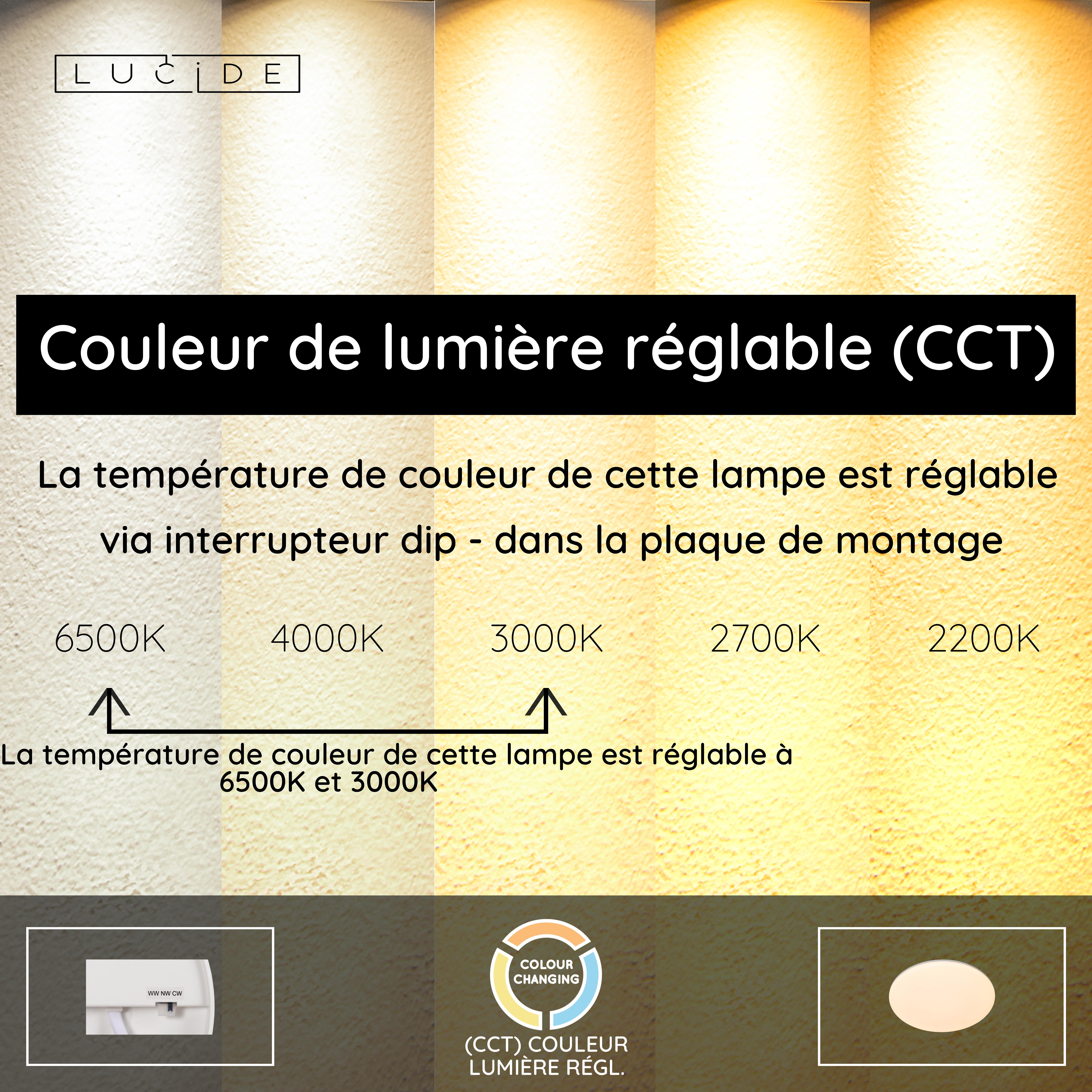- Température de couleur réglable via interrupteur dip dans la plaque de montage (3000K-6500K)