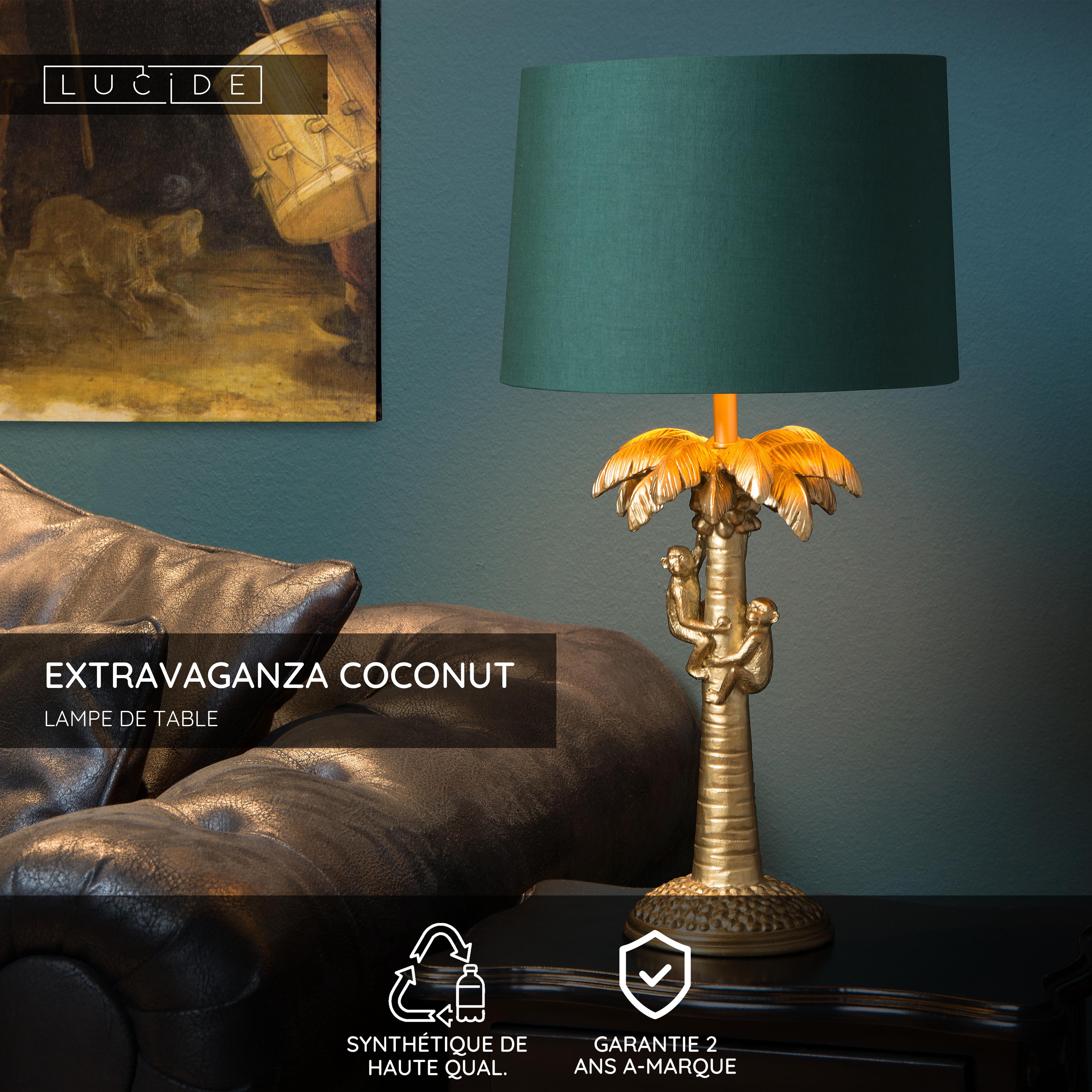 Envie de combiner une lampe de table fonctionnelle avec une touche ludique et extravagante ? Dans ce cas, Extravaganza Coconut est fait pour vous. Un décor exotique se cache sous l'abat-jour en coton au look classique. Deux chimpanzés grimpent sur un palmier. L'un cueille avec empressement des noix de coco tandis que l'autre, plus petit, le regarde avec approbation. La cime de l'arbre est mise en valeur par la lampe, qui diffuse sa lumière de manière uniforme. Le luminaire en plastique mesure un demi-mètre de haut et est compatible avec une ampoule LED. Il est facile à allumer et à éteindre grâce à l'interrupteur situé sur le cordon. Profitez du spectacle du nouvel objet accrocheur de votre intérieur.