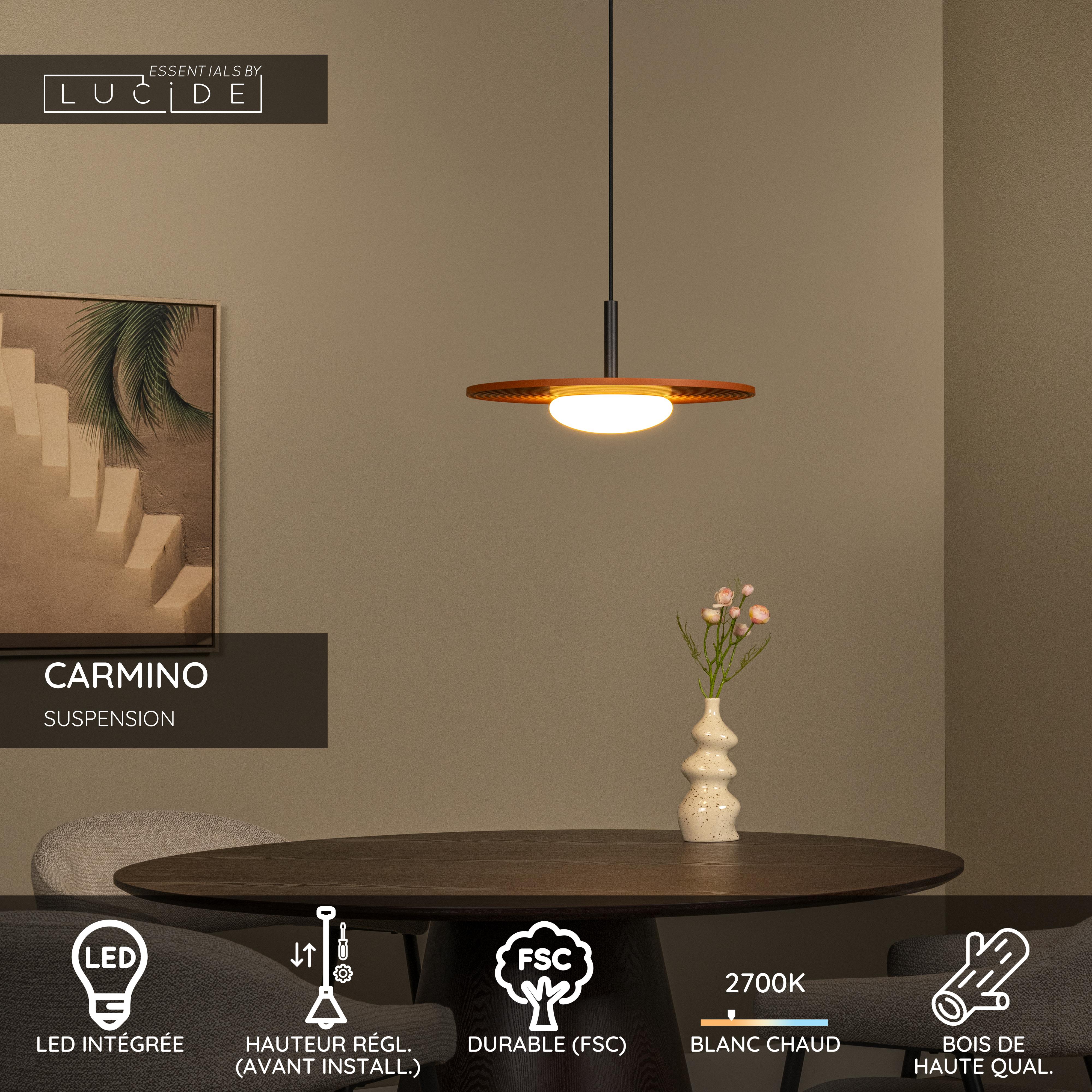 Apportez chaleur et élégance naturelle à votre intérieur avec CARMINO, une suspension élégante fabriquée en bois certifié FSC. La source lumineuse LED intégrée diffuse une lumière blanc chaud agréable de 3000K, parfaite au-dessus de la table à manger ou dans le salon. Cette suspension est réglable en hauteur avant l’installation et se connecte facilement à un interrupteur mural (non inclus). Avec un diamètre de 38,7 cm et une hauteur maximale de 142 cm, CARMINO allie éclairage d’ambiance et design moderne. Ajoutez une touche de design durable à votre espace et commandez cette suspension dès aujourd’hui.