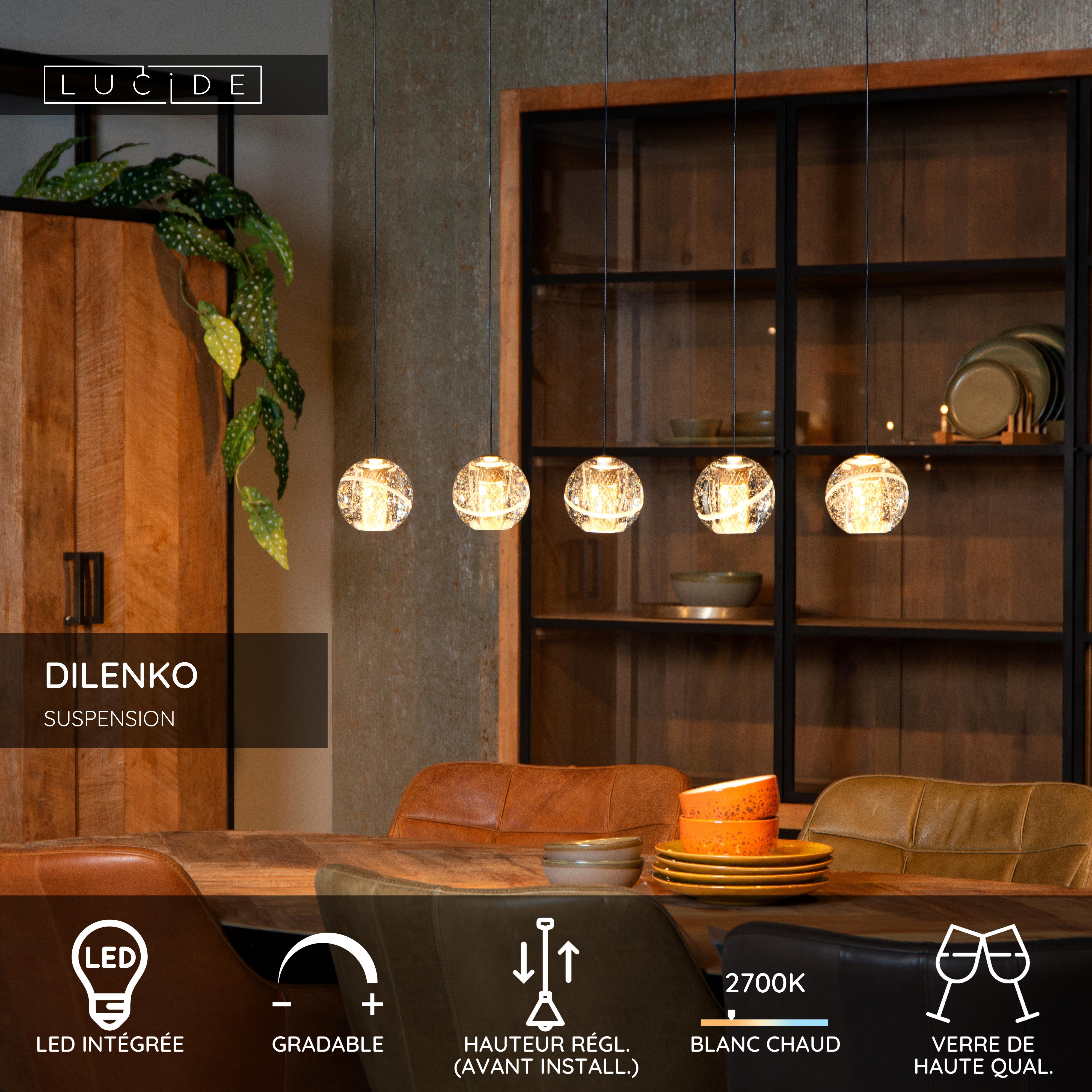 Avec Dilenko, imaginez-vous dans un élégant appartement parisien ou dans une luxueuse demeure de Los Angeles. L'association du design, des couleurs et des matériaux confère à cette lampe suspendue une allure moderne et élégante. Depuis la plaque de plafond en laiton, cinq suspensions réglables en hauteur descendent en rangée. Ces suspensions se terminent par des abat-jours en verre minimalistes et sphériques aux détails raffinés. Ils dissimulent des sources lumineuses LED intégrées qui diffusent une lumière blanche et chaleureuse dans la pièce. En connectant Dilenko à un variateur d'intensité, vous pouvez créer l'ambiance parfaite.