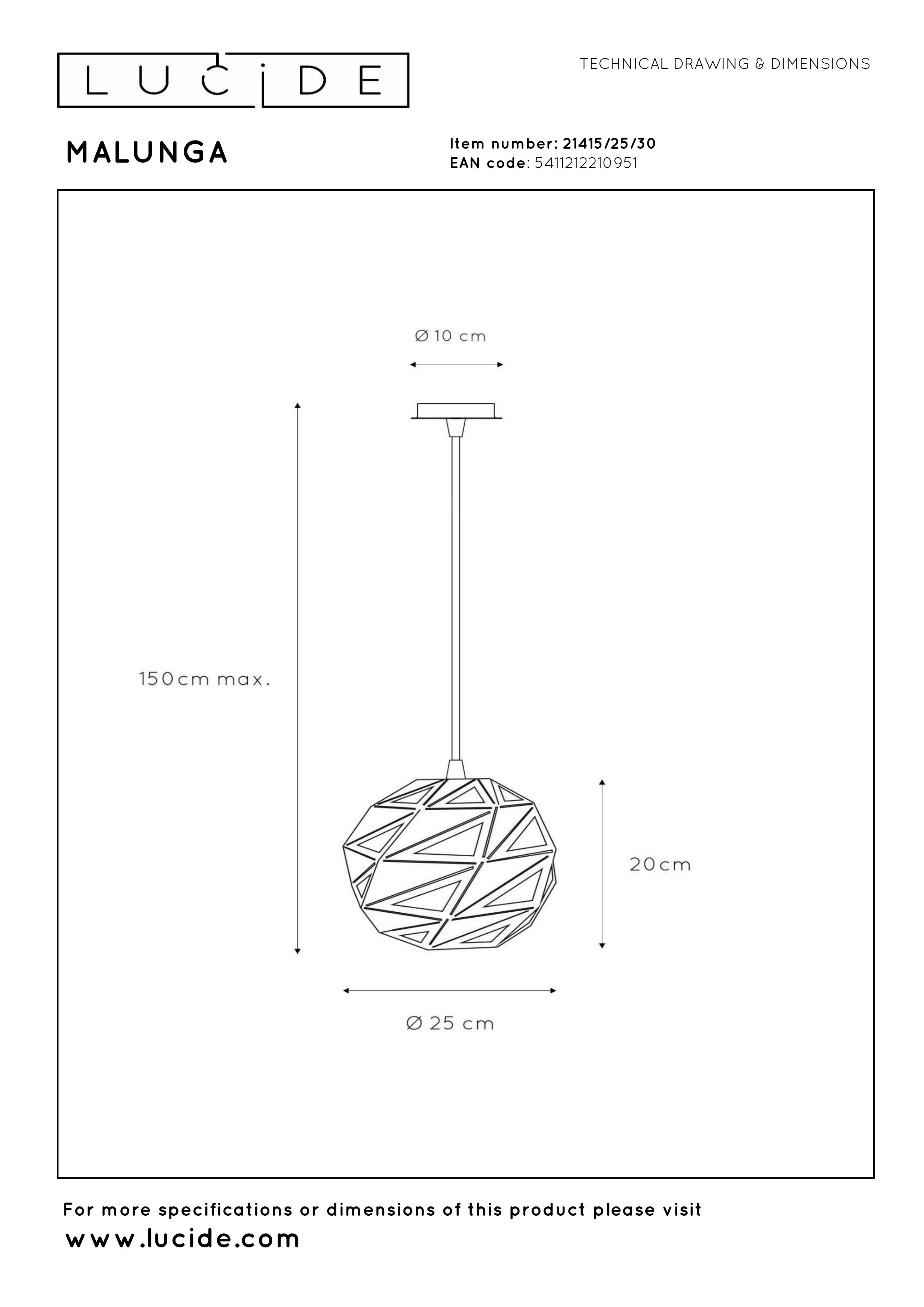 Profitez du dialogue entre lumière et géométrie avec la suspension Malunga. Son nom exotique s'accorde parfaitement à l'ambiance mystérieuse que dégage cet eye-catcher moderne. Malunga ajoutera une touche unique à votre intérieur. La suspension est réglable en hauteur (de 30 à 150 centimètres). La sphère en métal de haute qualité propagera une lumière diffuse. Avec son design 3D créatif, Melunga créera un spectacle fascinant qui vous impressionnera, vous et vos invités.