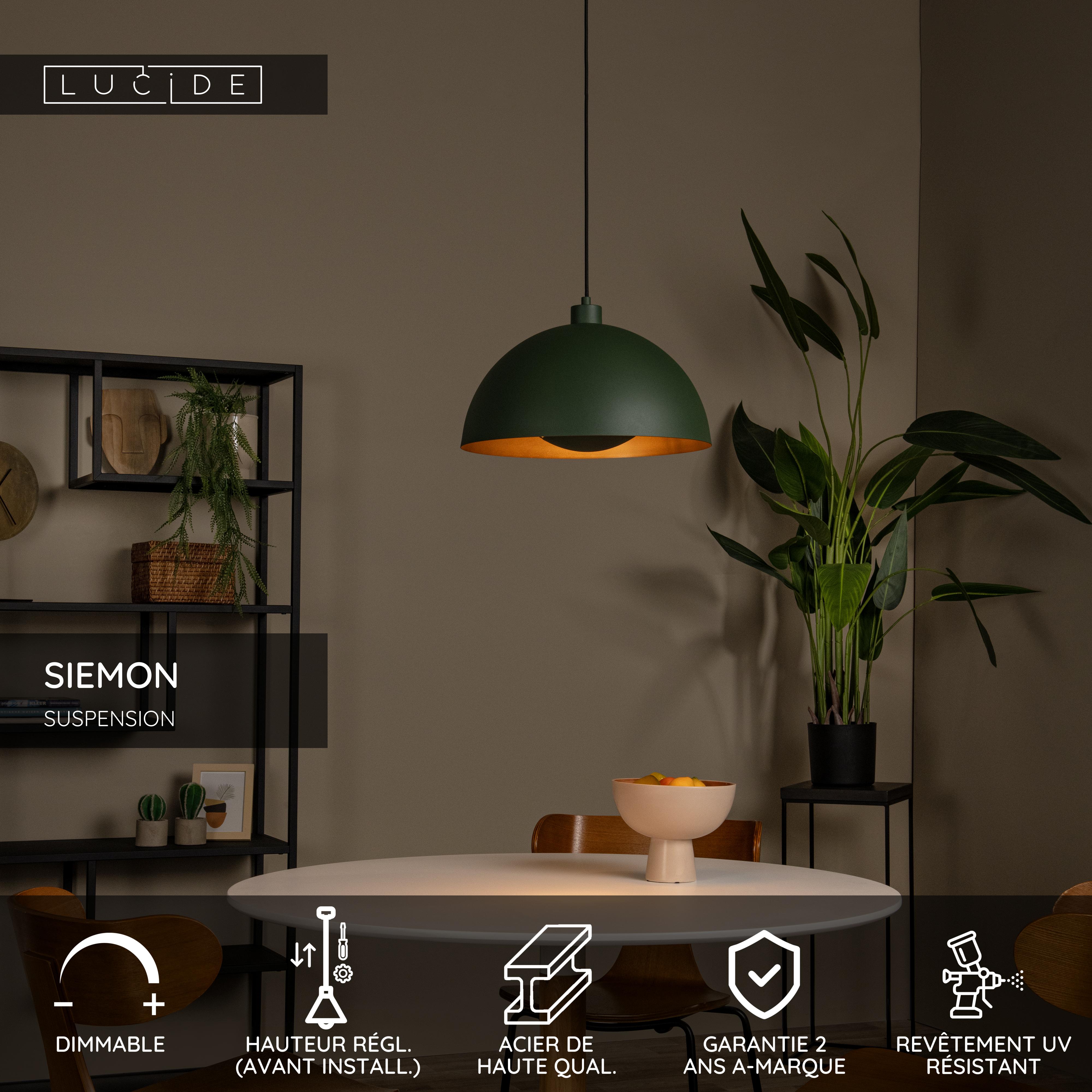 Ceux qui apprécient les lampes modernes agrémentées d'une touche rétro, aimeront à coup sûr Siemon. Cette lampe suspendue fabriquée en acier de haute qualité illuminera votre salon, votre salle à manger ou votre chambre à coucher. Avec son design et son diamètre de 40 centimètres, Siemon est à la fois charmante et moderne. Au milieu de l'abat-jour semi-circulaire se trouve un disque fixé autour de la source lumineuse située au-dessus. La lumière se reflète ainsi parfaitement le long des parois de l'abat-jour. Connectez le luminaire à un variateur et choisissez la hauteur adaptée à votre espace, jusqu'à 150 centimètres pour créer l'atmosphère idéale.