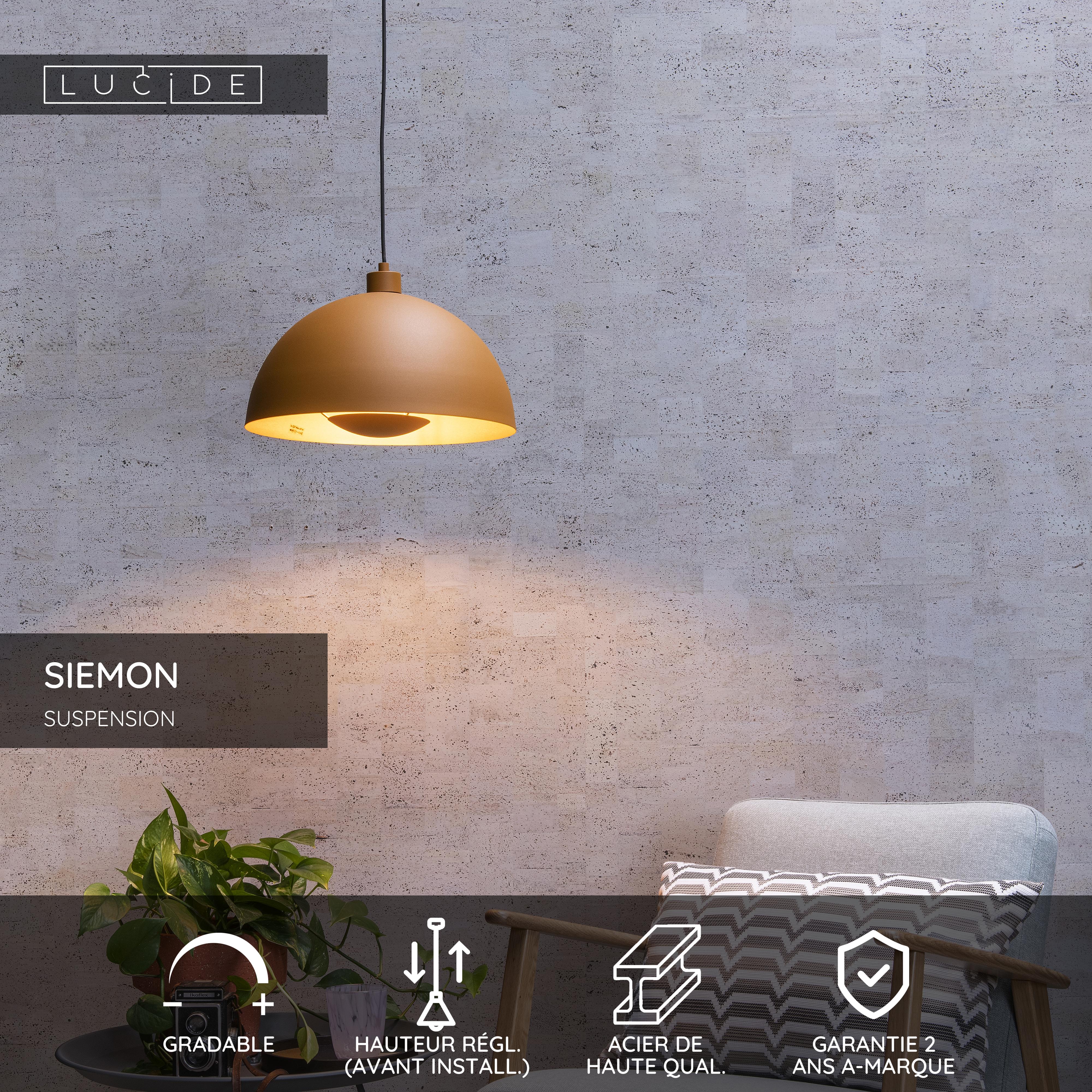 Ceux qui apprécient les lampes modernes agrémentées d'une touche rétro, aimeront à coup sûr Siemon. Cette lampe suspendue fabriquée en acier de haute qualité illuminera votre salon, votre salle à manger ou votre chambre à coucher. Avec son design et son diamètre de 40 centimètres, Siemon est à la fois charmante et moderne. Au milieu de l'abat-jour semi-circulaire se trouve un disque fixé autour de la source lumineuse située au-dessus. La lumière se reflète ainsi parfaitement le long des parois de l'abat-jour. Connectez le luminaire à un variateur et choisissez la hauteur adaptée à votre espace, jusqu'à 150 centimètres pour créer l'atmosphère idéale.