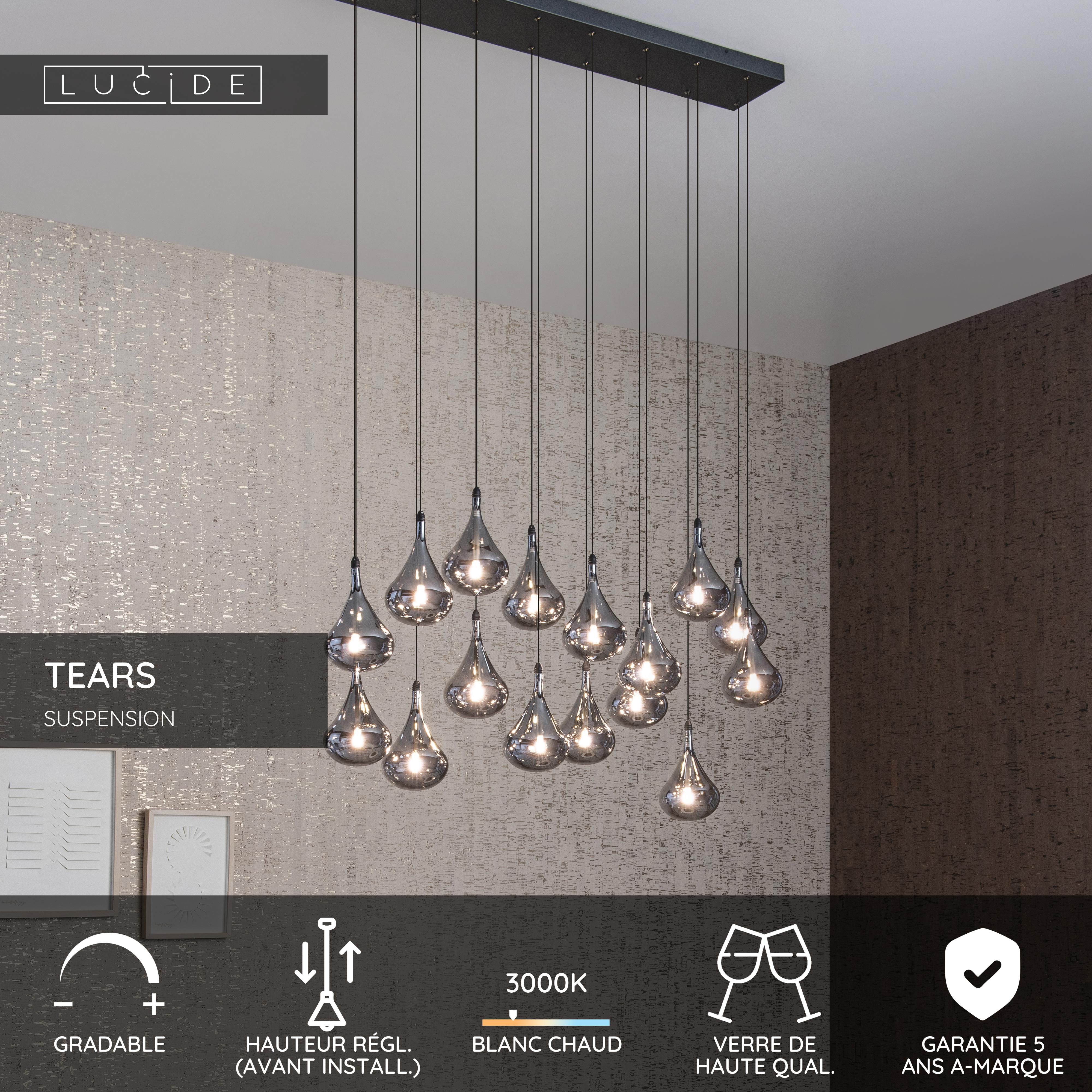 Tears est un luminaire qui en impose avec ses sphères équilibrées en forme de goutte d'eau. Cette lampe suspendue porte très bien son nom avec le design de ses abat-jour en verre. Elle regroupe 16 sources de lumière sur sa plaque de plafond rectangulaire en métal. La hauteur de chaque larme peut varier entre 60 et 154 centimètres. Avec sa longueur de 106 centimètres, ce lustre trouvera parfaitement sa place au-dessus d'une table à manger moderne. La lampe suspendue est équipée de sources lumineuses LED d'un blanc chaud à intensité variable. Vous pouvez également relier Tears à un gradateur pour encore plus d'ambiance.