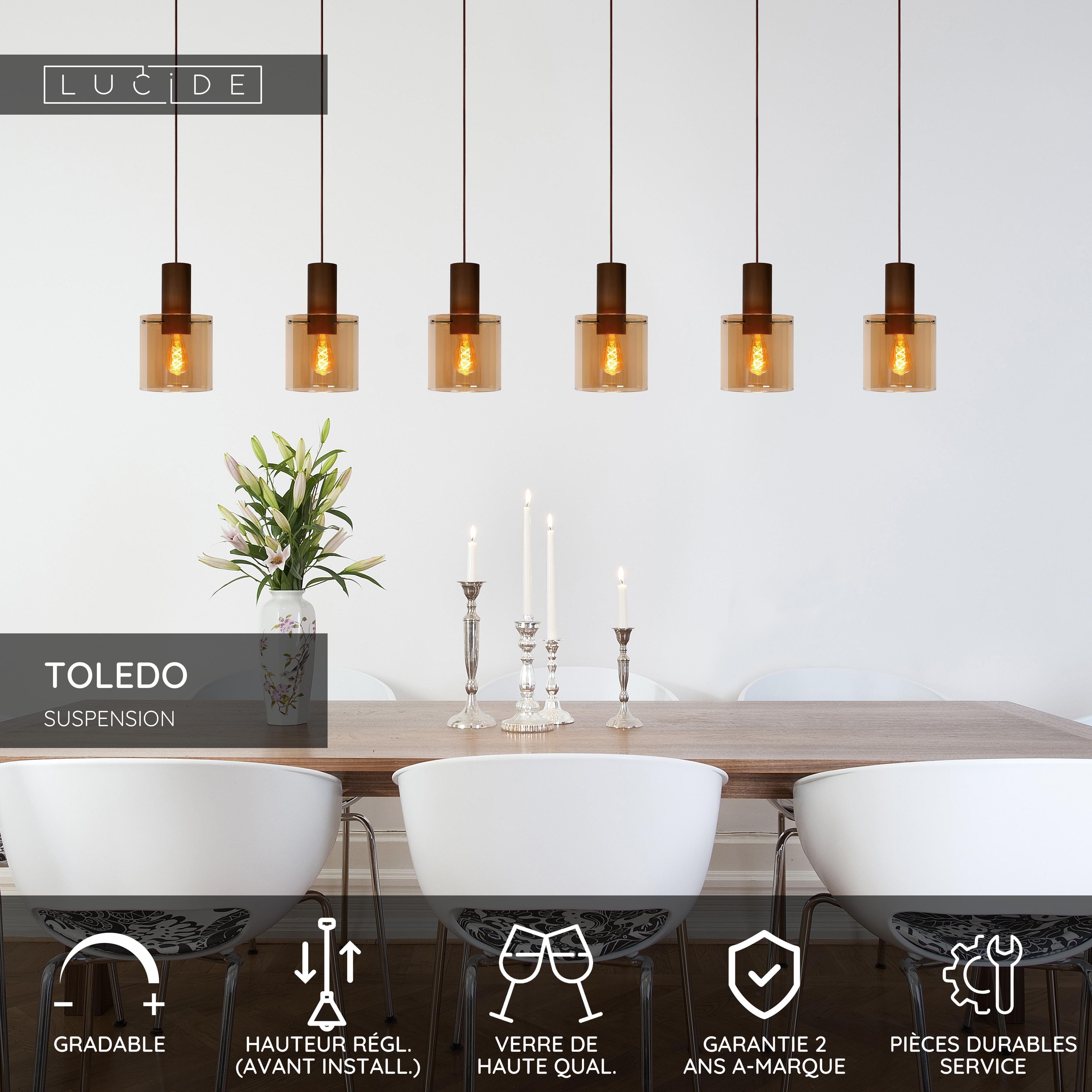 Une suite de trois met en avant le design particulièrement seyant. Cette suspension, Toledo, a pour objectif de fournir ambiance et confort à votre salle à manger. Le contraste que forme le verre ambré avec la partie cuivrée de l'abat-jour en aluminium rayonne de chaleur. Le subtil motif bois appliqué dans le cuivre y contribue également. Ce lustre est réglable en hauteur et peut être équipé d'un variateur. Avec les ampoule LED adaptées, Toledo apportera une touche un brin vintage à votre intérieur.