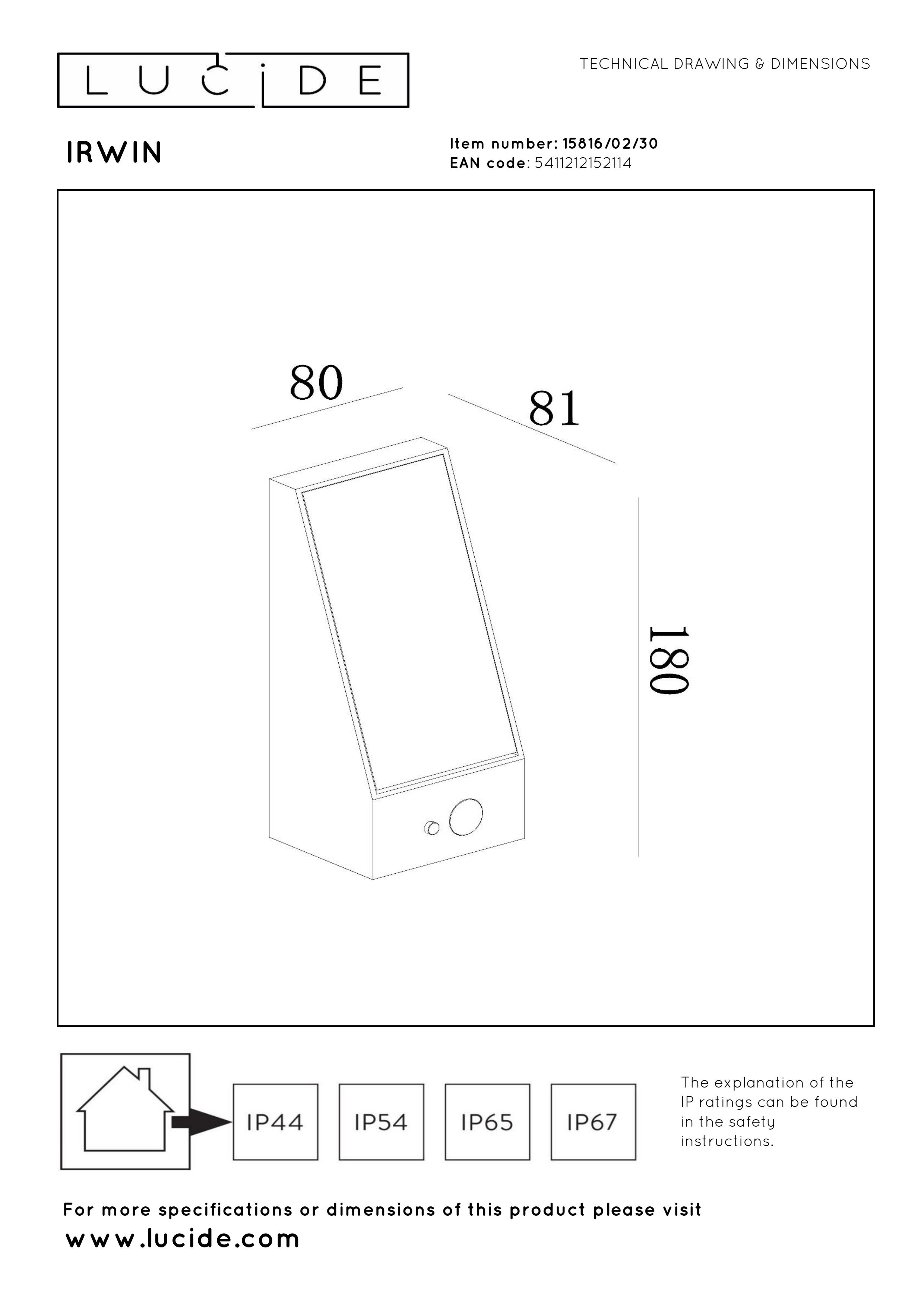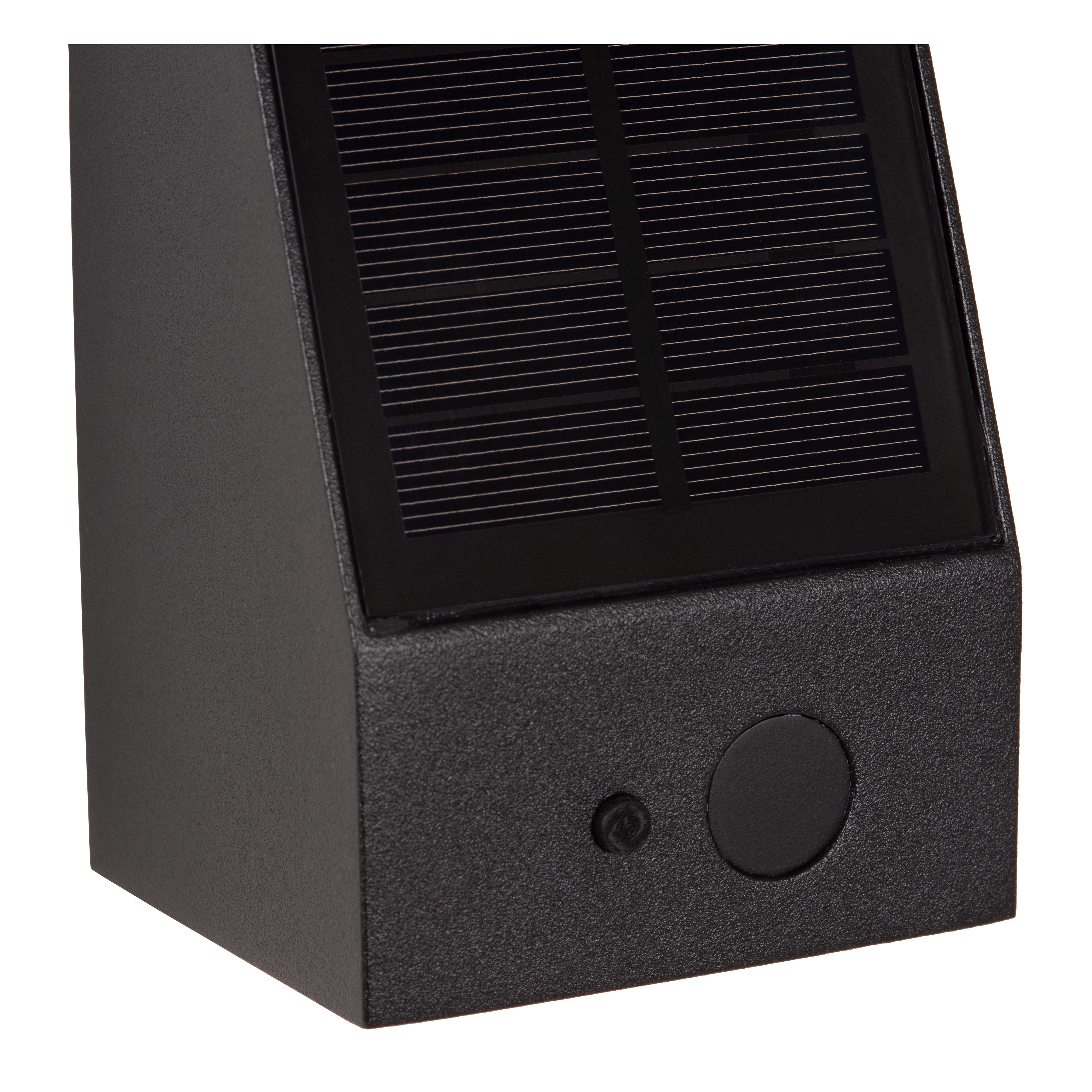 Een schuin aflopende aluminium wandarmatuur met een rechthoekige onderrand. Zo combineert Irwin esthetiek met praktische voordelen. Het moderne design past vlot in elke buitenomgeving. Het praktische zit bij deze wandlamp onder meer in de geïntegreerde zonnecellen op de schuine zijde. En er is meer. Via de dag/nacht-sensor heb je altijd voldoende licht wanneer het nodig is, maar vermijd je overbodig energieverbruik en zet je zelfs de zonne-energie heel bewust en doelgericht in. Irwin is bovendien dimbaar en beantwoordt zo nog beter aan jouw wensen.