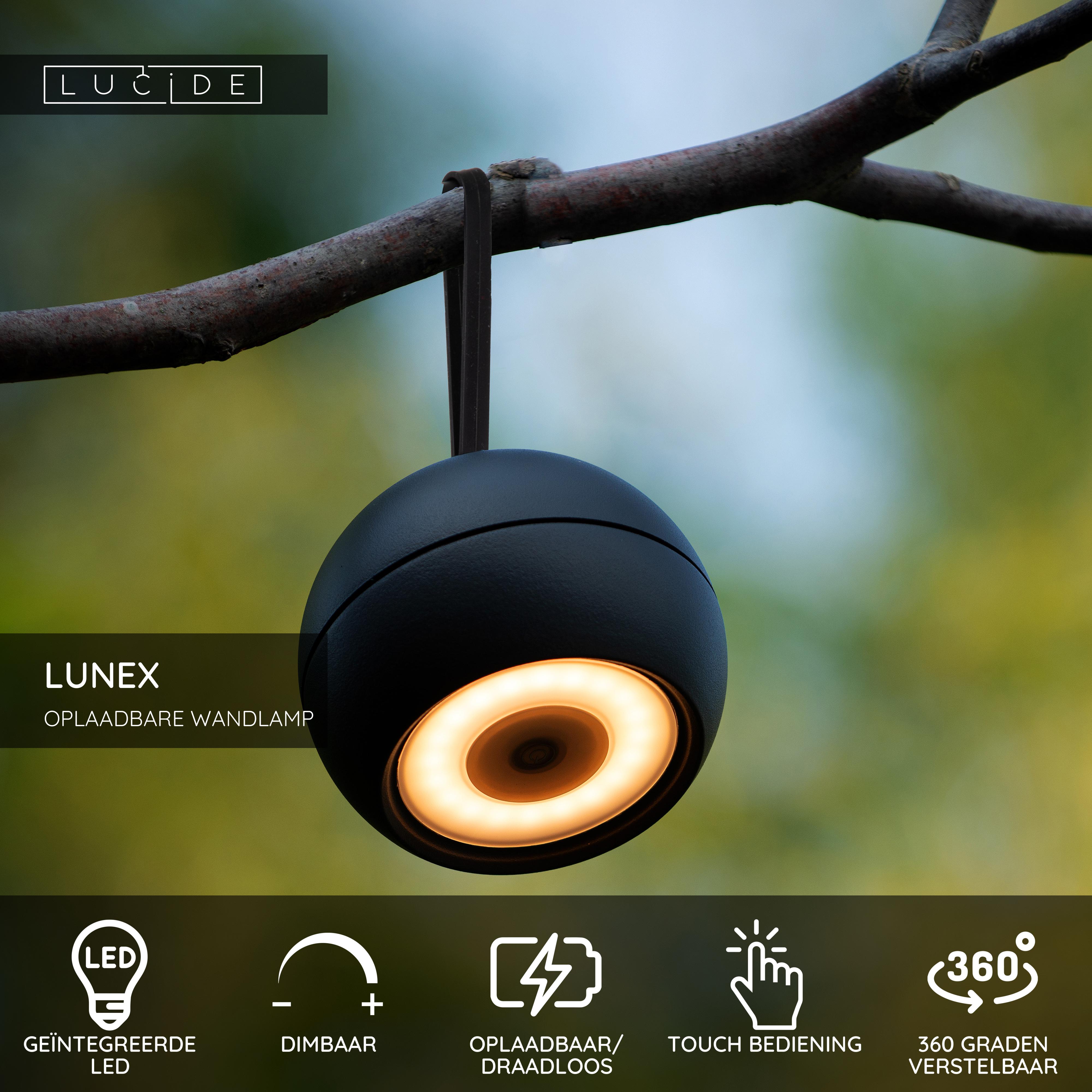 Lucide LUNEX - Oplaadbare Wandlamp Binnen/Buiten - Accu/Batterij - LED Dimb. - 1x2W 3000K - IP54 - Magnetisch - Zwart